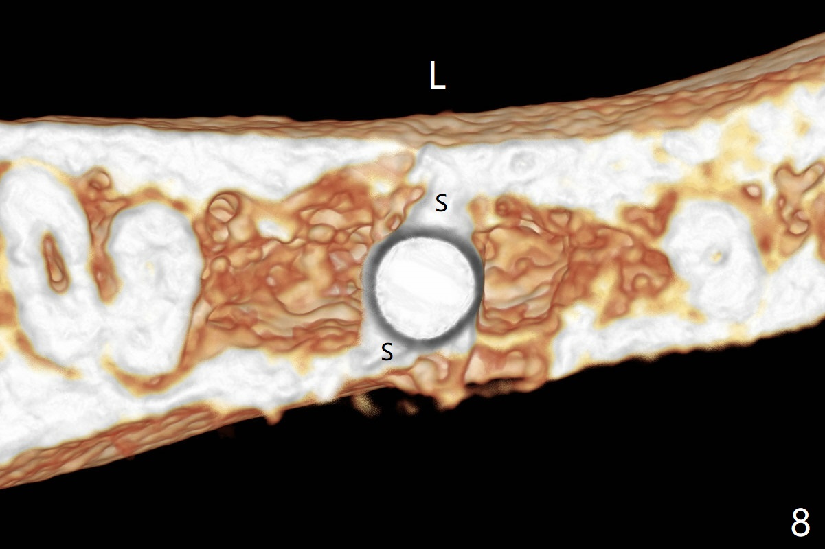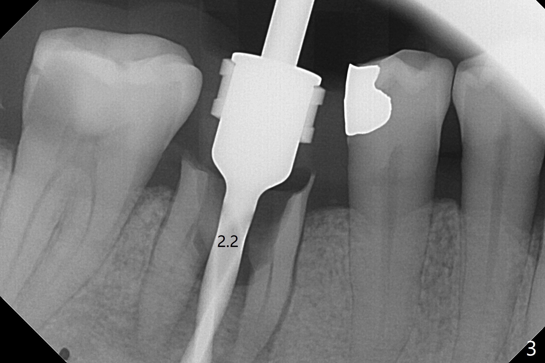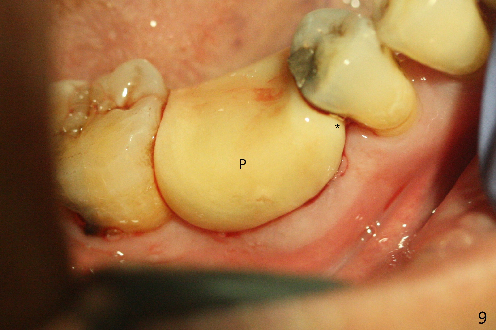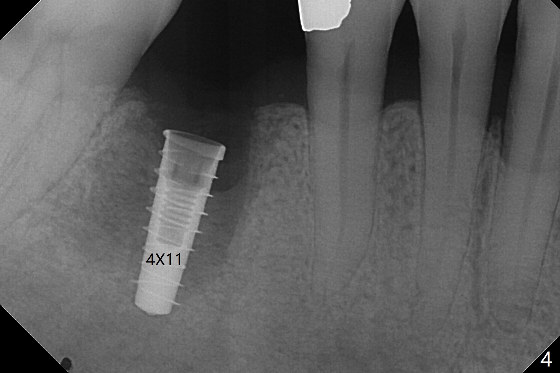 As planned, the crown of the tooth #30 with lingual (Fig.1 L) caries is removed and flattened with surgical handpiece so that the guide is able to be seated without interference. The osteotomy by 10.5 mm offset bone trimmer is lingual (Fig.2 white circle; due to in part the lingual caries and in part design error); in order to let the osteotomy to bounce back buccal, the part of the buccal roots are removed by surgical bur (arrows). The initial osteotomy by 2.2 mm drill is in the middle of the septum (Fig.3). After the last drill (3.5x11.5), the remaining roots are easily removed with proximators; a 4x11 mm dummy implant is placed with low stability and supracrestal lingual (Fig.4). Therefore a 4.5x9 mm final implant is placed with low torque. Following 4x11.5 mm drill, the torque increases to 20 Ncm. With insertion of healing screw, sticky bone (Fig.4 *: .5-1 mm cortical/cancellous allograft) is heavily packed around the implant (arrow), which apparently allows removal of the healing screw and placement of a 6x5.7(3) mm pair abutment without loosening the underlying implant. More bone graft is placed (Fig.6), followed by 2 pieces of PRF membranes. Although the implant is slightly buccally placed (Fig.7, due to over-removal of the buccal root, Fig.2 arrows), it is placed in the septum (Fig.8 S). To further compensate for the low implant stability, setting acrylic is applied in the edentulous area, particularly into the undercuts of the neighboring teeth (Fig.9 *) and around the abutment. The lingual margin of the acrylic dressing is extended (Fig.10 arrow) to cover the soft tissue defect associated with the lingual caries. As compared to the design (4x10 mm, Fig.11), the implant (4.5x9 mm, Fig.12) is placed buccal and ~ 2 mm deeper, reducing the chance of periimplantitis. The acrylic dressing is in place, but has mobility. The gingiva is healthy 2 weeks postop. The dressing is removed 1 month postop; the socket heals around the abutment buccal (Fig.13) and lingual (Fig.14). In spite of the immediate provisional, the abutment margin is substantially subgingival mesial 4 months postop, extremely difficult to take impression. A smaller diameter and longer cuff abutment is placed (Fig.15). The lingual gingiva heals normal 5 months postop, immediately before cementation (Fig.16).