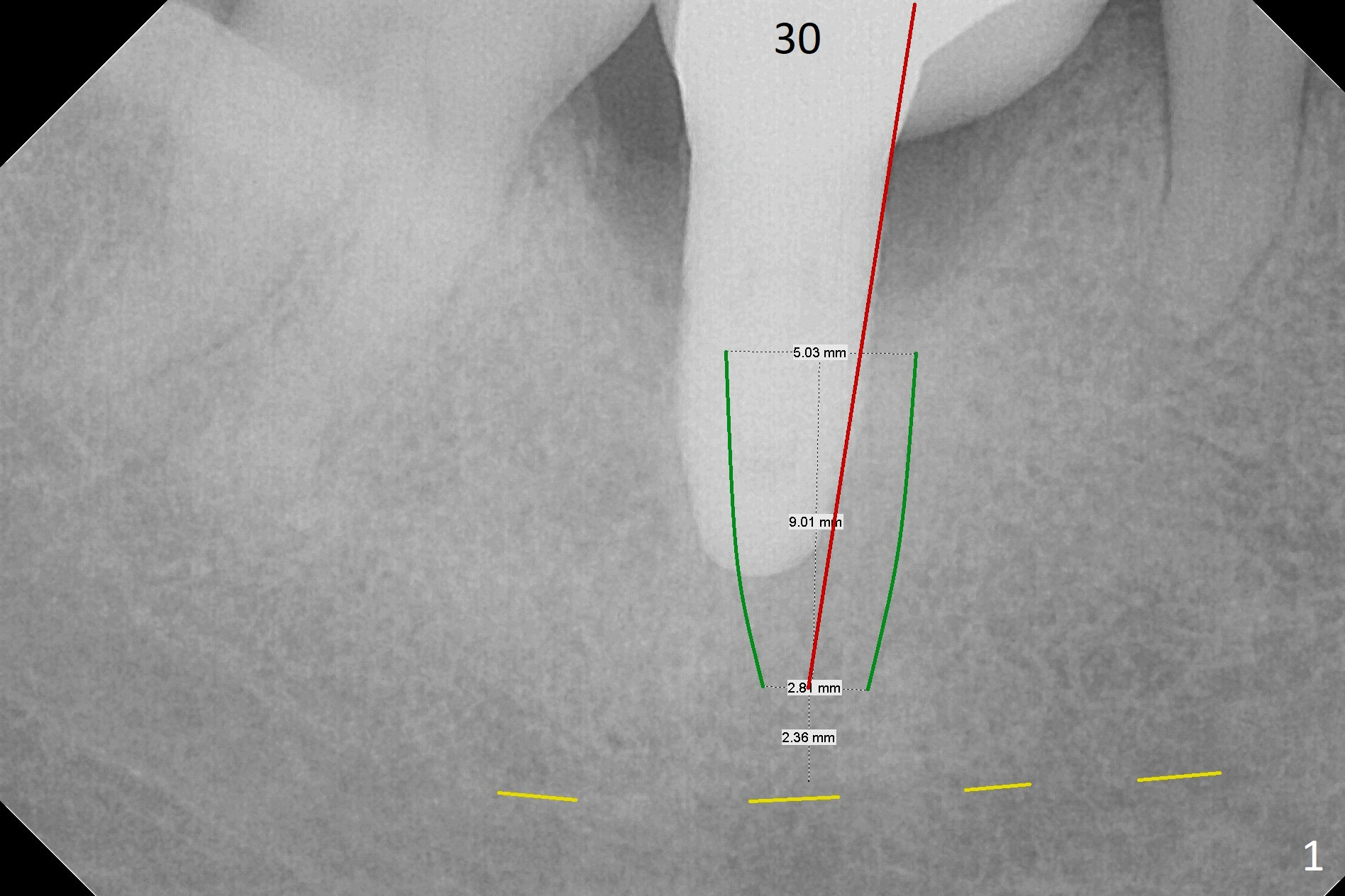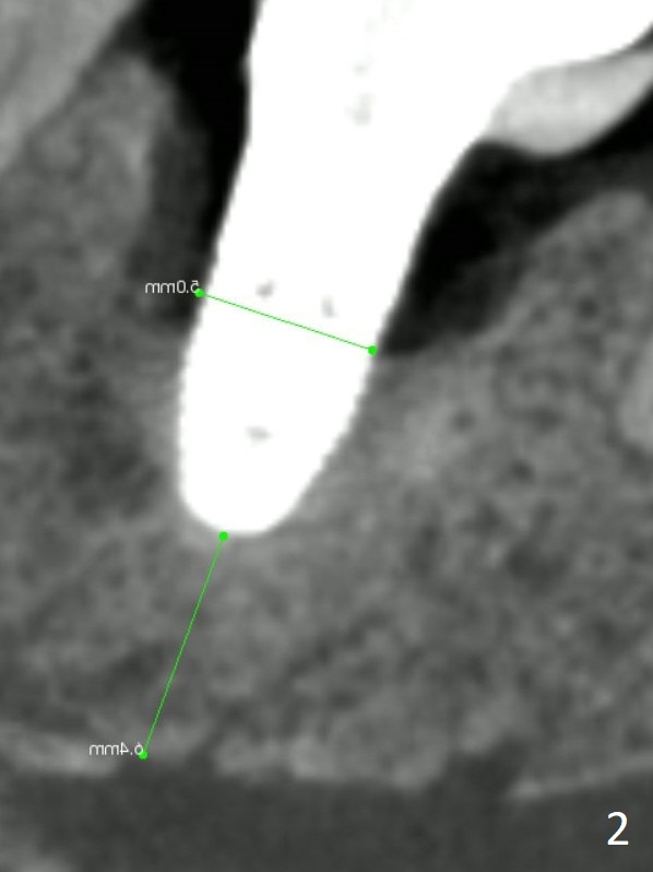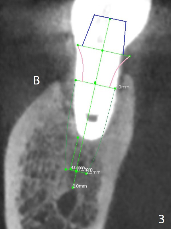 A 53-year-old woman has buccal gingival erythema and edema with deep pocket and purulent discharge. PA and CBCT show that the implant was placed distal and not deep enough (Fig.1,2) as well as buccal (Fig.3). When the failed implant is removed, try to place an implant mesiolinguoapically. Make purchase point/trough mesiolingual to the failed implant. Take PA with pilot drill for trajectory confirmation (Fig.1 red line). The implant will be 4 or 4.5 mm in diameter and 4 mm in the native apical bone. Use 1.6 and 3.8x11 mm Magic Drill until the lingual crest. Place PRF over the bone graft, Cyotplast buccally and provisional. Lower Molar Immediate Implant, Prevent Molar Periimplantitis (Protocols, Table), Armaments, #19 Xin Wei, DDS, PhD, MS 1st edition 12/10/2017, last revision 09/15/2020