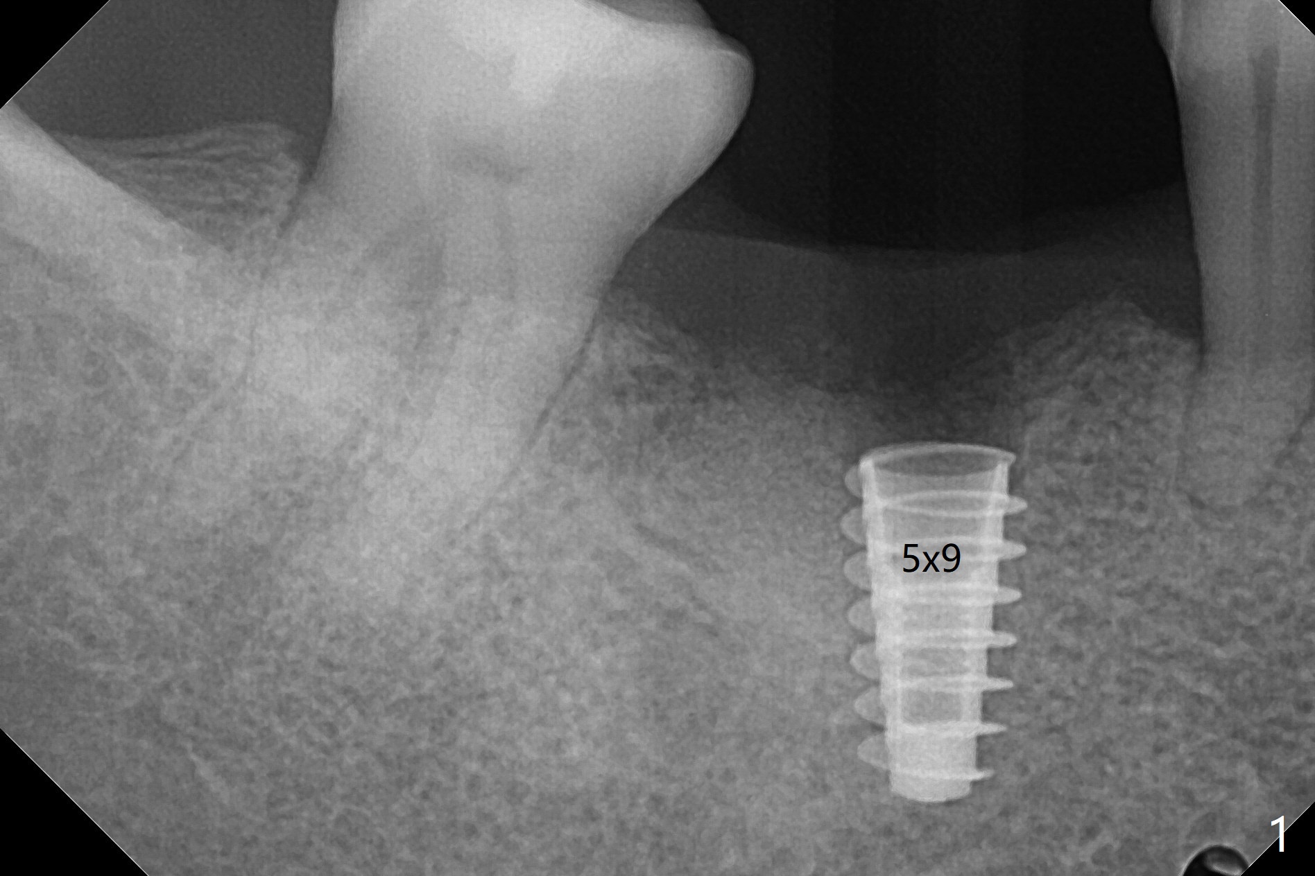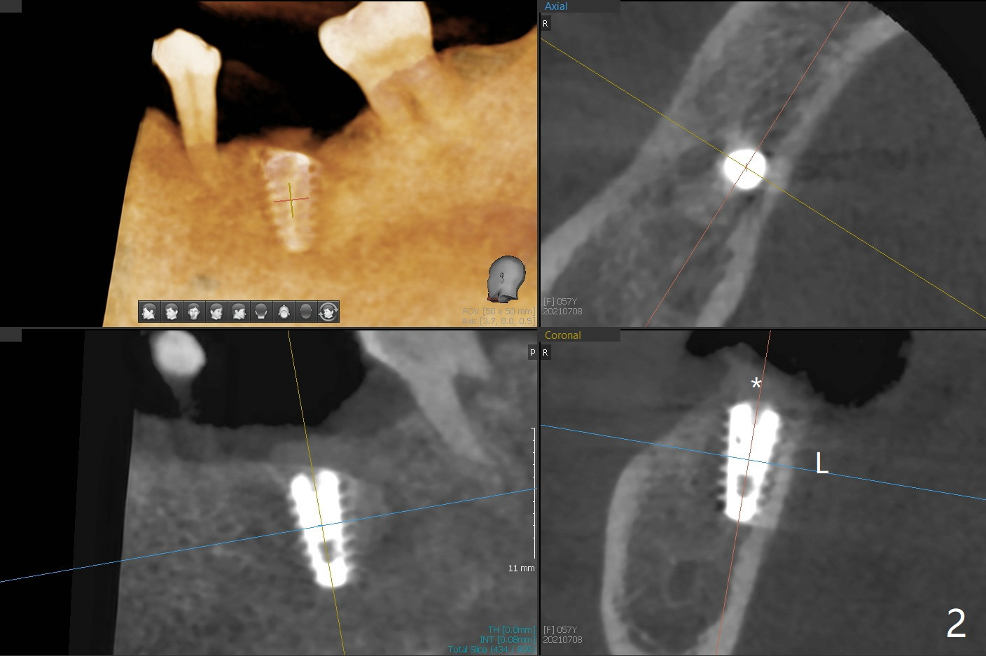 植体取出植骨后十个月,几乎按照导板顺序(除了4.5x10, 4x11.5毫米钻头),植入5x9毫米植体第二条线上缘,植体舌侧好像在牙槽嵴上(图一),临床上植体偏舌侧。放置愈合帽后,置入自体骨,往舌侧塞(图二:*),覆盖GEM Cap,牙周胶水固定,最后牙周敷料。其实植体舌侧偏移不是太多。