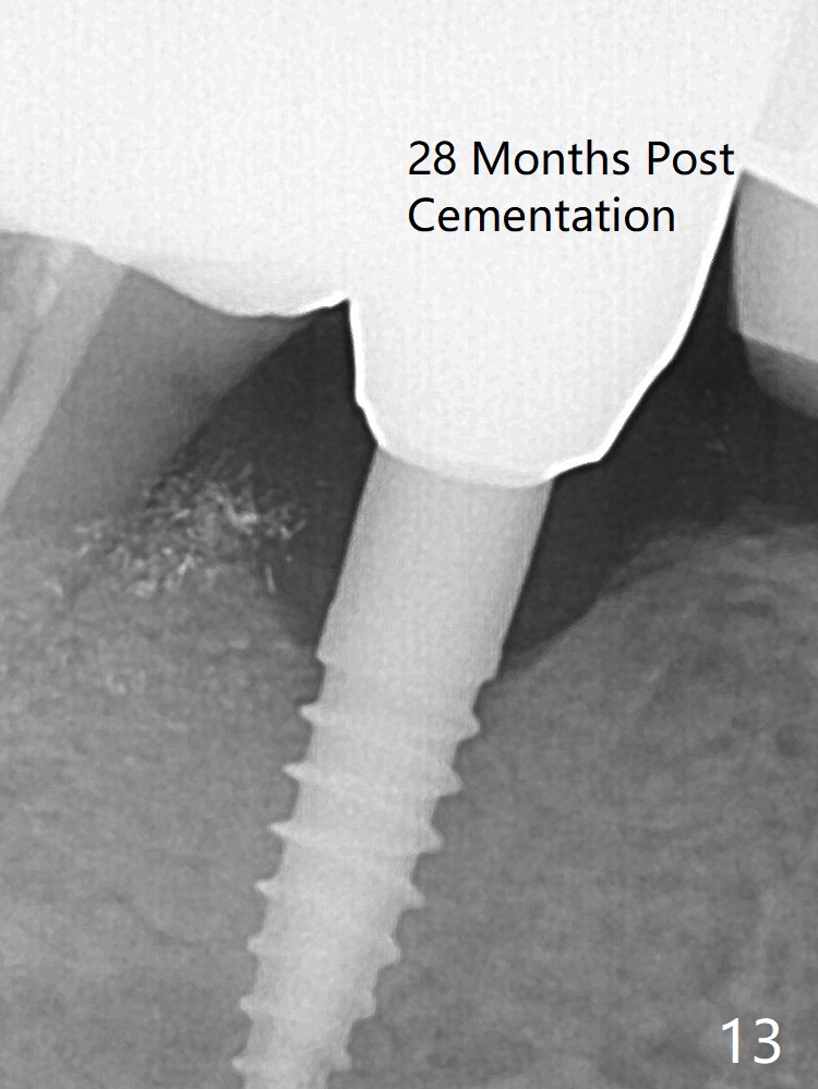 In fact the crown at #30 is redone because of loose proximal contact with #31; there is no bone resorption 13 months post cementation (Fig.11). Bone resorption remains unnoticeable 28 months post cementation (Fig.13). The crestal bone loss is observed 3 months postop (Fig.6 arrowheads), as related to ridge reduction (cortical bone). Since then, there has been no bone resorption.