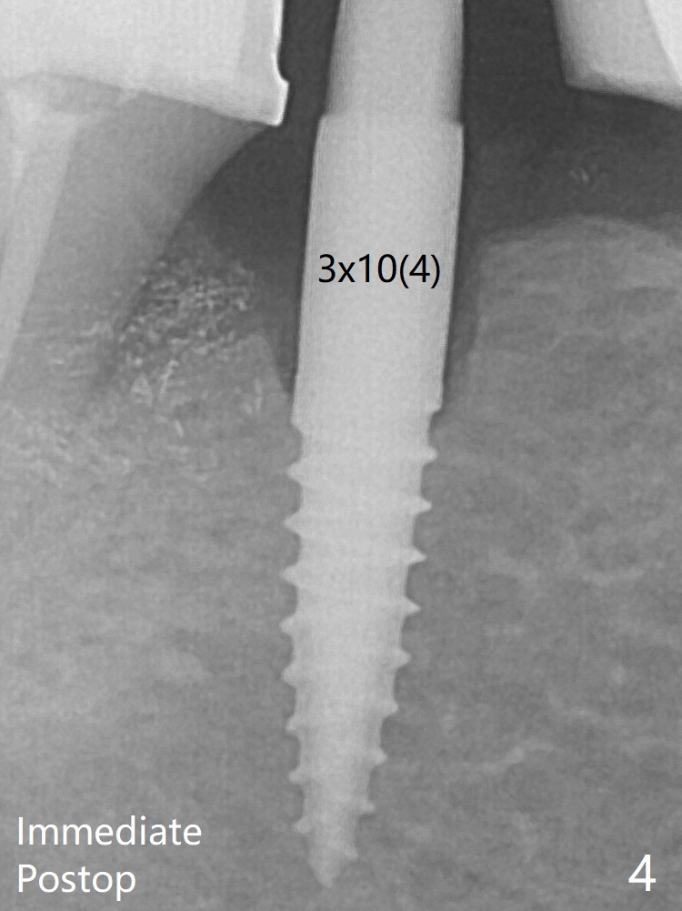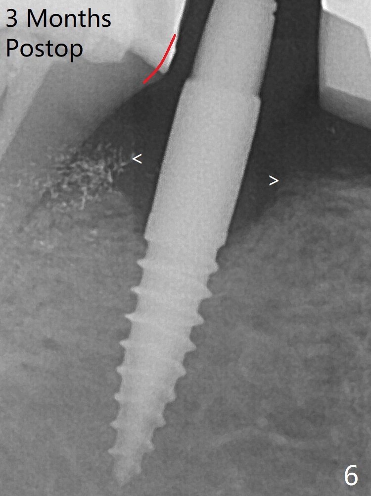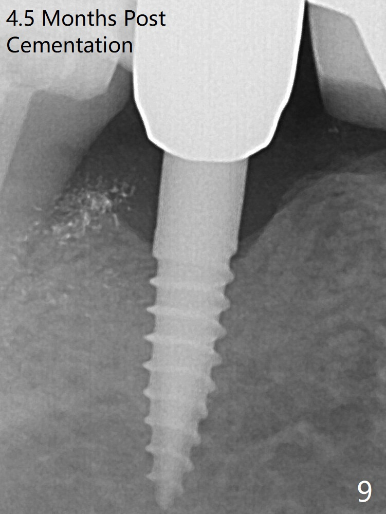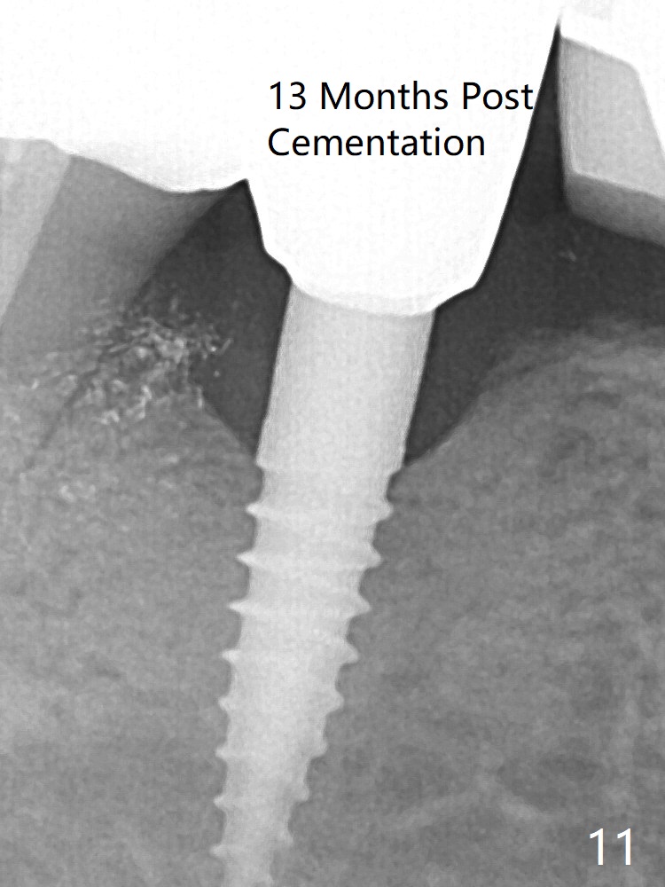 In fact the crown at #30 is redone because of loose proximal contact with #31; there is no bone resorption 13 months post cementation (Fig.11). The crestal bone loss is observed 3 months postop (Fig.6 arrowheads), as related to ridge reduction (cortical bone). Since then, there has been no bone resorption.