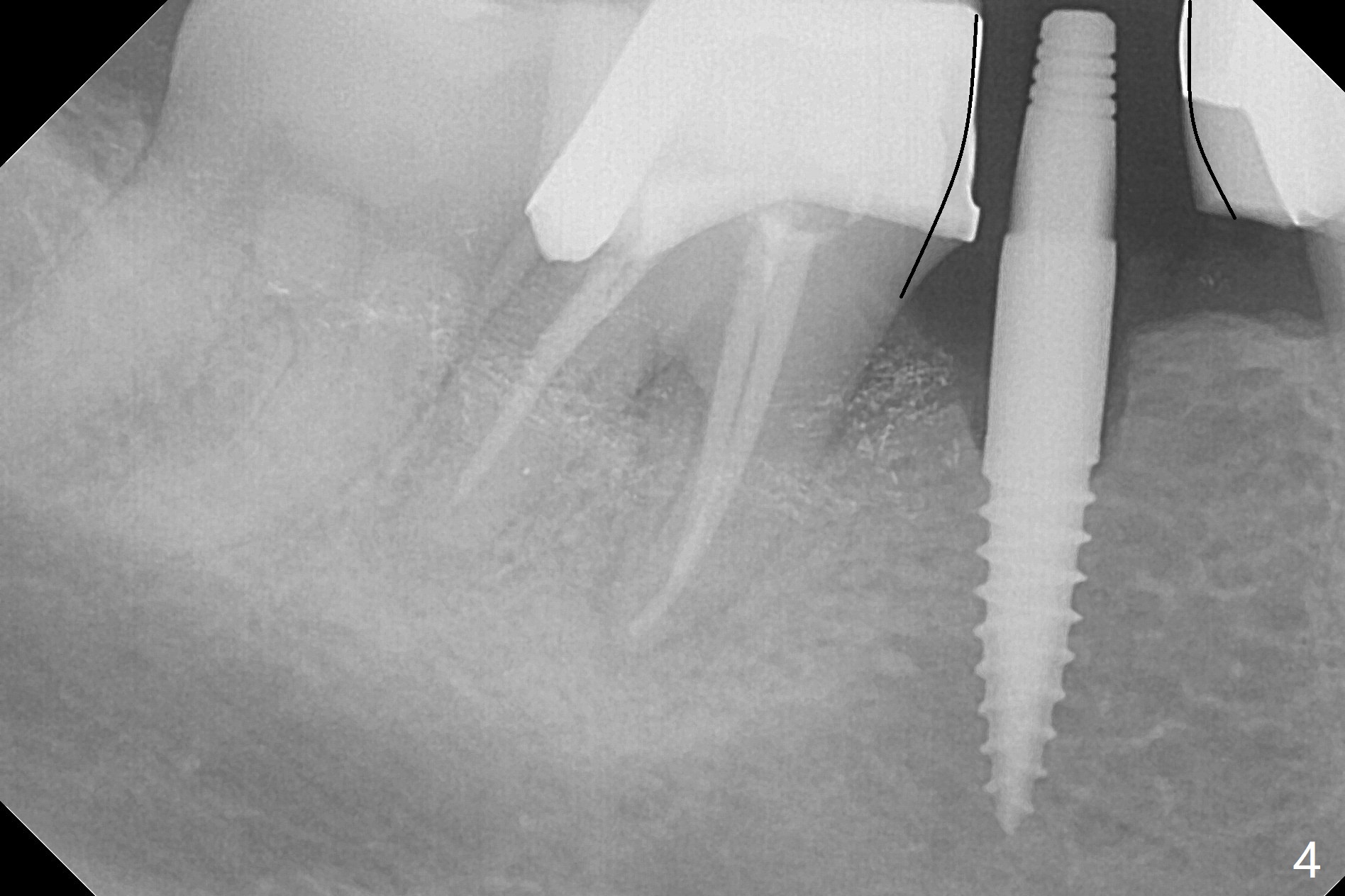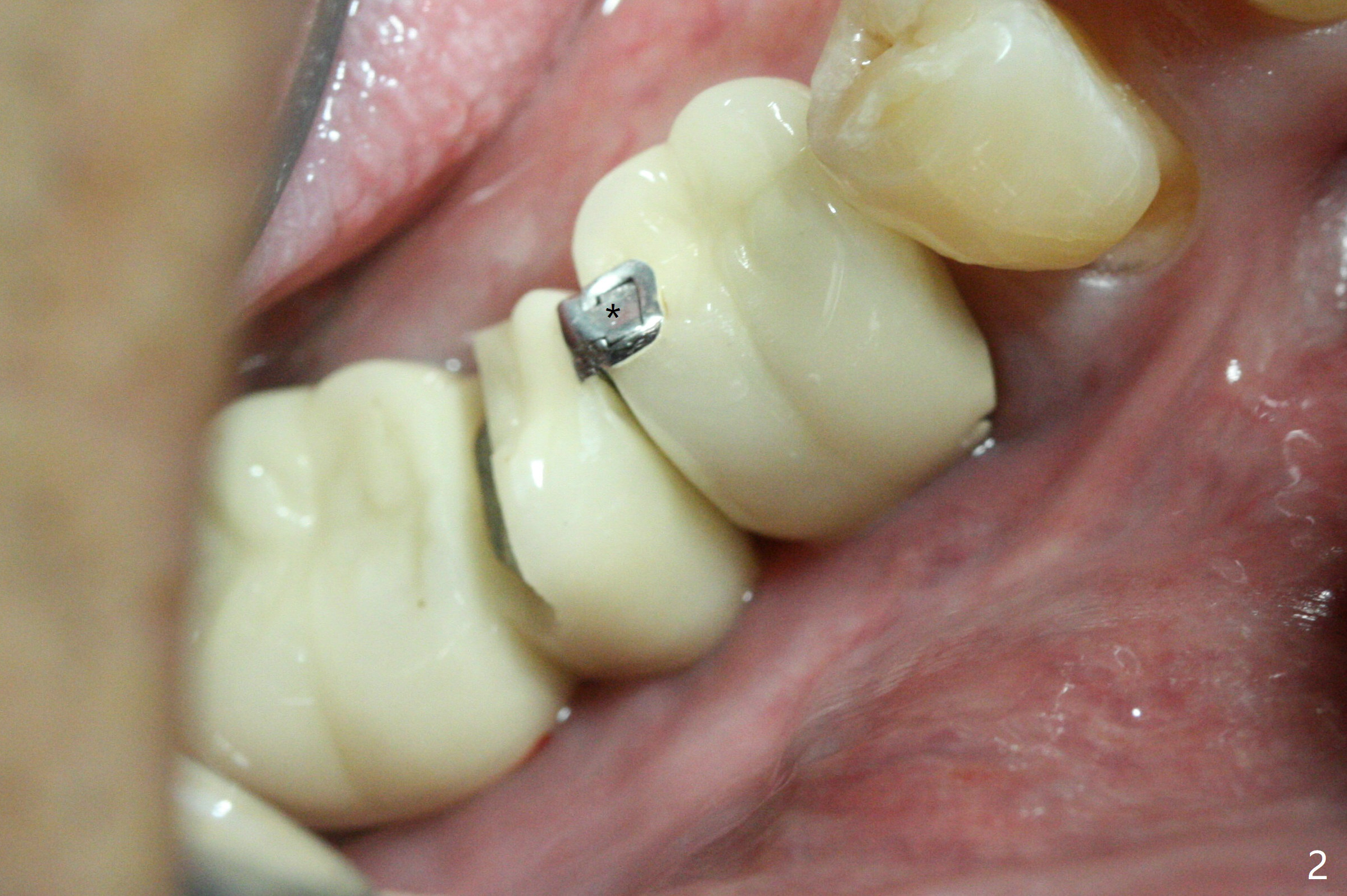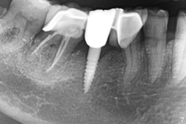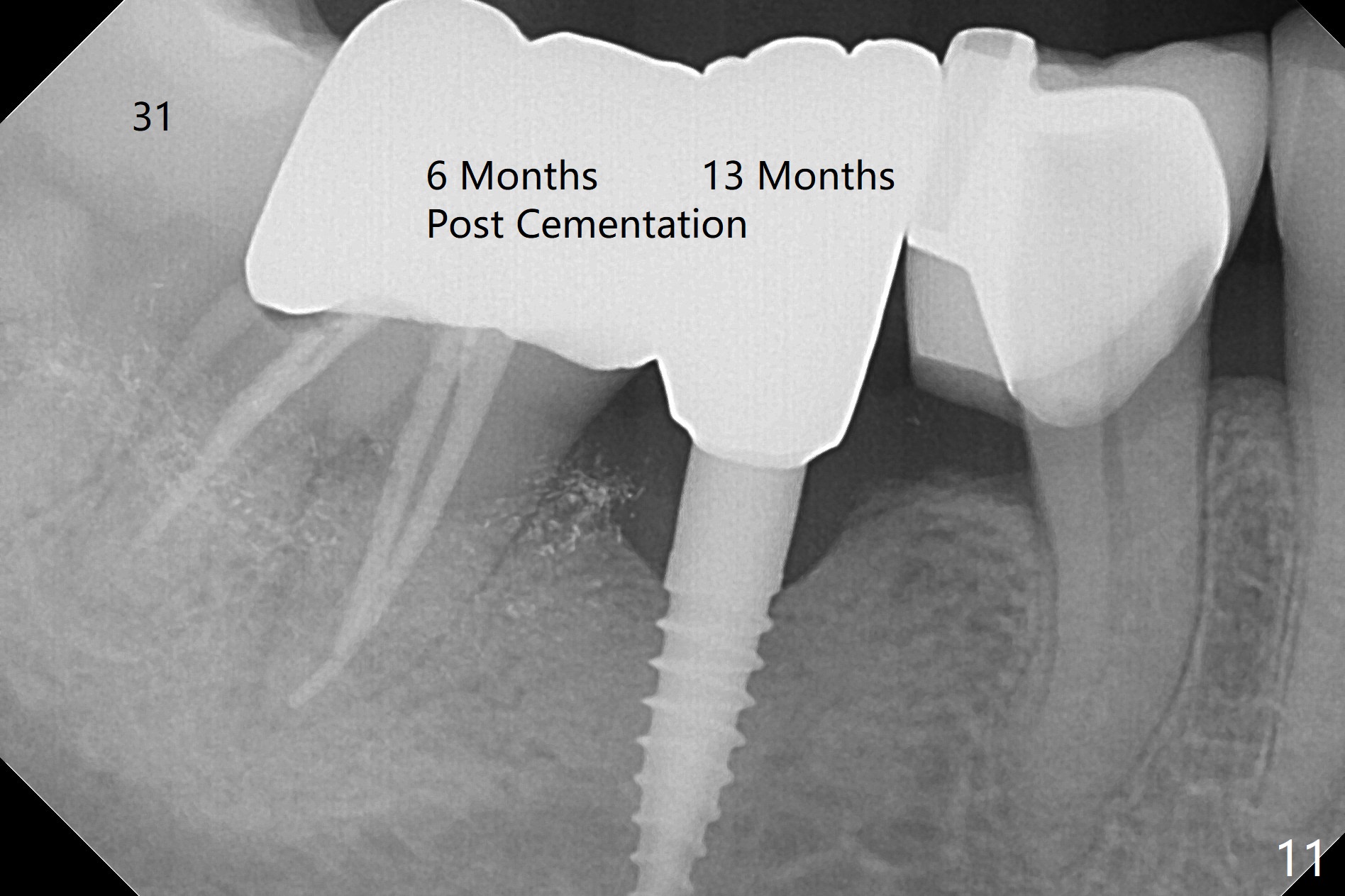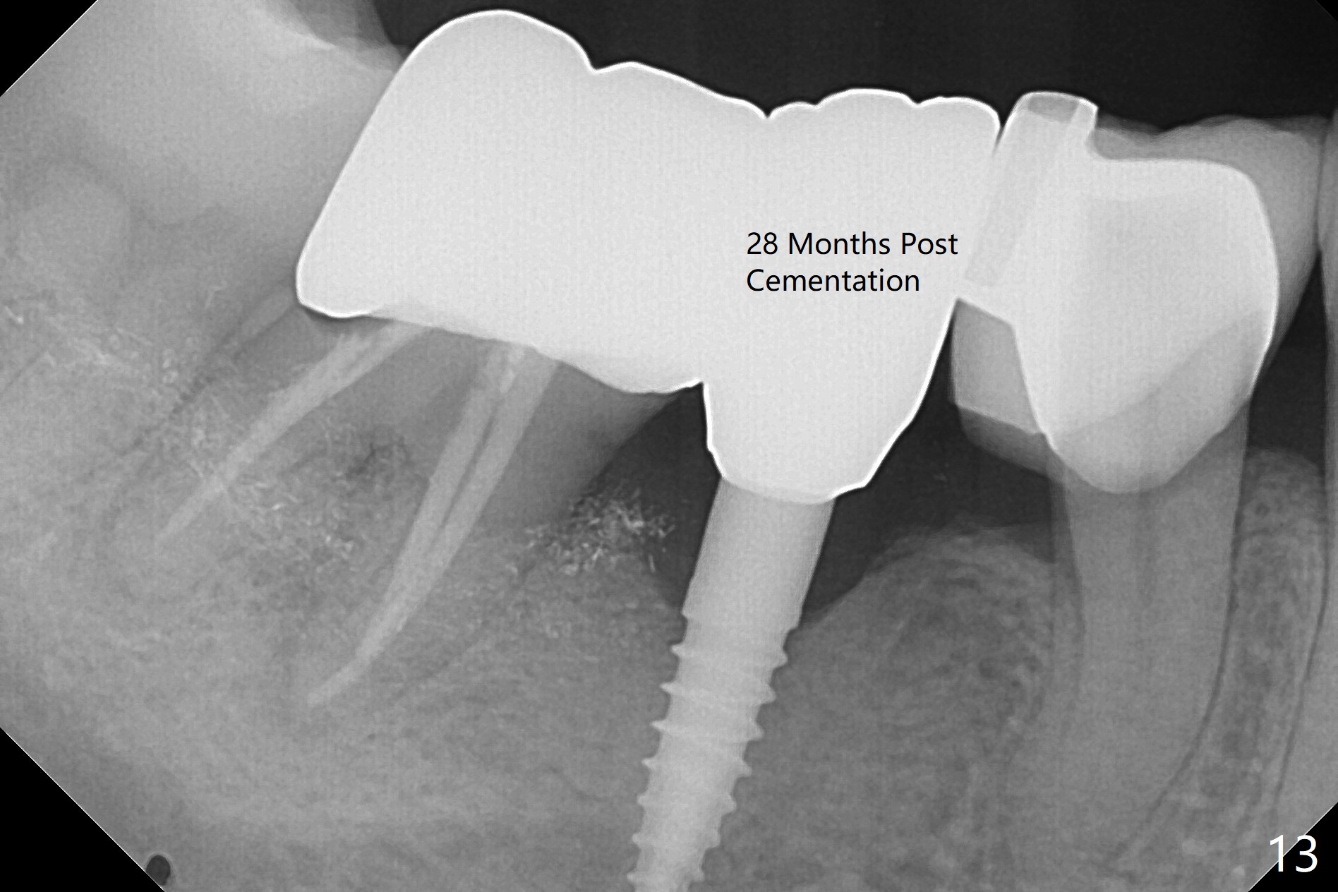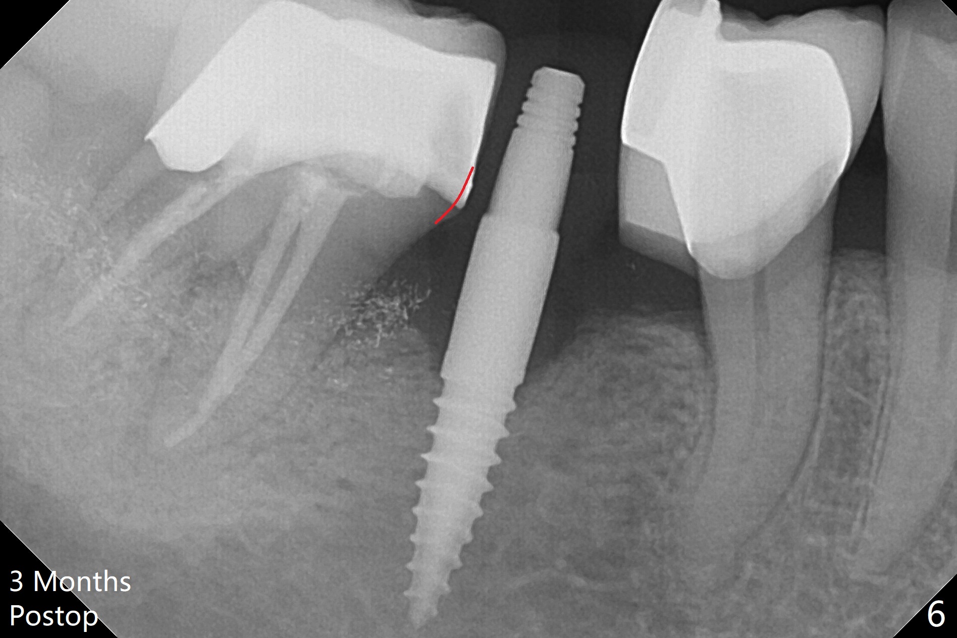 There is a space underneath the pontic at #30 (Fig.1 *), the basis for food impaction. After sectioning between the pontic and the posterior retainer, the pontic is removed from the anterior retainer with an attachment (Fig.2 *). The initial depth of osteotomy is 10 mm following ridge top reduction (Fig.3). A 3x10(4) mm 1-piece implant is placed with >50 Ncm; to reduce possibility of crown dislodgement from the implant, the retainers will be kept with modification of the proximal surfaces as shown by curved lines in Fig.4. Periodontal dressing is applied after suturing. There is no postop paresthesia. The periodontal dressing remains in place 2 weeks postop because of engagement into the attachment slot and undercuts (Fig.5). The patient returns 3 months postop; after minor contour adjustment (Fig.6 red curved line), impression is taken. The permanent crown is temporarily cemented (3.5 months postop) in case of food impaction due to the distal overhang of the tooth #29 (Fig.7). In fact the patient returns 4.5 months post cementation with right TMD (muscle relaxant prescribed) and food impaction, although there is no bone resorption (Fig.8,9). It appears that the crown at #29 needs to be redone, while porcelain will be added to the mesial surface of the one at #30 (Fig.10 red lines). In fact the crown at #30 is redone because of loose proximal contact with #31; there is no bone resorption 13 months post cementation (Fig.11). Bone resorption remains unnoticeable 28 months post cementation (Fig.12,13).