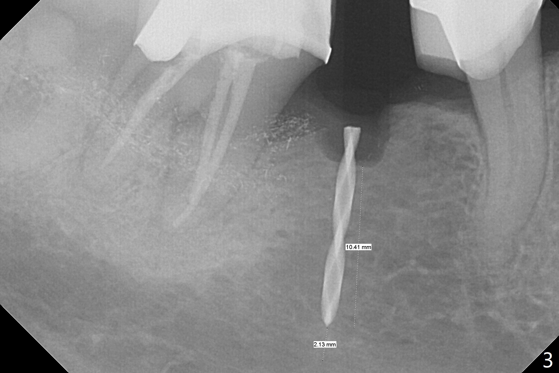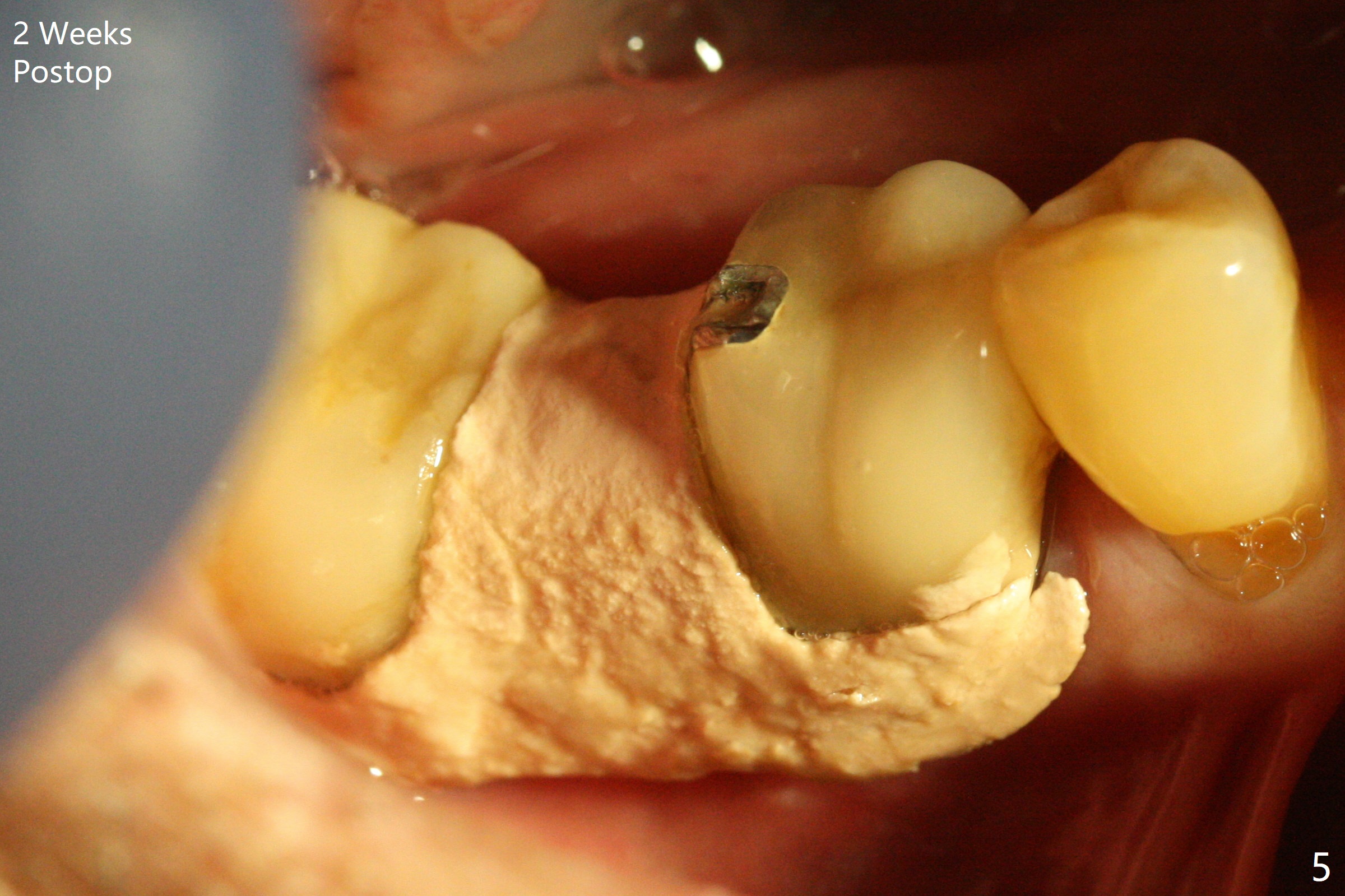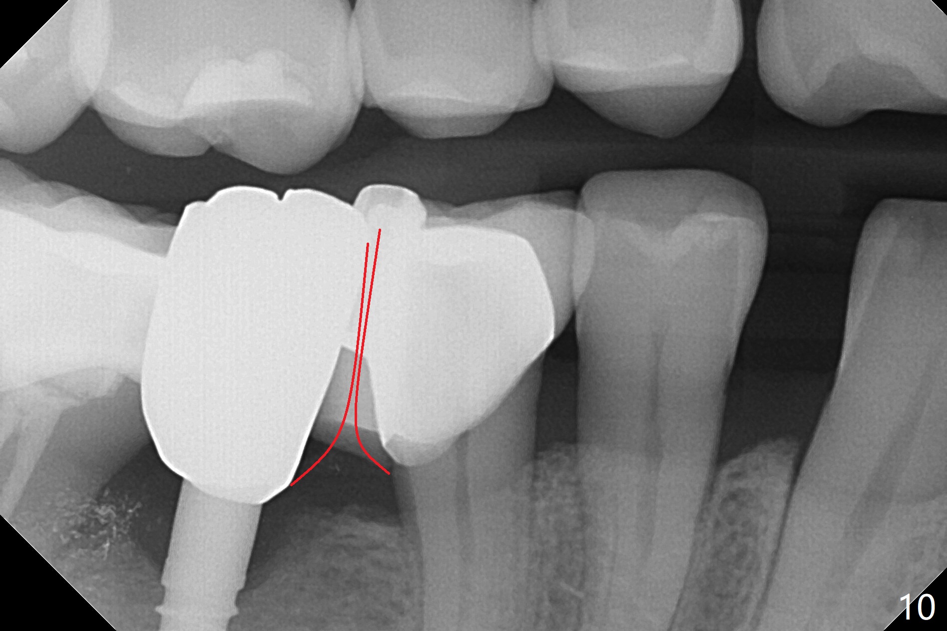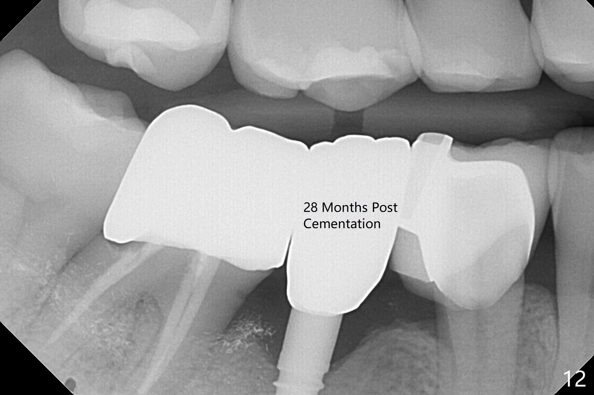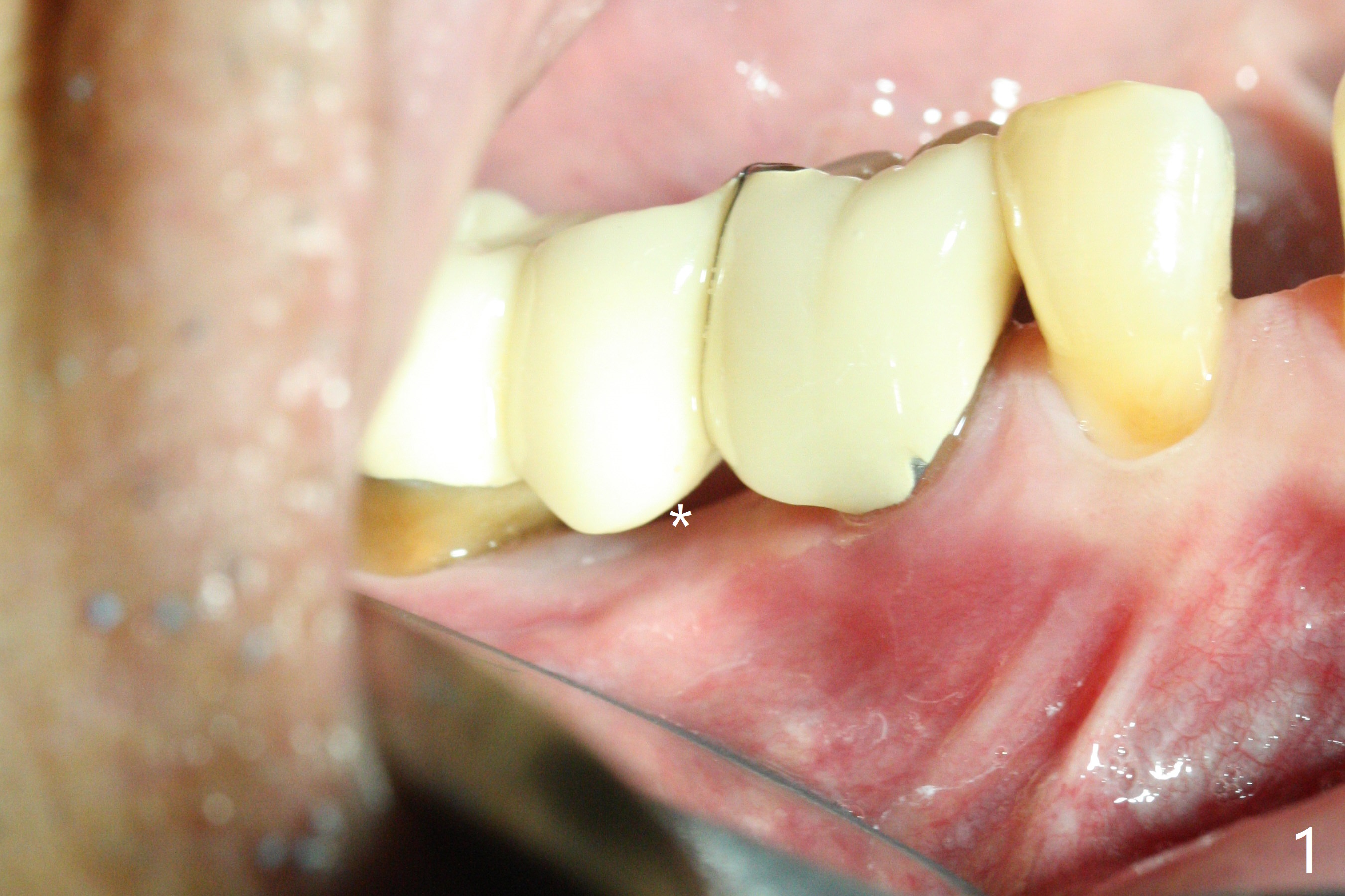 There is a space underneath the pontic at #30 (Fig.1 *), the basis for food impaction. After sectioning between the pontic and the posterior retainer, the pontic is removed from the anterior retainer with an attachment (Fig.2 *). The initial depth of osteotomy is 10 mm following ridge top reduction (Fig.3). A 3x10(4) mm 1-piece implant is placed with >50 Ncm; to reduce possibility of crown dislodgement from the implant, the retainers will be kept with modification of the proximal surfaces as shown by curved lines in Fig.4. Periodontal dressing is applied after suturing. There is no postop paresthesia. The periodontal dressing remains in place 2 weeks postop because of engagement into the attachment slot and undercuts (Fig.5). The patient returns 3 months postop; after minor contour adjustment (Fig.6 red curved line), impression is taken. The permanent crown is temporarily cemented (3.5 months postop) in case of food impaction due to the distal overhang of the tooth #29 (Fig.7). In fact the patient returns 4.5 months post cementation with right TMD (muscle relaxant prescribed) and food impaction, although there is no bone resorption (Fig.8,9). It appears that the crown at #29 needs to be redone, while porcelain will be added to the mesial surface of the one at #30 (Fig.10 red lines). In fact the crown at #30 is redone because of loose proximal contact with #31; there is no bone resorption 13 months post cementation (Fig.11). Bone resorption remains unnoticeable 28 months post cementation (Fig.12,13).
