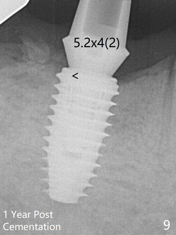 To reduce heat-induced bone necrosis at #19, osteotomy is conducted slowly with copious irrigation with cold saline. Bone density is felt while a 5x10 mm implant is being placed after using cortical tap to the 2nd line of the implant driver. The implant needs to be reverse torqued several times before reaching its final depth (Fig.1 (~50 Ncm)). Since the residual roots are superficially positioned, the immediate implant looks as a delayed one. Although the implant is placed mesial to the septum clinically, its position in X-ray seems to be normal. Because of severe wear and lack of vertical height, a 6.8x5 mm healing abutment is placed. Retention of bone graft placed in the distal socket (Fig.1 *) is maintained by spreading setting acrylic into the edentulous undercut areas. The bone graft placed in the distal socket appears to have been converted to the native bone 3.5 months and 4 months postop (Fig.4,6). There is no bone loss 5 months post cementation, although the abutment screw has been loose (Fig.7). The patient complains of food impaction nearly 1 year post cementation. The mesial and distal contacts of #30 crowns are light. When the abutment/crown is removed, there is implant well contamination (food debris). It appears that the previous abutment (5.7x4(2) mm, Fig.6,7) is incompletely seated. When a smaller abutment is placed and torqued at 30 Ncm, it is seated fully (Fig.9 (<: no gap)). New impression is taken. If there is food impaction distal to the new crown, the distal crestal bone should be removed with lab closure of the embrasure.