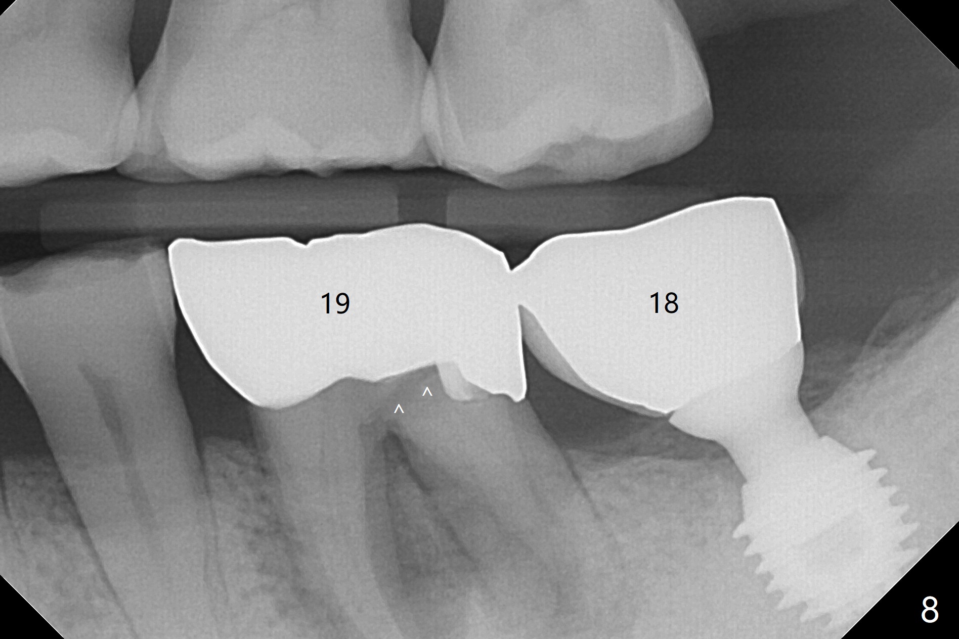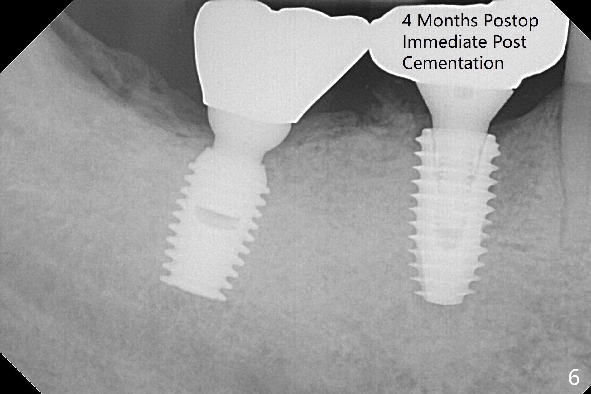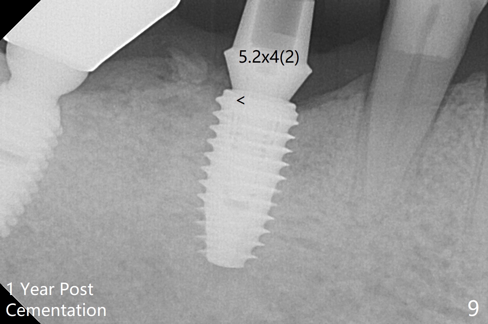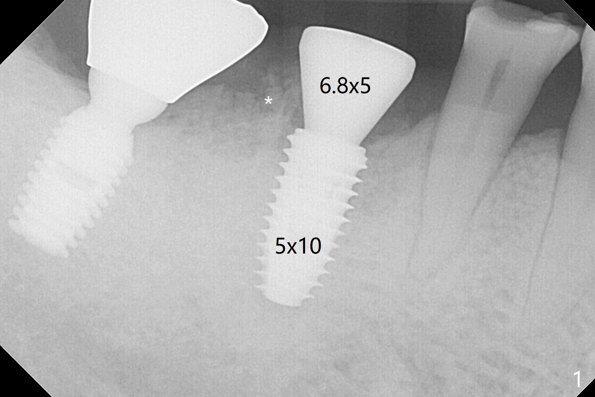 Vertical fracture of the mesial root of the tooth #30 after RCT is associated with bone loss (Fig.00 *). When the mesial portion of the mesial root (M', loose one) is exfoliated, the bone loss resolves (Fig.0). To reduce heat-induced bone necrosis at #19, osteotomy is conducted slowly with copious irrigation with cold saline. Bone density is felt while a 5x10 mm implant is being placed after using cortical tap to the 2nd line of the implant driver. The implant needs to be reverse torqued several times before reaching its final depth (Fig.1 (~50 Ncm)). Since the residual roots are superficially positioned, the immediate implant looks as a delayed one. Although the implant is placed mesial to the septum clinically, its position in X-ray seems to be normal. Because of severe wear and lack of vertical height, a 6.8x5 mm healing abutment is placed. Retention of bone graft (Fig.1 *) is maintained by spreading setting acrylic into the edentulous undercut areas (Fig.2 *). The so called "acrylic dressing" remains in place 3 weeks postop (Fig.8). When it is removed with the healing abutment, the wound heals (Fig.3). Note the limited vertical height. The bone graft placed in the distal socket appears to have been converted to the native bone 3.5 months postop (Fig.4). To reduce severe wear of the natural teeth, the occlusion of the new crown is not heavily decreased (Fig.5). It should be alright considering favorable crown/implant ratio (Fig.6). There is no bone loss 5 months post cementation, although the abutment screw is just retightened (Fig.7). In spite of poor trajectory associated with #18 (Fig.8) and 31 (Fig.7) Bicon implants, the abutments have not been dislodged. For the bruxer, the next implant at #19 with distal root fracture (Fig.8 ^) should be Bicon. The patient complains of food impaction nearly 1 year post cementation. The mesial and distal contacts of #30 crowns are light. When the abutment/crown is removed, there is implant well contamination (food debris). It appears that the previous abutment (5.7x4(2) mm, Fig.6,7) is incompletely seated. When a smaller abutment is placed and torqued at 30 Ncm, it is seated fully (Fig.9 (<: no gap)). New impression is taken. The distal gingival embrasure is larger than the mesial one because of the higher distal crest (Fig.6,7). If there is food impaction distal to the new crown, the distal crestal bone should be removed with lab closure of the embrasure.