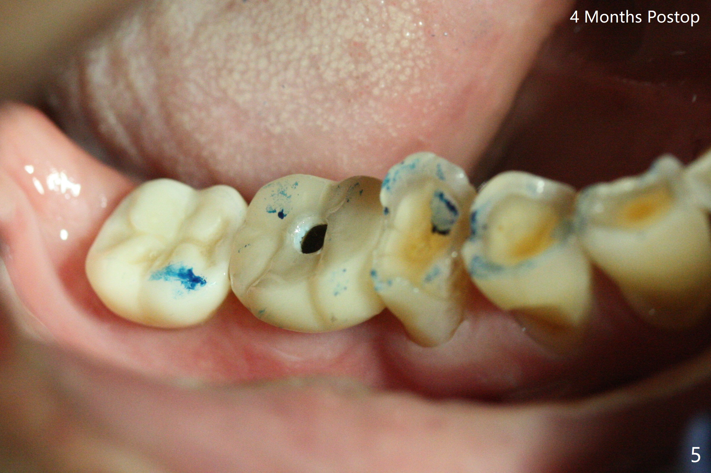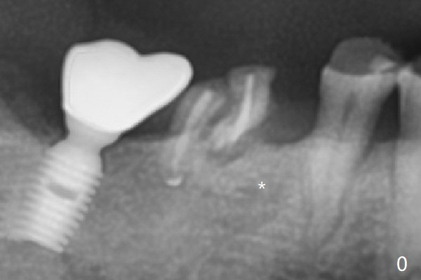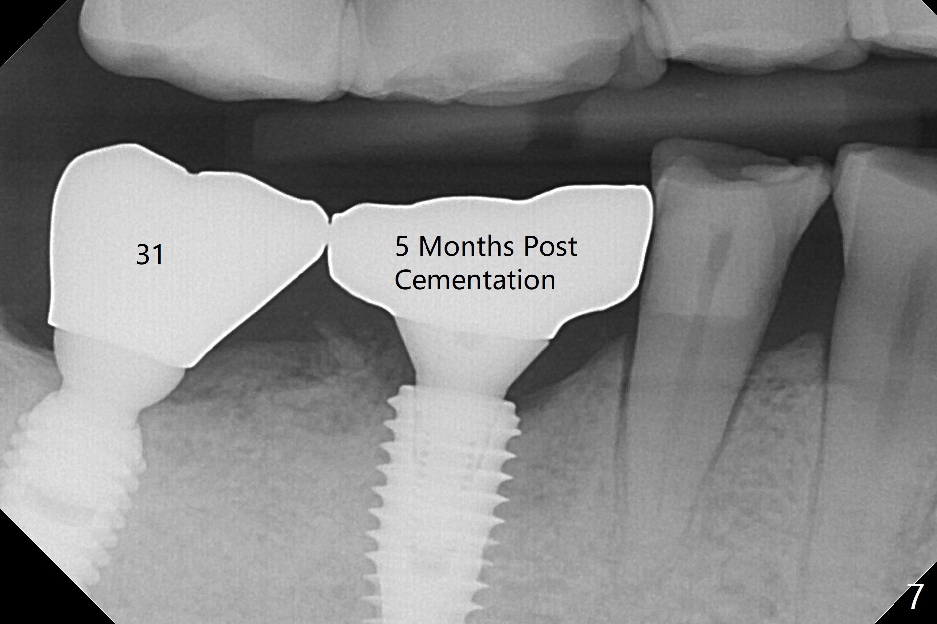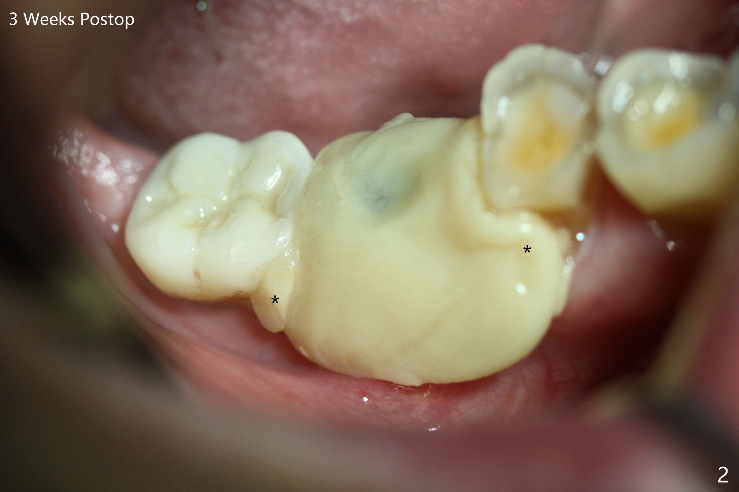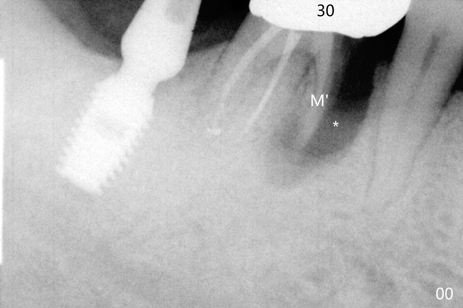 Vertical fracture of the mesial root of the tooth #30 after RCT is associated with bone loss (Fig.00 *). When the mesial portion of the mesial root (M', loose one) is exfoliated, the bone loss resolves (Fig.0). To reduce heat-induced bone necrosis at #19, osteotomy is conducted slowly with copious irrigation with cold saline. Bone density is felt while a 5x10 mm implant is being placed after using cortical tap to the 2nd line of the implant driver. The implant needs to be reverse torqued several times before reaching its final depth (Fig.1 (~50 Ncm)). Since the residual roots are superficially positioned, the immediate implant looks as a delayed one. Although the implant is placed mesial to the septum clinically, its position in X-ray seems to be normal. Because of severe wear and lack of vertical height, a 6.8x5 mm healing abutment is placed. Retention of bone graft (Fig.1 *) is maintained by spreading setting acrylic into the edentulous undercut areas (Fig.2 *). The so called "acrylic dressing" remains in place 3 weeks postop (Fig.8). When it is removed with the healing abutment, the wound heals (Fig.3). Note the limited vertical height. The bone graft placed in the distal socket appears to have been converted to the native bone 3.5 months postop (Fig.4). To reduce severe wear of the natural teeth, the occlusion of the new crown is not heavily decreased (Fig.5). It should be alright considering favorable crown/implant ratio (Fig.6). There is no bone loss 5 months post cementation, although the abutment screw is just retightened (Fig.7). In spite of poor trajectory associated with #18 (Fig.8) and 31 (Fig.7) Bicon implants, the abutments have not been dislodged. For the bruxer, the next implant at #19 with distal root fracture (Fig.8 ^) should be Bicon. The patient complains of food impaction nearly 1 year post cementation. The mesial and distal contacts of #30 crowns are light. When the abutment/crown is removed, there is implant well contamination (food debris). It appears that the previous abutment (5.7x4(2) mm, Fig.6,7) is incompletely seated. When a smaller abutment is placed and torqued at 30 Ncm, it is seated fully (Fig.9 (<: no gap)). New impression is taken. The distal gingival embrasure is larger than the mesial one because of the higher distal crest (Fig.6,7). If there is food impaction distal to the new crown, the distal crestal bone should be removed with lab closure of the embrasure.