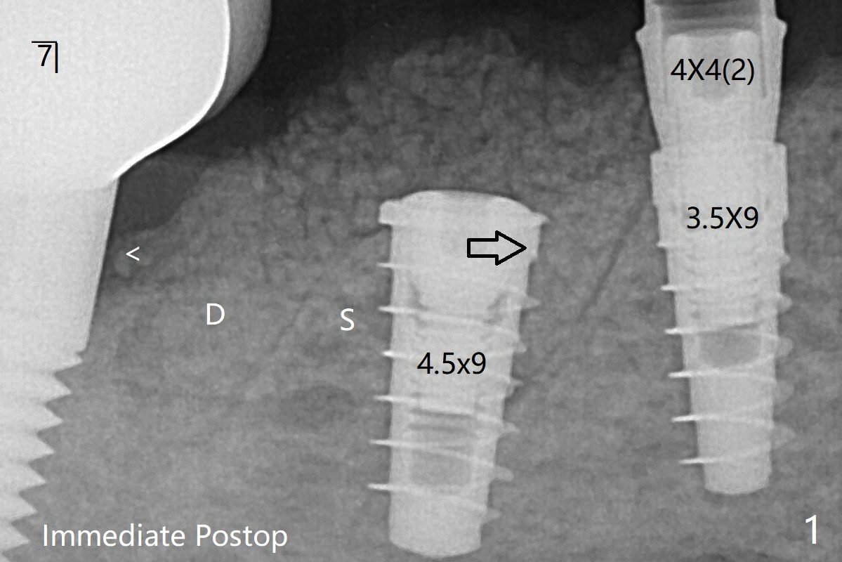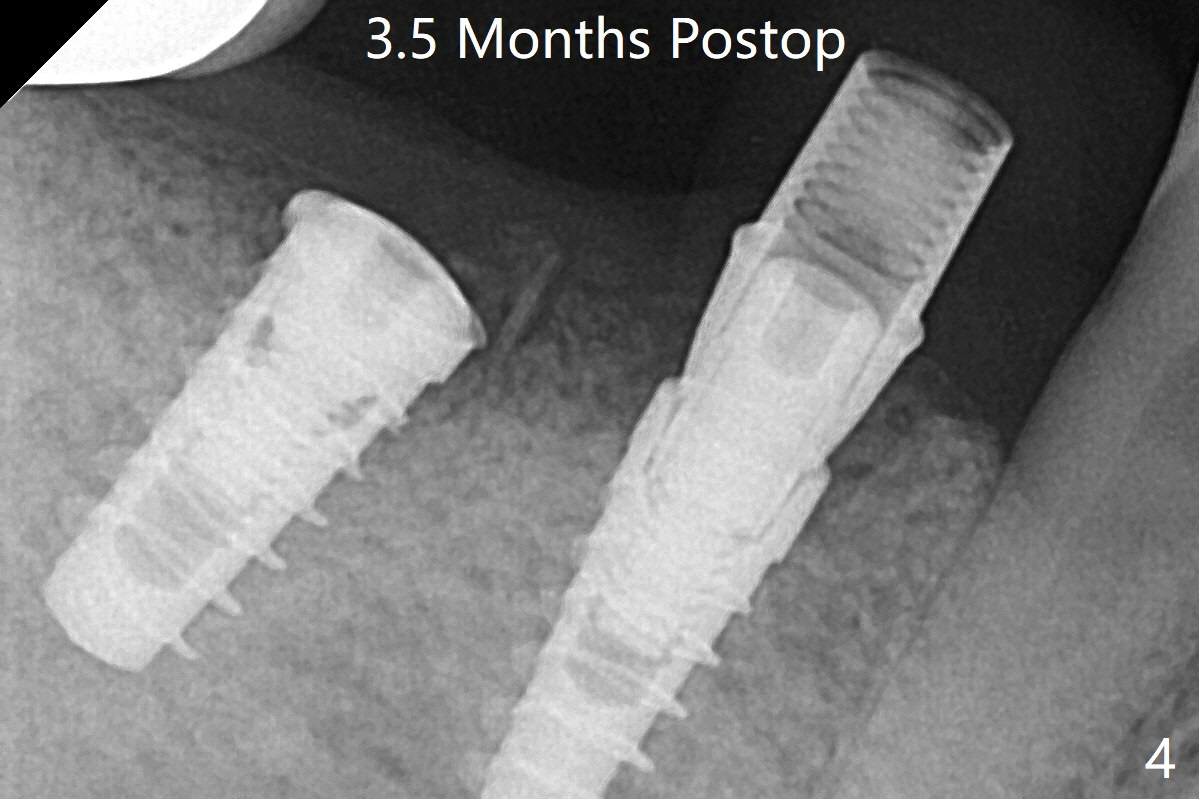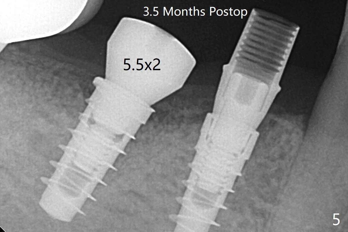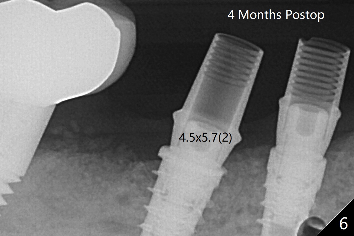 术后四个月6放置基台后(图六),制作连体5,6牙冠,垫高(打开咬合),近中衬里,推4,关闭3,4之间间隙(图三)。6植体远中第一个螺纹好像暴露。