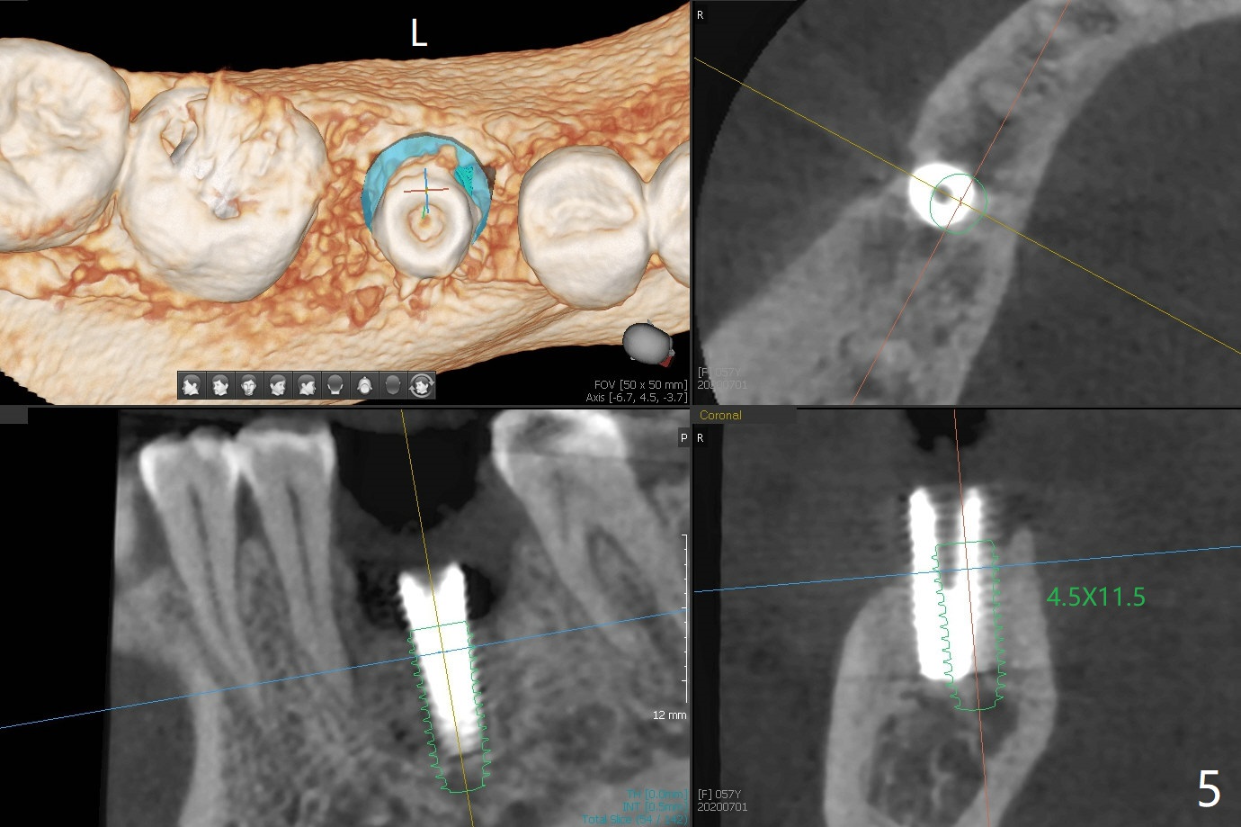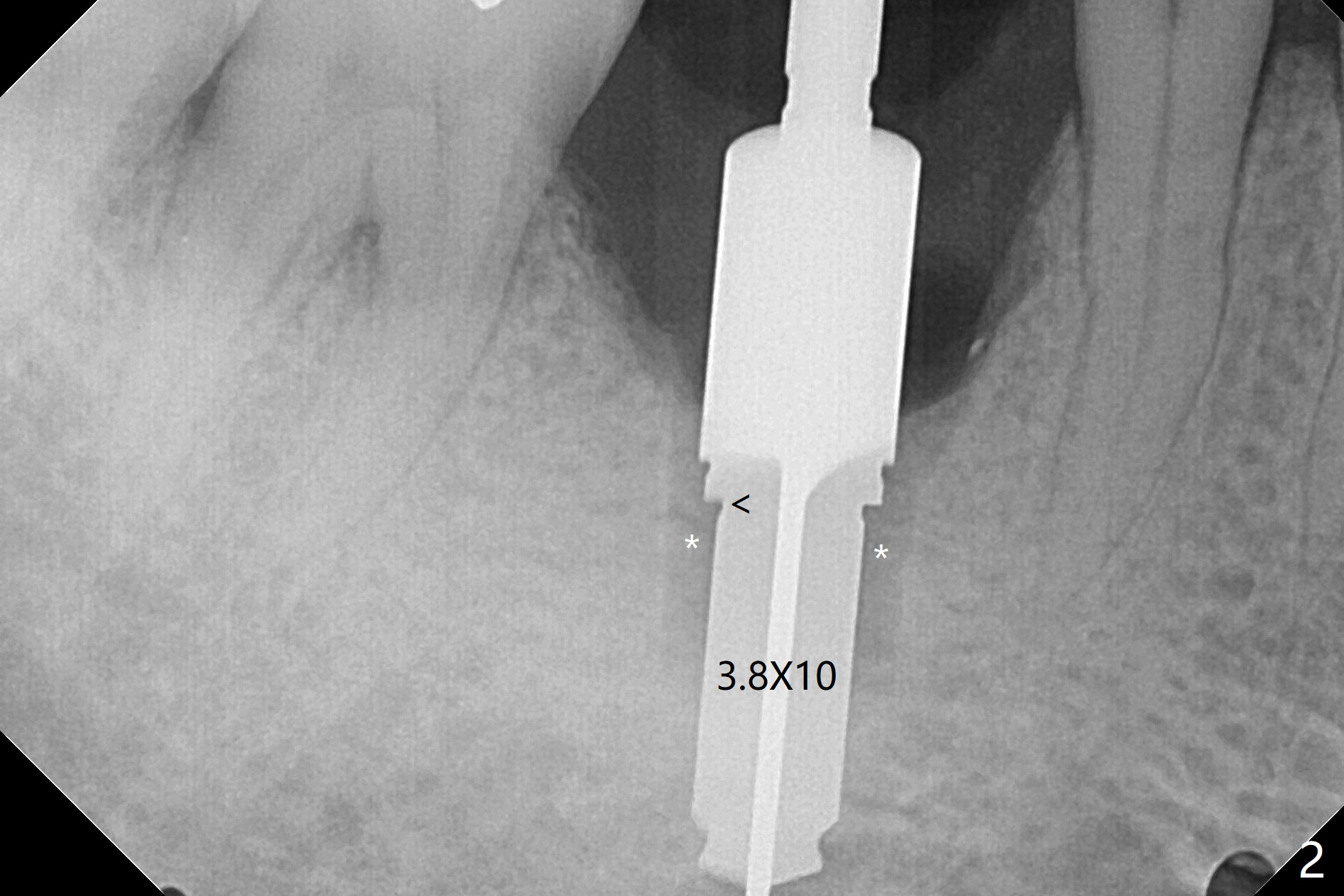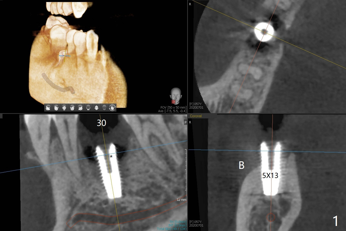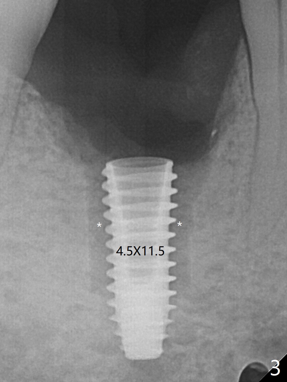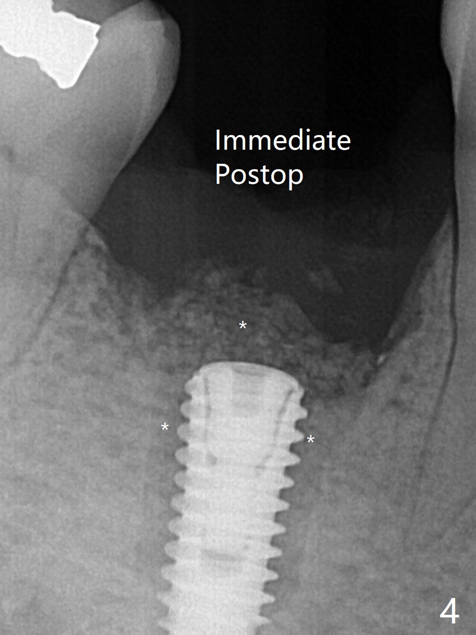When the woman with periimplantitis at #30 returns to clinic, the abutment is found to be fractured (Fig.1 *) and difficult to remove. After implant removal with trephine burs, osteotomy is initiated lingual (Fig.2). A smaller and shorter implant (4.5x11.5 vs. 5.0x13 mm previously) is placed deeper (Fig.3) so that there is space for sticky bone buccal and coronal (Fig.4 *, 5 (postop reanalysis of preop CT)). After placement of 2 pieces of PRF membranes, the wound is closed with 4/0 PGA. The buccal flap is perforated due to periimplantitis and surgical manipulation. Periodontal dressing is applied.