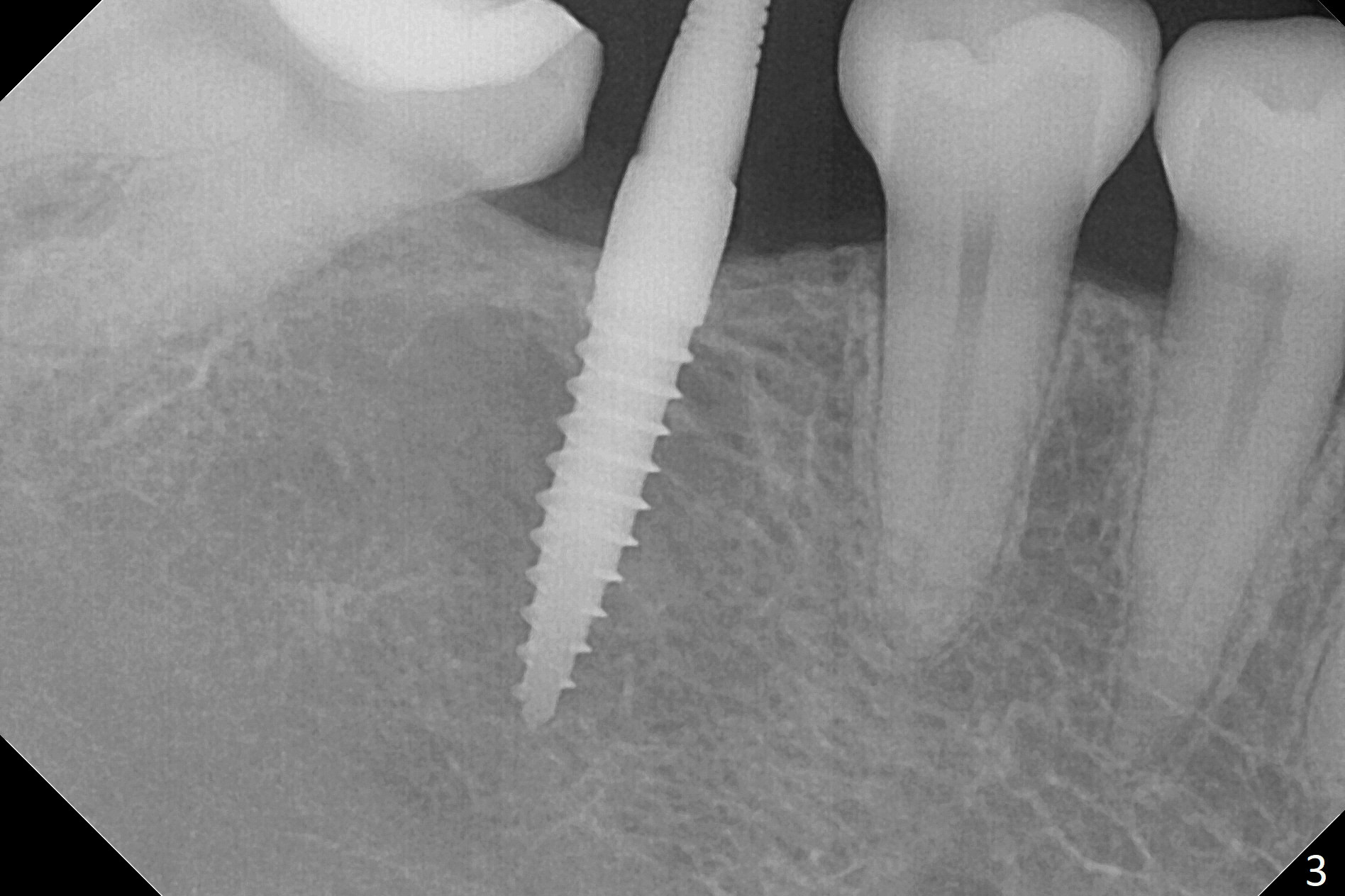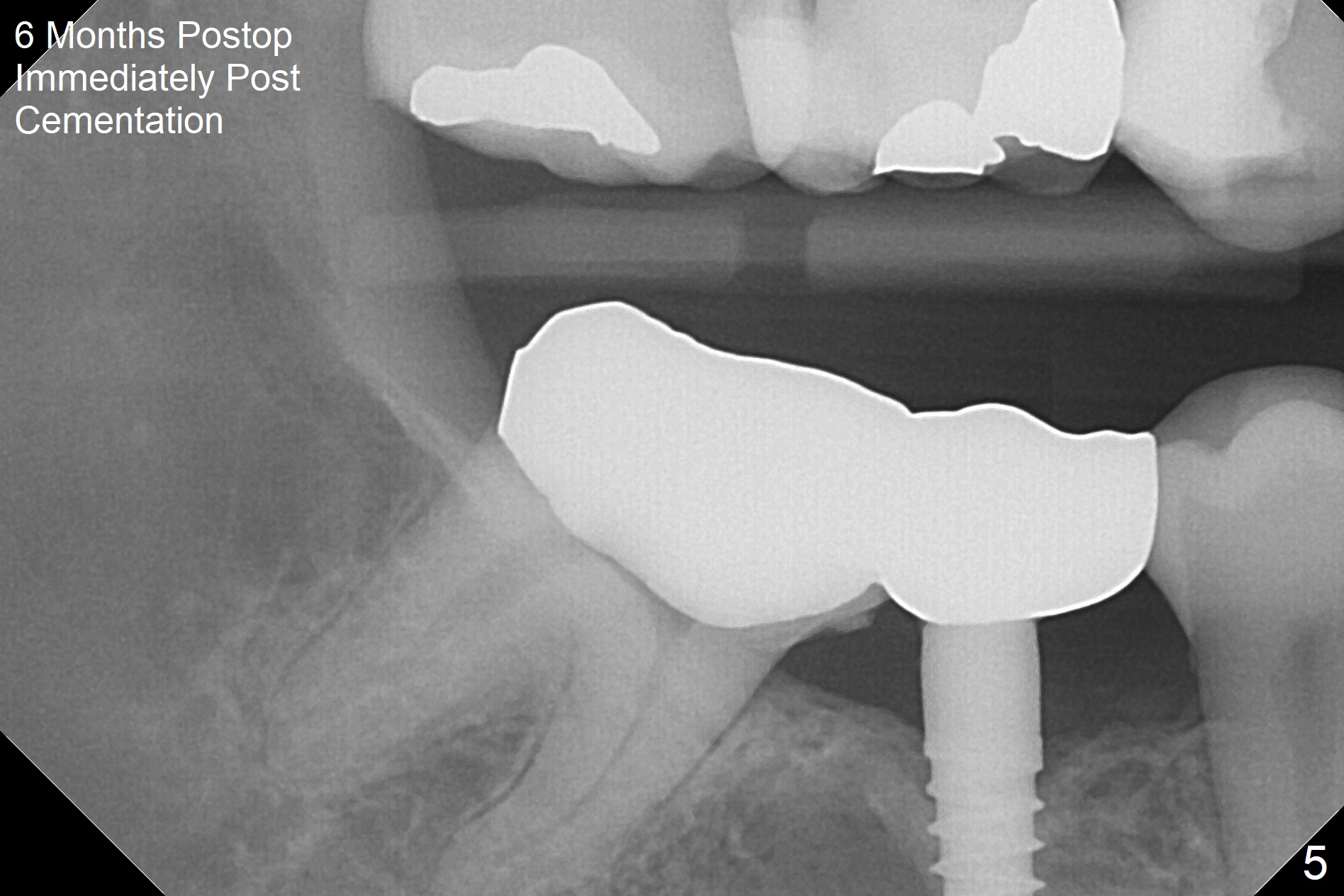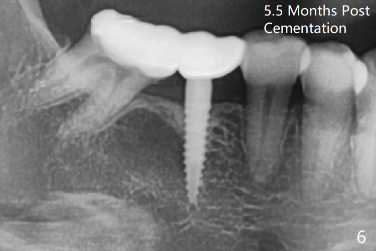 When a 1.2x12 mm drill is placed at #30, it passes the bone cavitation (Fig.1 red dashed line (low density)) twice for two-pointed fixation. So does the 3x12(2) mm 1-piece implant (Fig.2,3). The mesial margin of the tooth #31 is further reduced prior to suturing and periodontal dressing. Impression is taken 5 months postop (Fig.4). Residual cement mesial to the crown at #31 is later removed (Fig.5). Since the crowns were made at #30 and 31 at the same time, there appears no food impaction in between (Fig.6, 5.5 months post cementation).