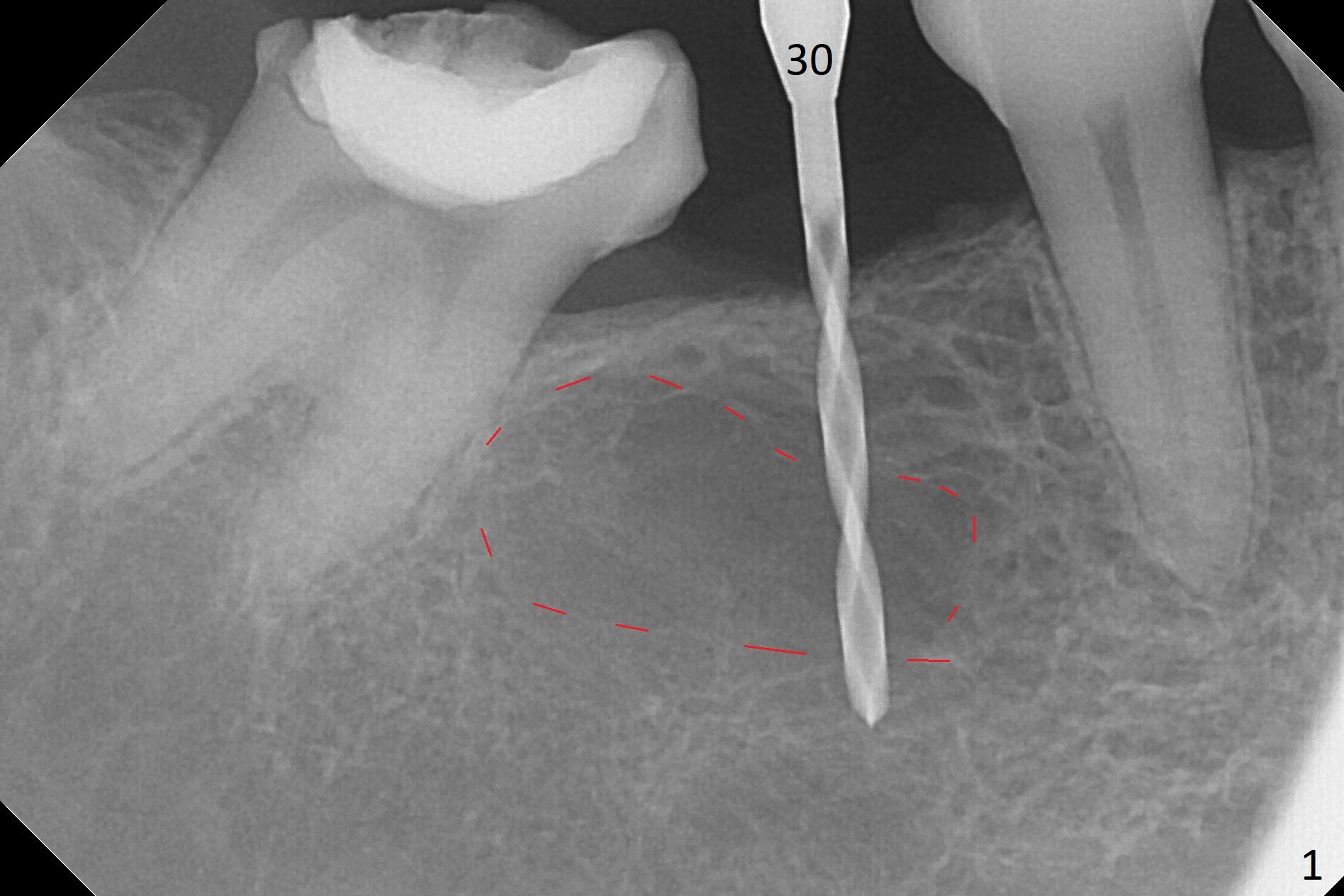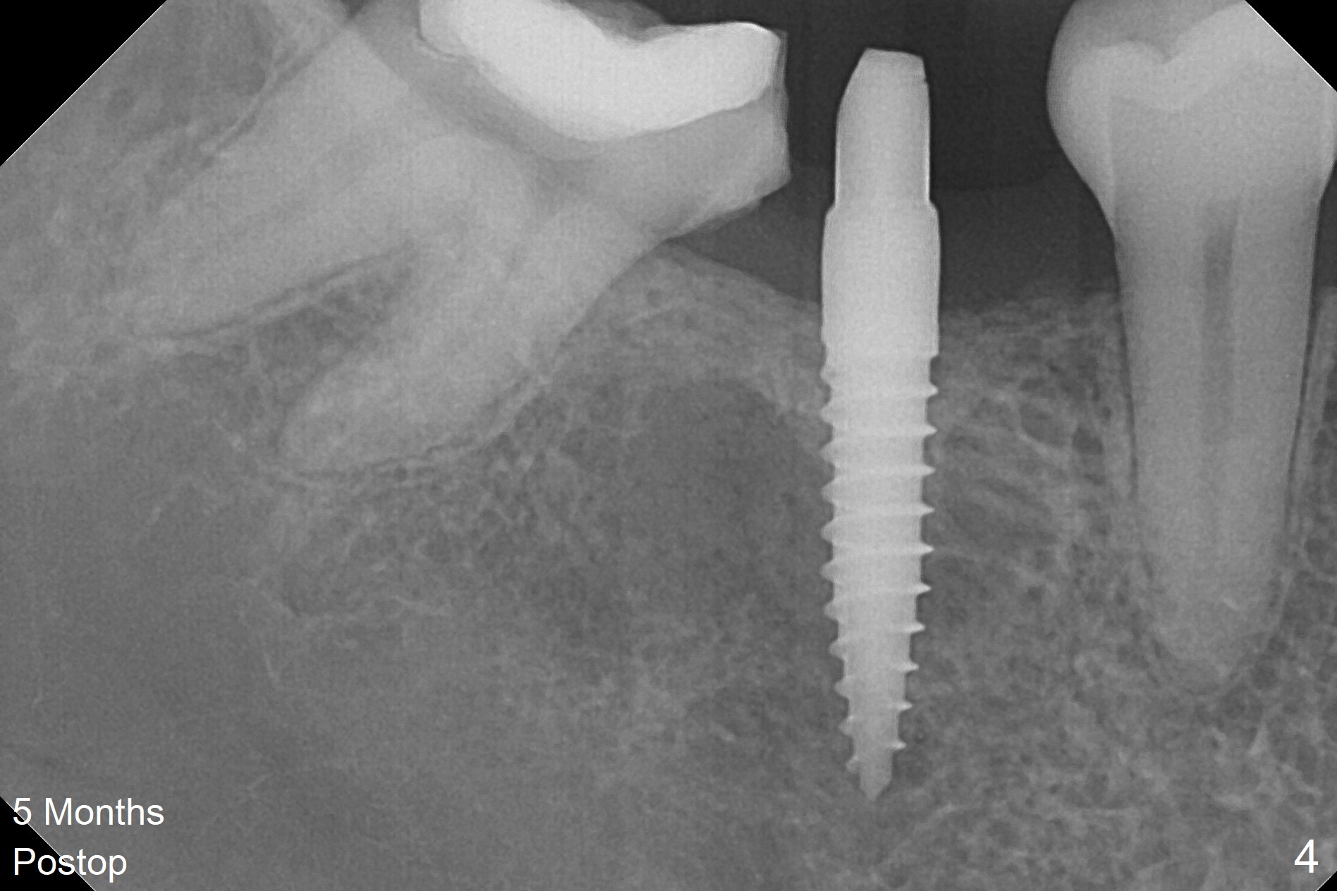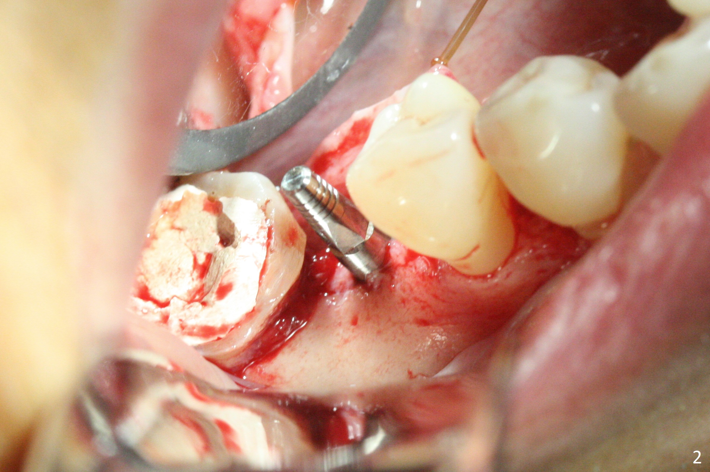When a 1.2x12 mm drill is placed at #30, it passes the bone cavitation (Fig.1 red dashed line (low density)) twice for two-pointed fixation. So does the 3x12(2) mm 1-piece implant (Fig.2,3). The mesial margin of the tooth #31 is further reduced prior to suturing and periodontal dressing. Impression is taken 5 months postop (Fig.4). Residual cement mesial to the crown at #31 is later removed (Fig.5). Since the crowns were made at #30 and 31 at the same time, there appears no food impaction in between (Fig.6, 5.5 months post cementation).