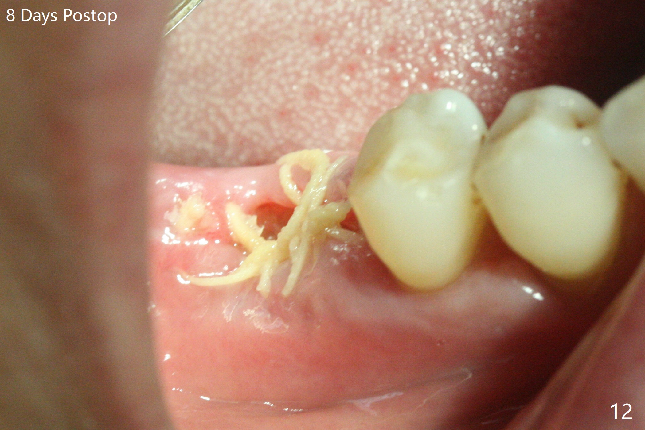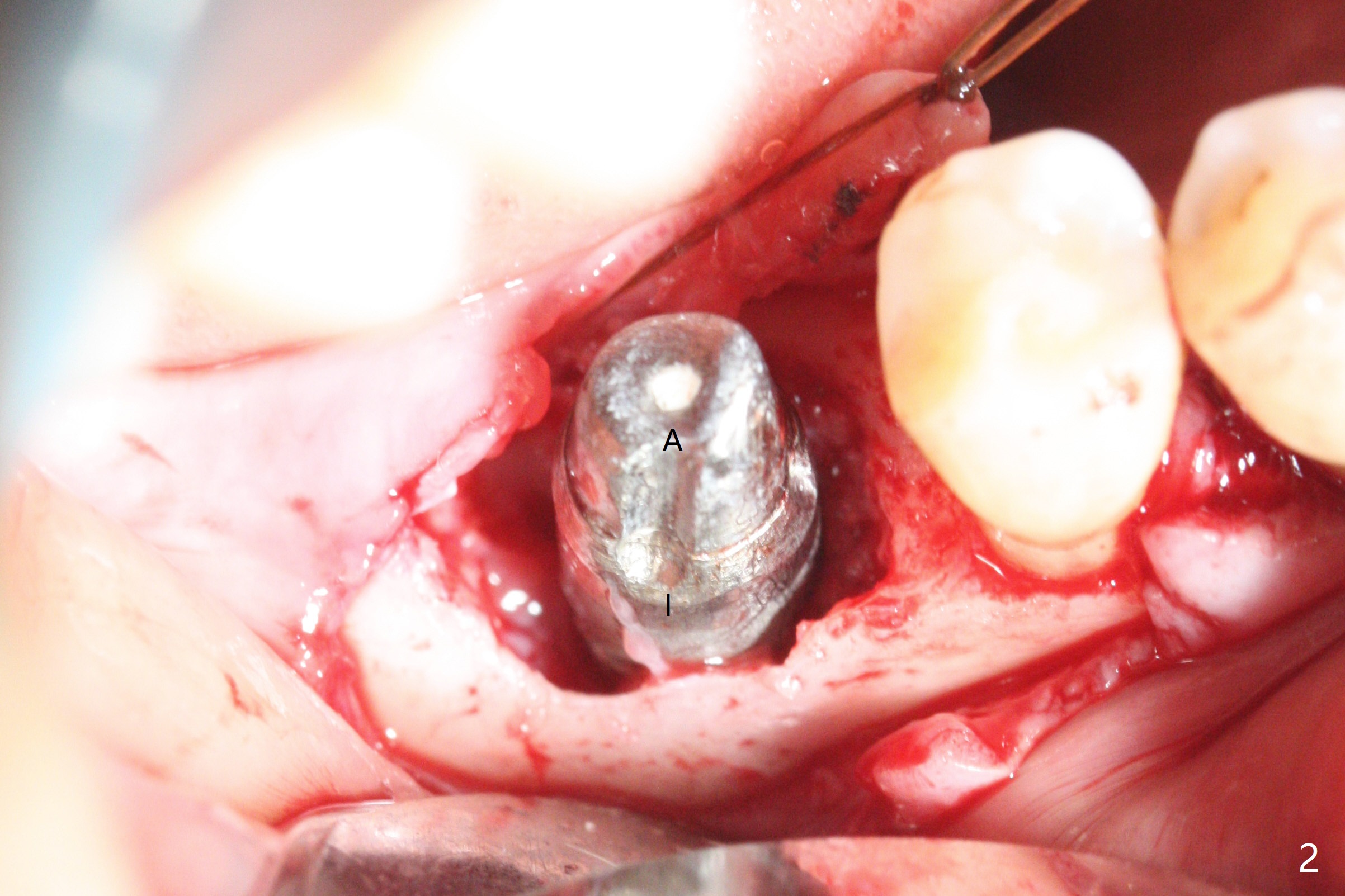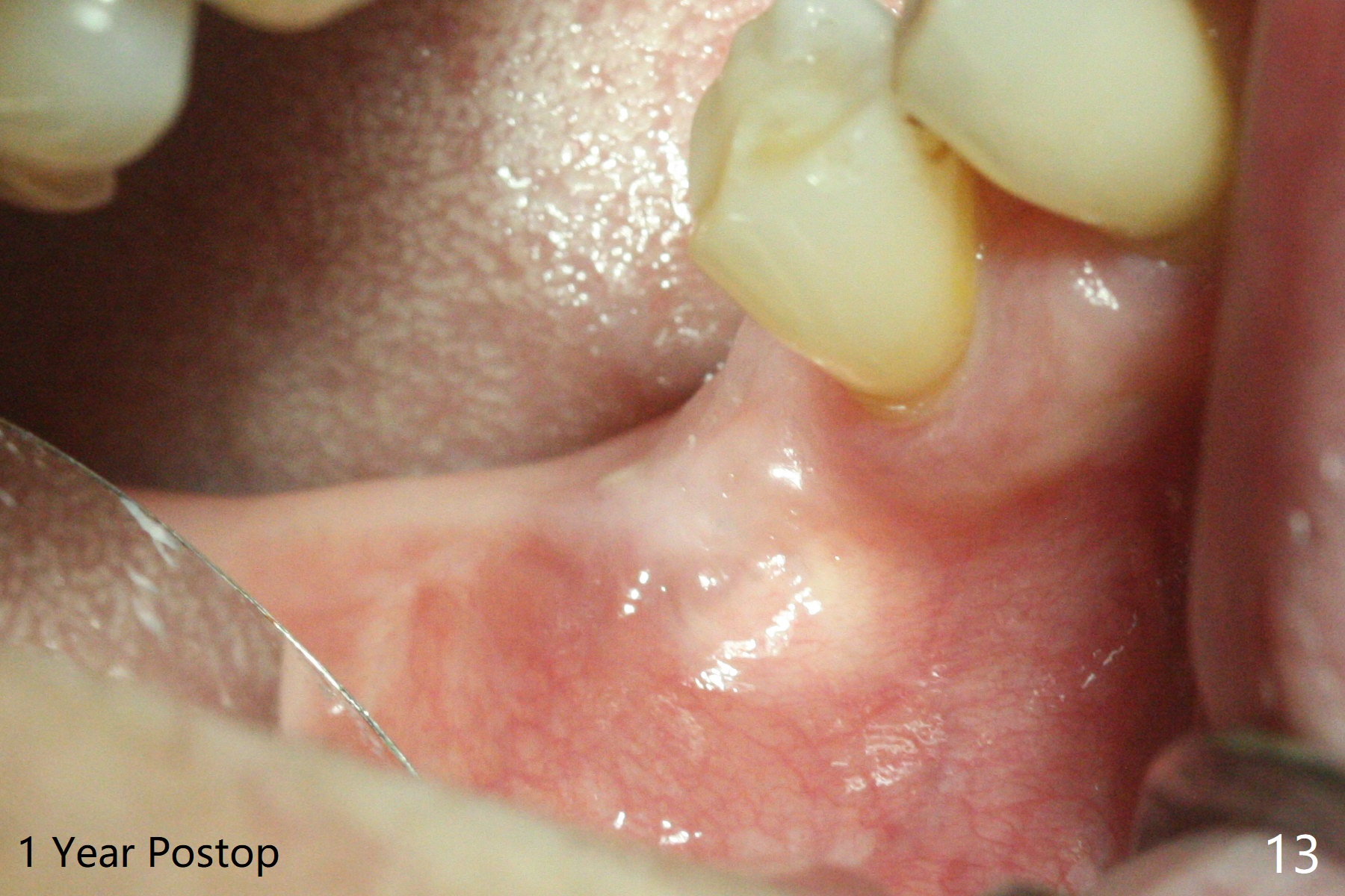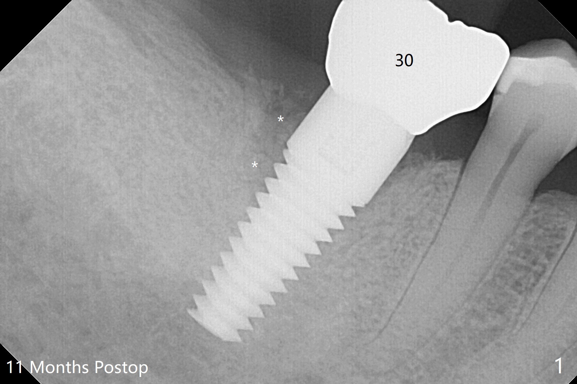 There are signs of periimplantitis at #30 eleven months postop (Fig.1 (* bone loss)). The bony defect (Fig.2) will be filled with allograft mixed PRF liquid to form sticky bone (Fig.3,4), followed by PRF membrane (not shown) and a piece of 6-month membrane (Fig.5). A hole is cut so that the 6-month membrane can slide down the abutment (Fig.2,5 A) to cover the bone graft around the implant (Fig.2,7 I). Setting acrylic is applied around the abutment and neighboring teeth for further protection and holding (Fig.8). The periimplantitis does not resolve nearly 7 months post graft. The implant will be removed. Prepare UF extra wide kit and try to insert 6.5 or 7.0 mm tap. Also prepare sticky bone and Cytoplast for wound closure. Implant removal involves surgical handpiece, 6.2/7 mm trephine bur, elevators, and implant driver. The defect is large (Fig.9) with the low buccal crest (Fig.10) and bone graft with PRF ("sticky bone") is placed, covered by PRF and 6-months membrane (Fig.11). The next implant will be placed with guide. If oral hygiene is not ideal, choose a bone level implant. The middle of the wound dehiscences slightly 8 days postop (Fig.12), accounting for mild loss of bone graft 1 year postop (Fig.14). The keratinized gingiva is apparently wide 1 year postop (Fig.13). There is mild loss of bone graft in the middle of the superficial area (Fig.14). The buccal plate seems to regenerate 1 year postop (pandemic delay, Fig.15).