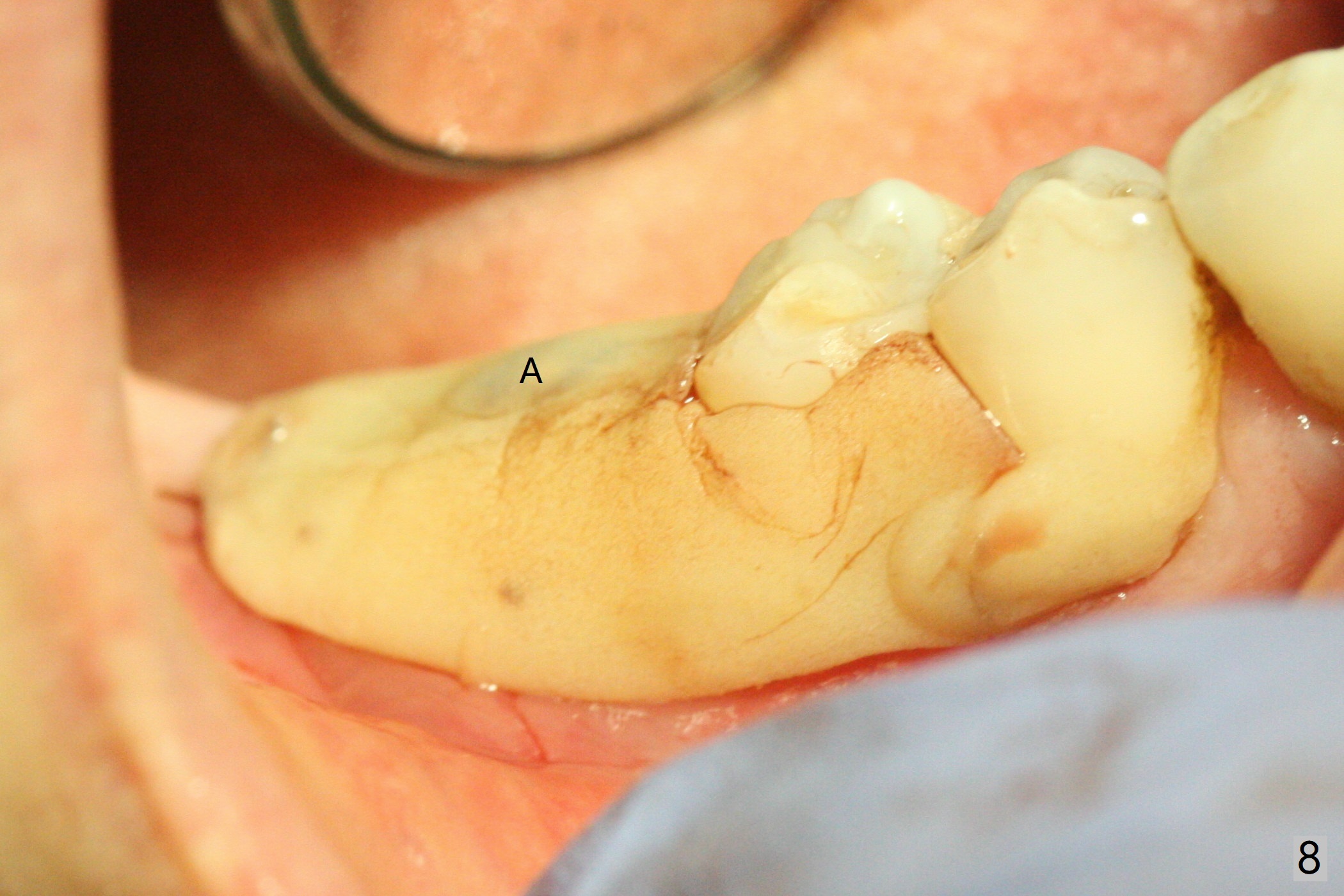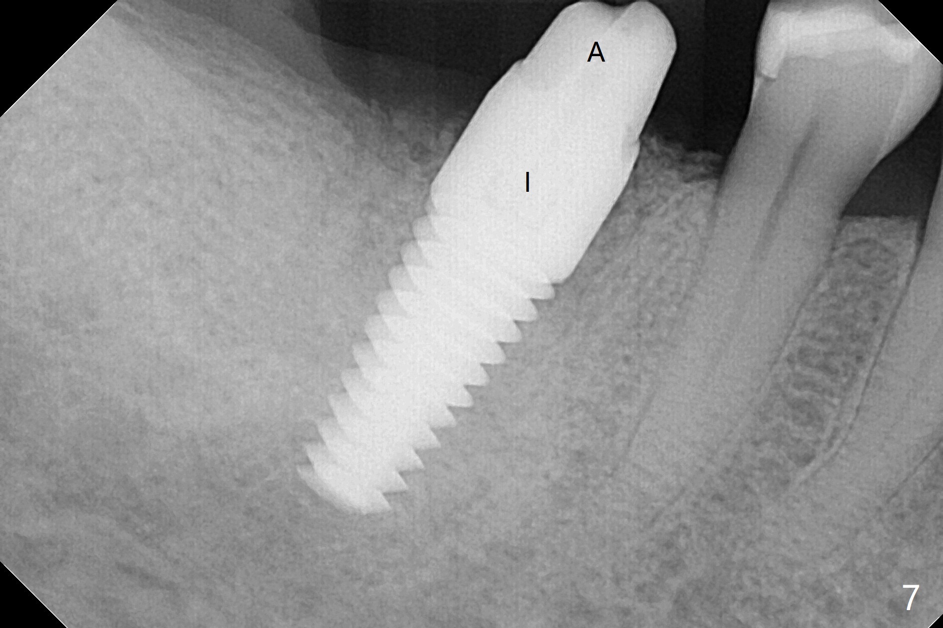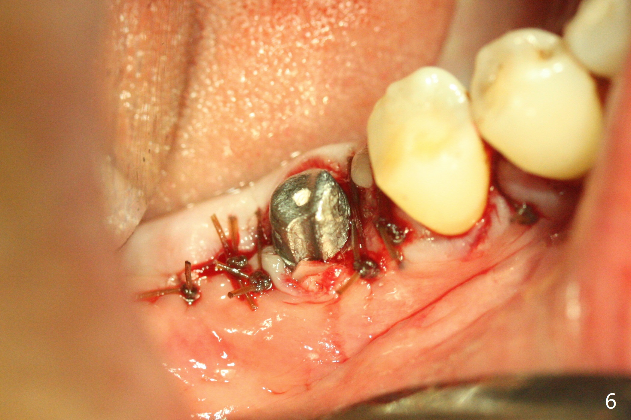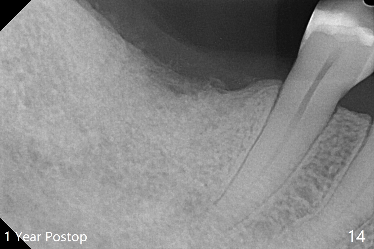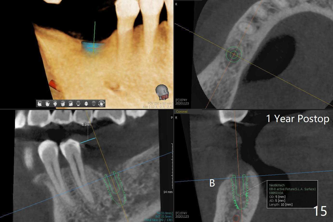 There are signs of periimplantitis at #30 eleven months postop (Fig.1 (* bone loss)). The bony defect (Fig.2) will be filled with allograft mixed PRF liquid to form sticky bone (Fig.3,4), followed by PRF membrane (not shown) and a piece of 6-month membrane (Fig.5). A hole is cut so that the 6-month membrane can slide down the abutment (Fig.2,5 A) to cover the bone graft around the implant (Fig.2,7 I). Setting acrylic is applied around the abutment and neighboring teeth for further protection and holding (Fig.8). The periimplantitis does not resolve nearly 7 months post graft. The implant will be removed. Prepare UF extra wide kit and try to insert 6.5 or 7.0 mm tap. Also prepare sticky bone and Cytoplast for wound closure. Implant removal involves surgical handpiece, 6.2/7 mm trephine bur, elevators, and implant driver. The defect is large (Fig.9) with the low buccal crest (Fig.10) and bone graft with PRF ("sticky bone") is placed, covered by PRF and 6-months membrane (Fig.11). The next implant will be placed with guide. If oral hygiene is not ideal, choose a bone level implant. The middle of the wound dehiscences slightly 8 days postop (Fig.12), accounting for mild loss of bone graft 1 year postop (Fig.14). The keratinized gingiva is apparently wide 1 year postop (Fig.13). There is mild loss of bone graft in the middle of the superficial area (Fig.14). The buccal plate seems to regenerate 1 year postop (pandemic delay, Fig.15).