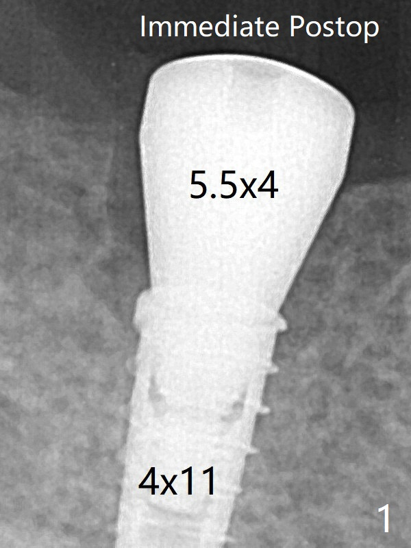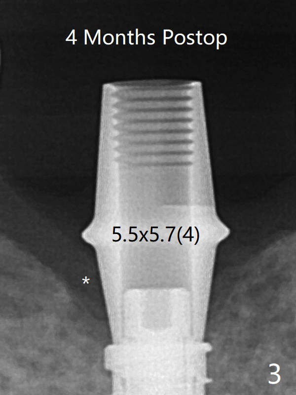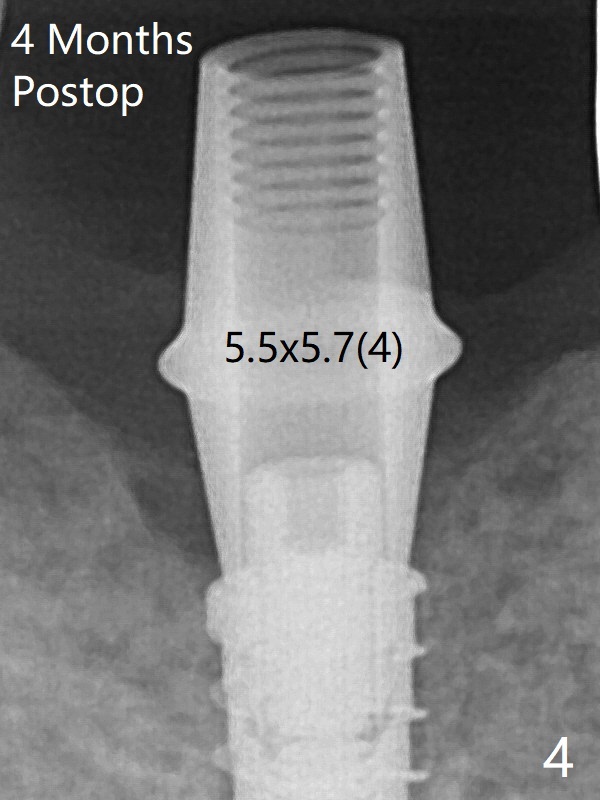 There is crestal bone loss 4 months postop (Fig.3,4). It appears that the implant was placed excessively deep.