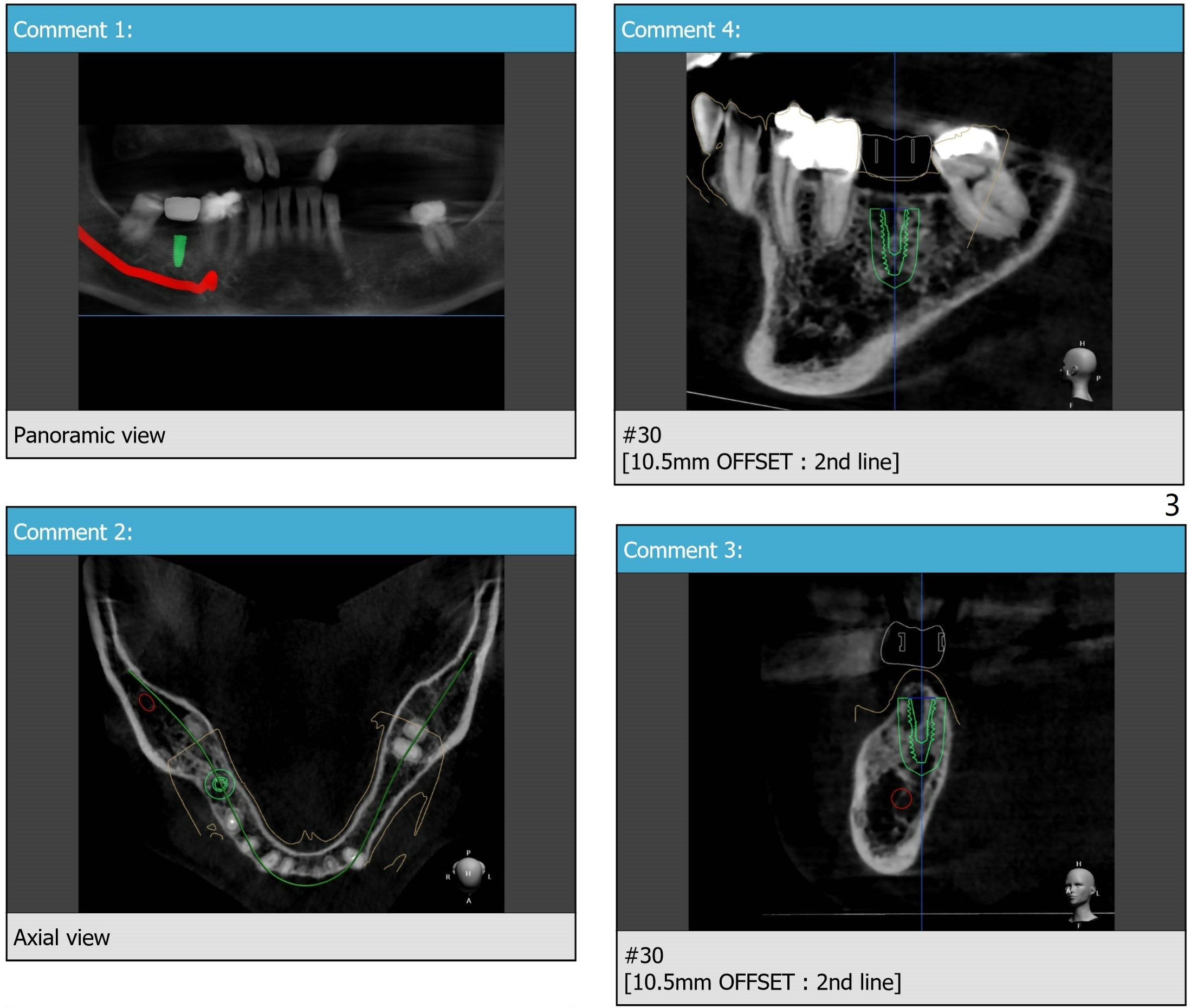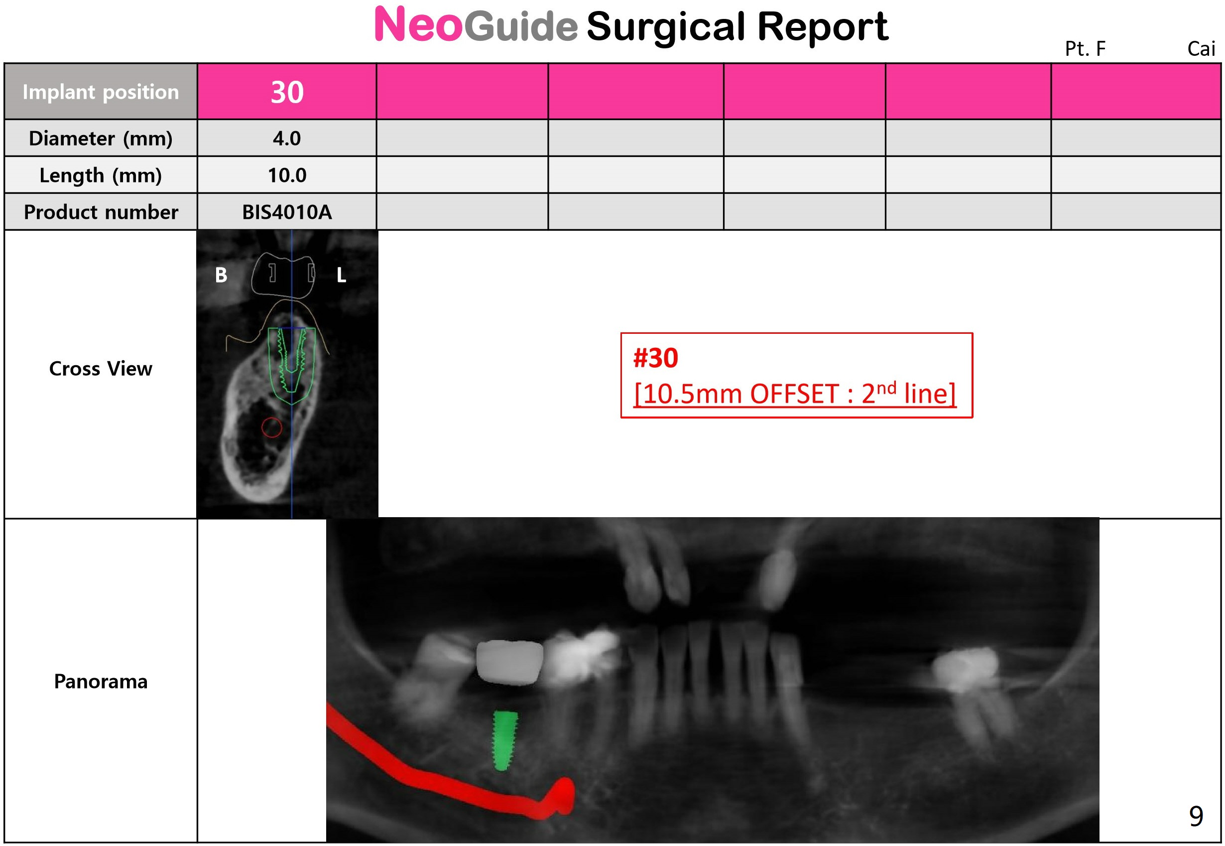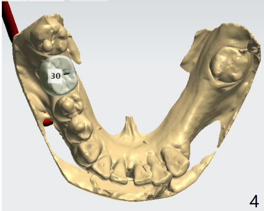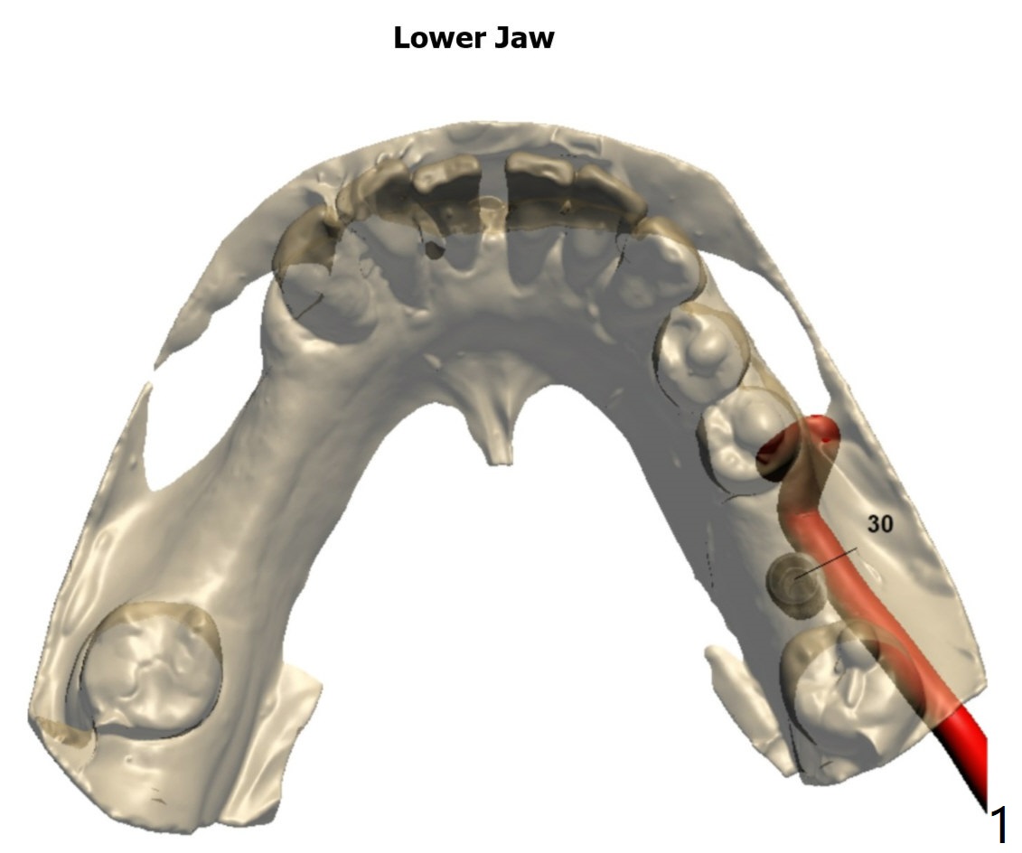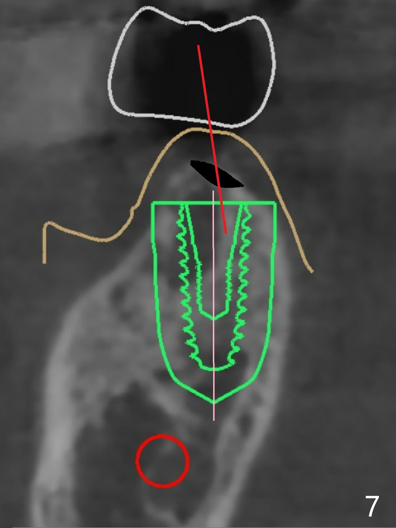 The crest is uneven, lower lingual (Fig.5), which deviates bone trimmer lingual (Fig.6 black area). The pink line is the long axis of the implant. Initial drills may deviate lingual because of the uneven crest (Fig.7 red line), while the bigger drills are most likely to bounce back buccal due to the encounter the denser lingual plate (Fig.8 blue line).