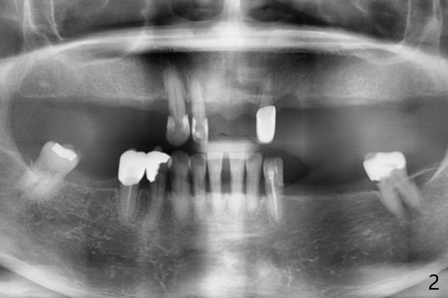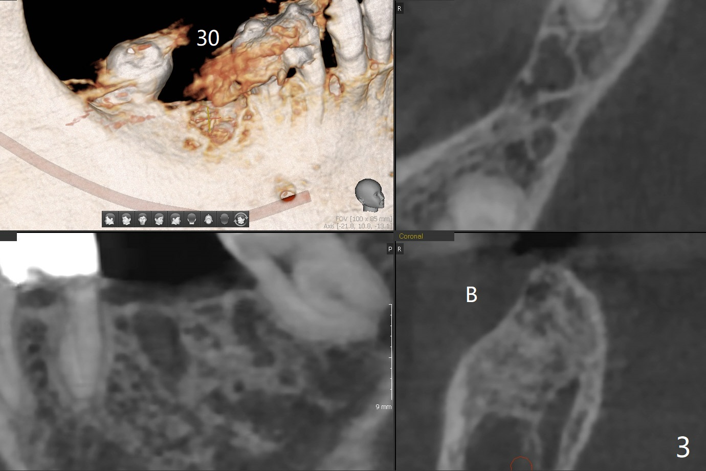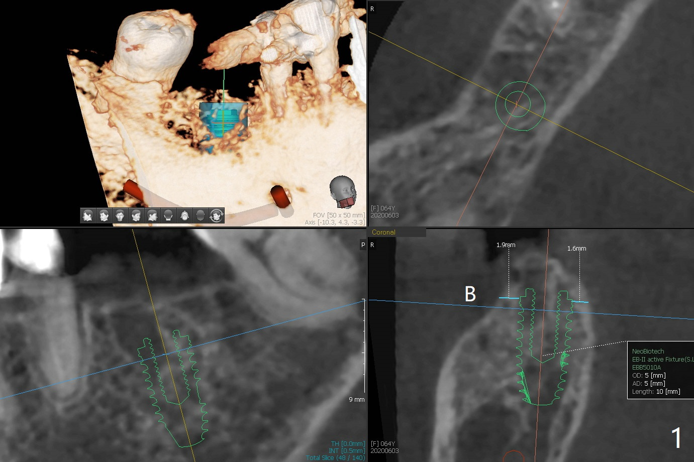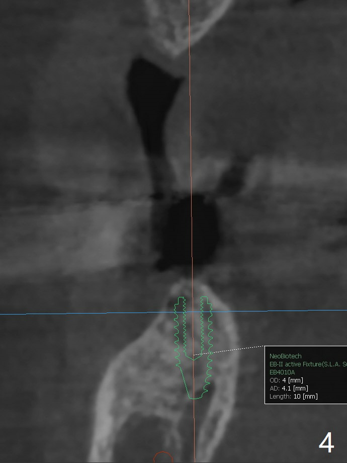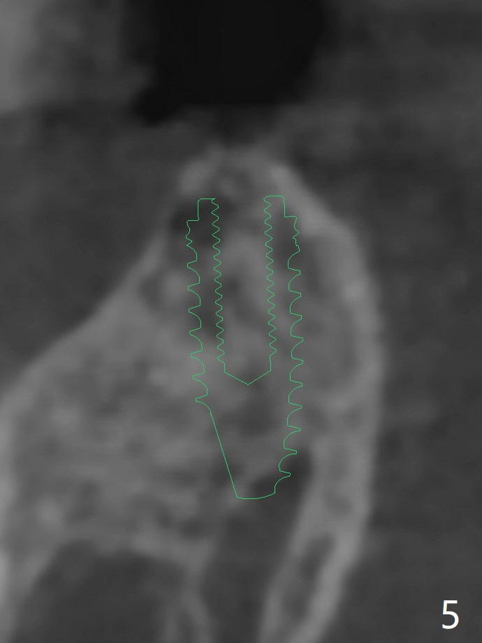 A 64-year-old woman with partial edentulism requests an implant for #30 after #29 crown temp bond cementation (Fig.1). The buccal, crestal and lingual cortex is equally thin (no deviation). The medulla is porous. The average bone density is 600 units. Ask the patient about osteoporosis treatment. A 4.5x10 mm implant with deep placement is going to have 2 mm bone buccal and lingual. Underprep is necessary (the last drill 3.5x10 mm). Due to metal scattering from amalgam from #28,29,31, a larger field view of CT is taken (Fig.2). Although the cancellous bone looks porous (Fig.3), the average bone density is 1000 units. The 2nd analysis shows that the ridge is narrower, allowing safe placement of a 4 mm implant (Fig.4,5). In spite of keratinized gingiva in the edentulous area, incision will be made to make sure the ridge top is being flattened by bone trimmer. If it is insufficient, use rotary instruments.