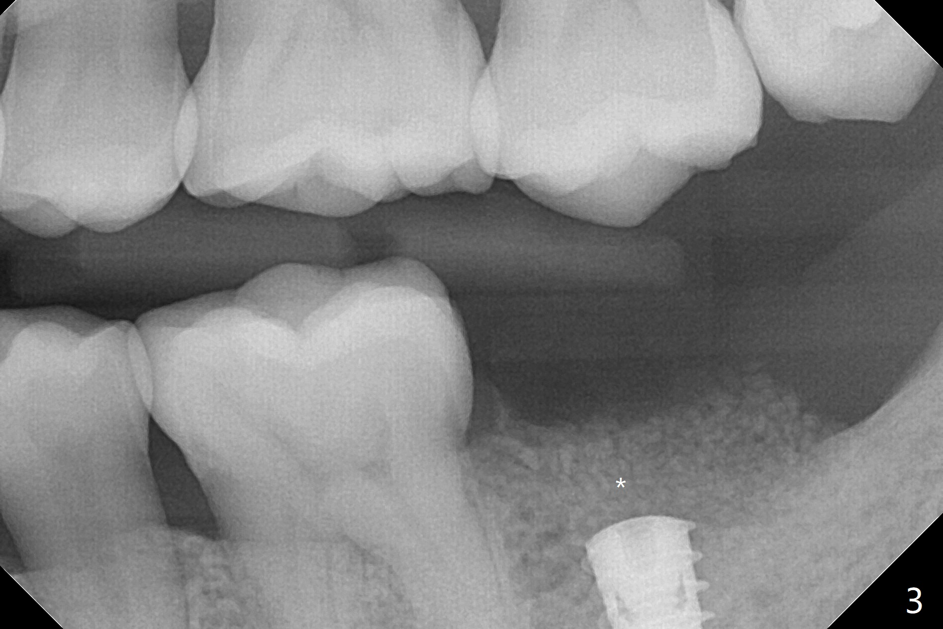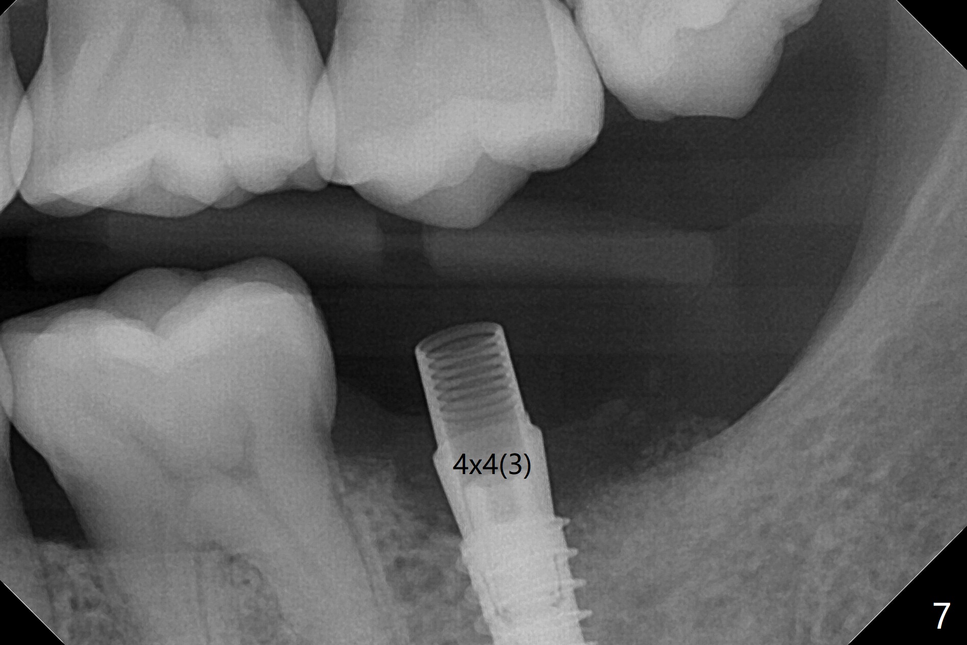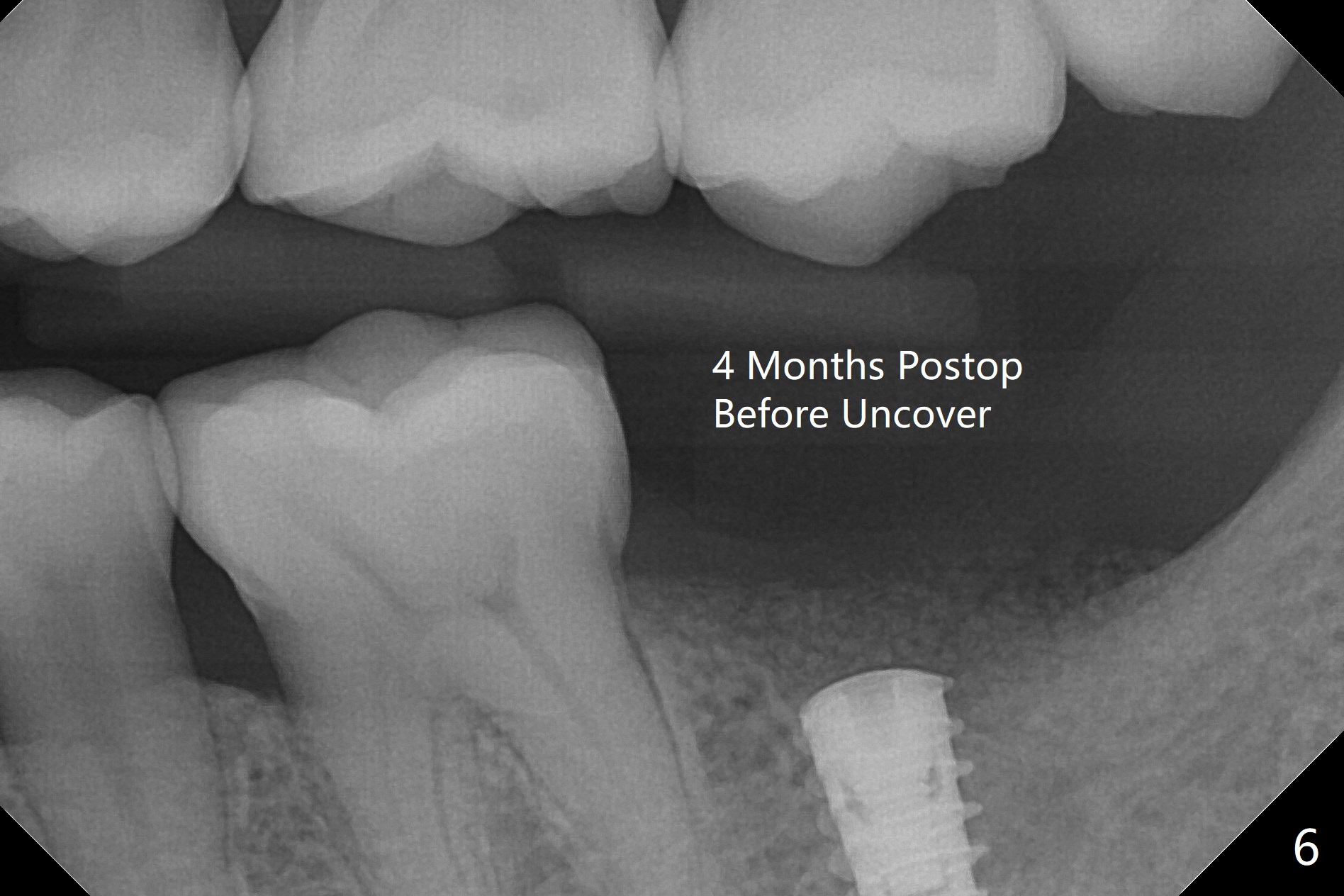 左下7钻洞中出现三种情况:容易出血(血小板减低(9万)),疼痛(根尖肉芽肿)和骨质疏松,钻洞深度还没达到,使用短小报废植体拍摄根尖片(图一),之后下颌牙槽神经阻断,钻洞没有疼痛,但是未注意骨质疏松问题,按照正常钻洞顺序,所以正式植体扭力低,10 Ncm(图二),放置骨粉和不可吸收膜,PTFE缝合(图三)。术后一周膜舌侧稍微外翻(剪太小些,图四)。病人将术后五周回来去除膜,之后拍摄咬翼片证实骨粉丧失与否。其实病人提前回来,抱怨缝线不适,膜不翼而飞(图五,折线后),患侧咀嚼,因为对侧下颌第二磨牙疼痛又不肯拔除。The bone graft placed at the time of immediate implant (Fig.3 *) is apparently changing into the normal bone 4 months postop before uncover (Fig.6). After removal of the bone coronal to the implant with a curette, a 4x4(3) mm pair abutment is placed (Fig.7). Two weeks later the abutment screw is torqued at 20 Ncm.