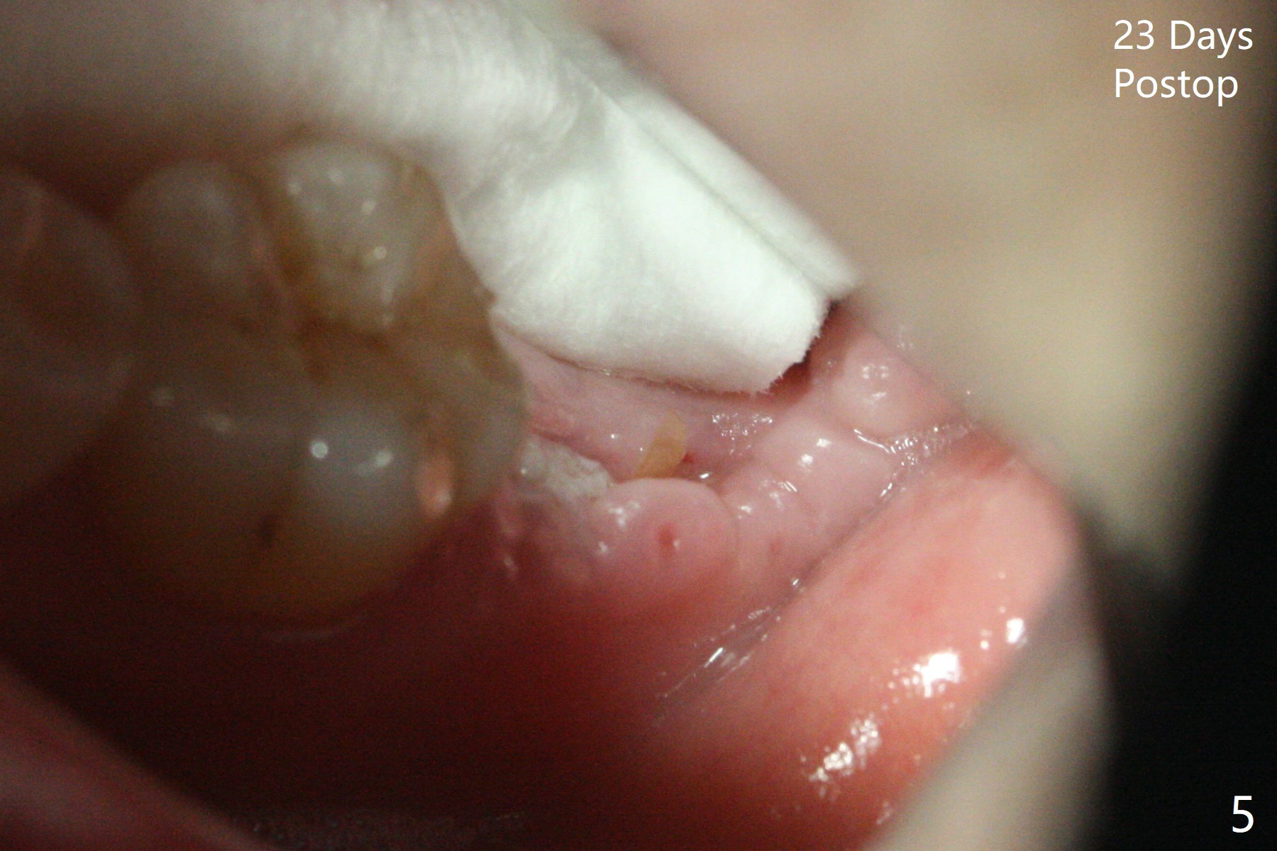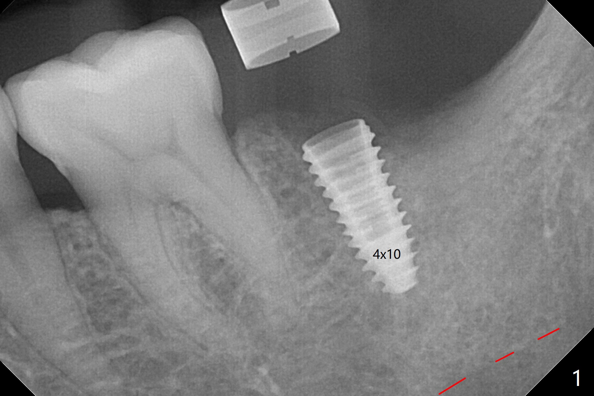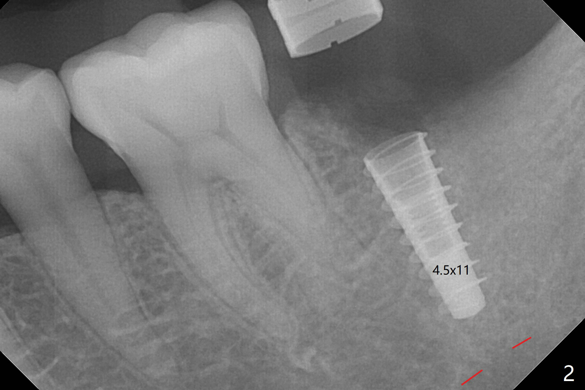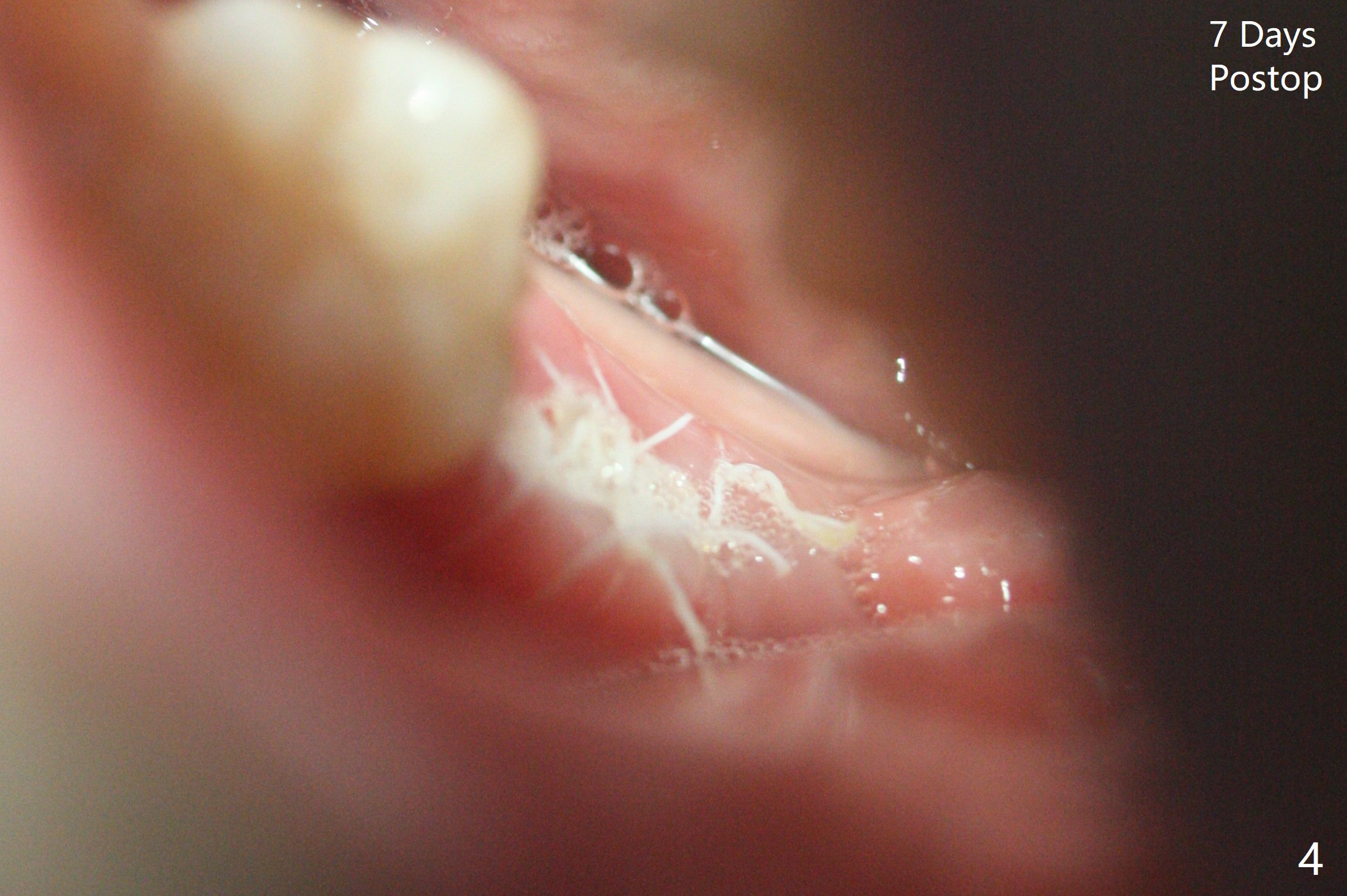 左下7钻洞中出现三种情况:容易出血(血小板减低(9万)),疼痛(根尖肉芽肿)和骨质疏松,钻洞深度还没达到,使用短小报废植体拍摄根尖片(图一),之后下颌牙槽神经阻断,钻洞没有疼痛,但是未注意骨质疏松问题,按照正常钻洞顺序,所以正式植体扭力低,10 Ncm(图二),放置骨粉和不可吸收膜,PTFE缝合(图三)。术后一周膜舌侧稍微外翻(剪太小些,图四)。病人将术后五周回来去除膜,之后拍摄咬翼片证实骨粉丧失与否。其实病人提前回来,抱怨缝线不适,膜不翼而飞(图五,折线后),患侧咀嚼,因为对侧下颌第二磨牙疼痛又不肯拔除。The bone graft placed at the time of immediate implant (Fig.3 *) is apparently changing into the normal bone 4 months postop before uncover (Fig.6). After removal of the bone coronal to the implant with a curette, a 4x4(3) mm pair abutment is placed (Fig.7). Two weeks later the abutment screw is torqued at 20 Ncm.