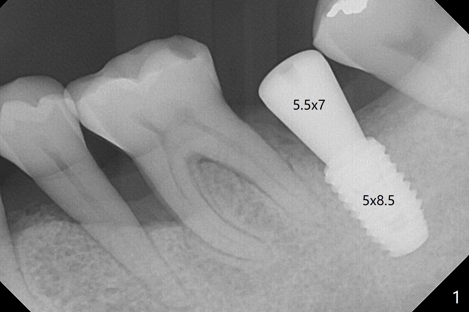 After a 5x8.5 mm implant is placed at #18, it is difficult to place a 6.5 mm healing abutment, since it prematurely contacts the tooth #17. When the postop PA is taken (Fig.1), the implant appears to be close to the root of the tooth #19. The former may block the blood supply to the distal root of the tooth #19. A 4 mm implant may be sufficient for the narrow mesiodistal space.