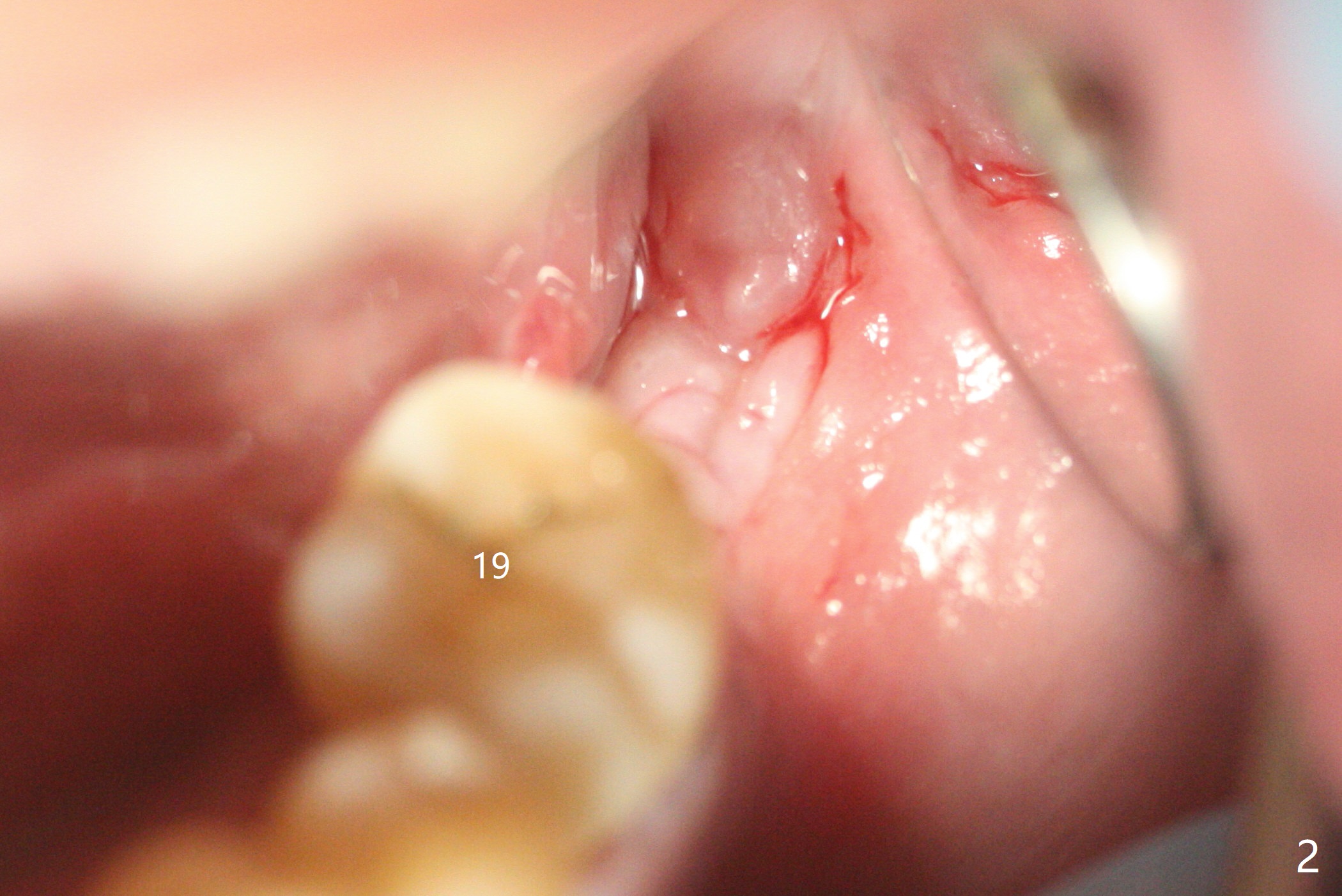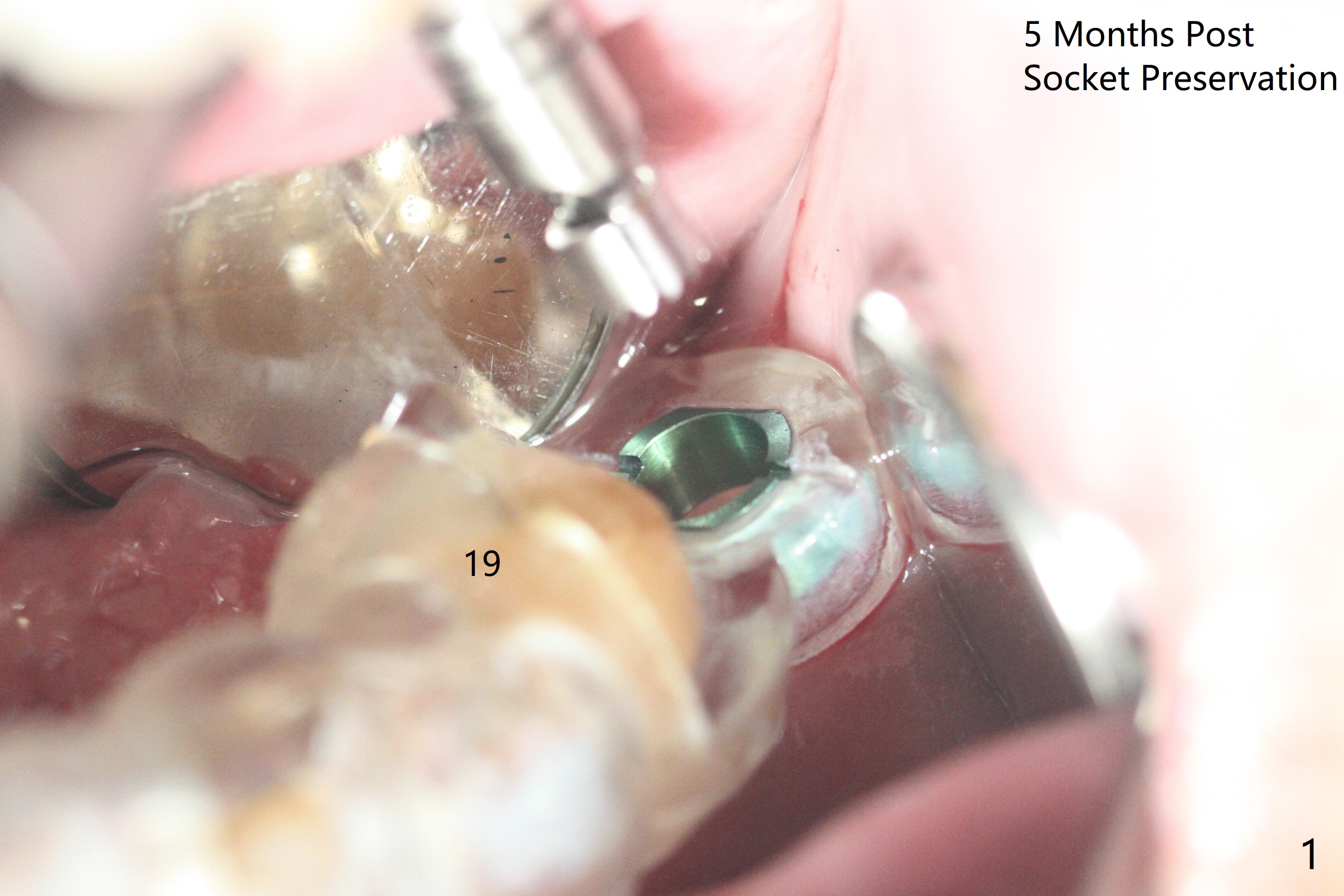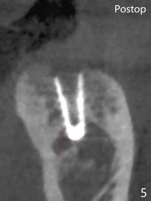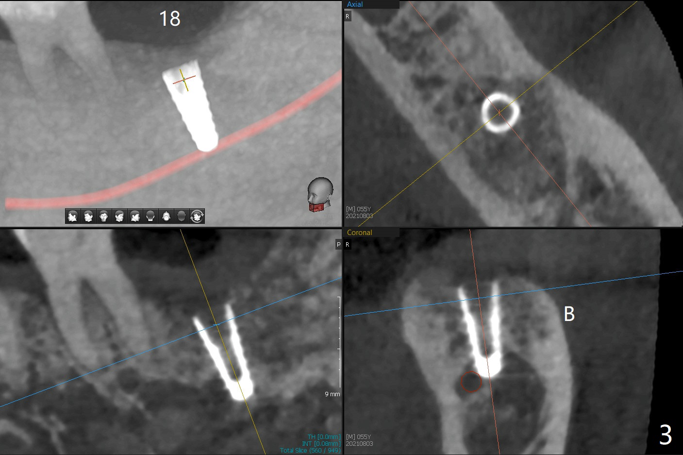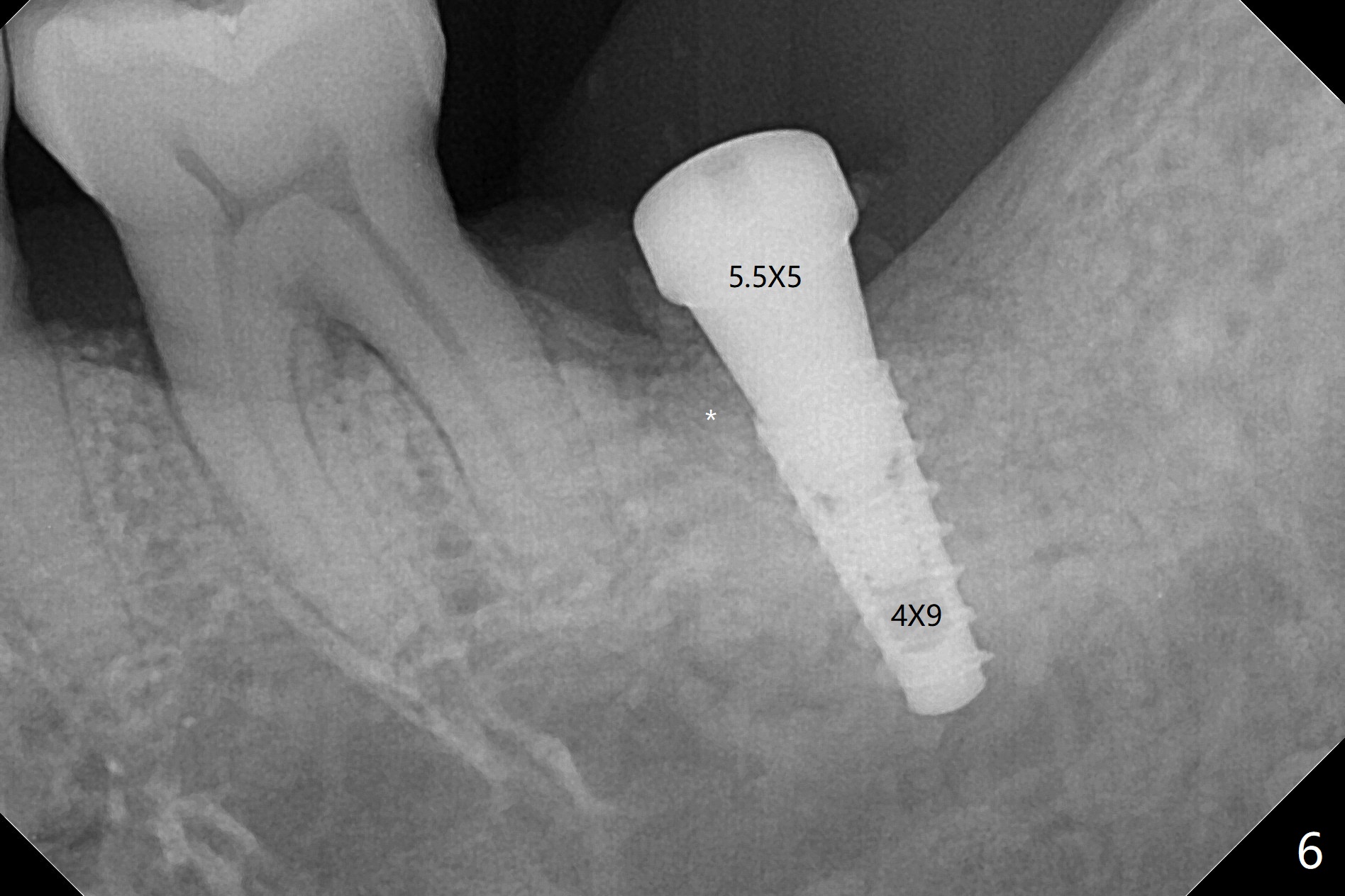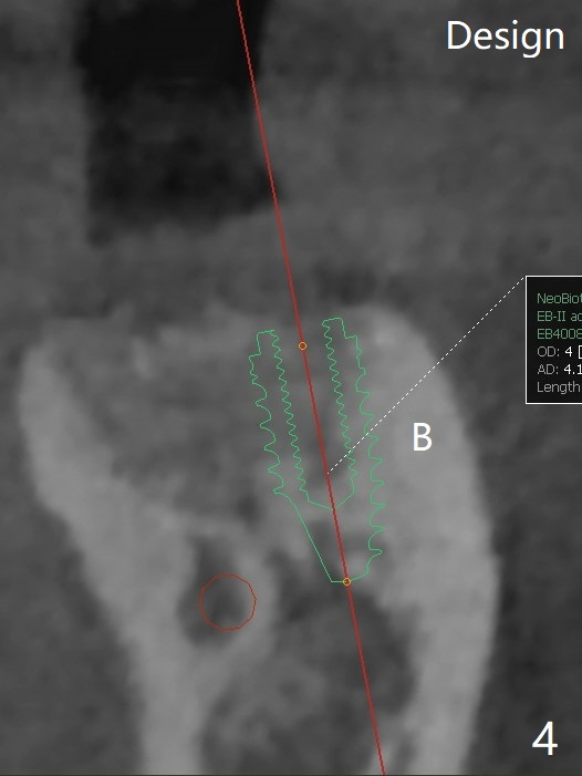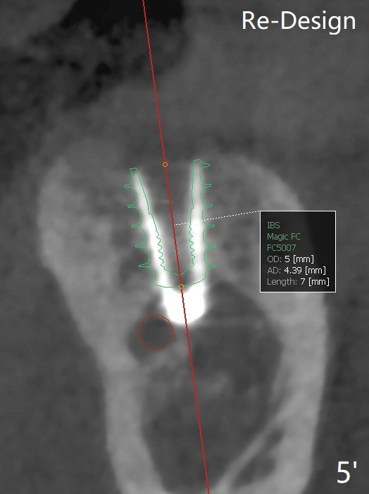 导板种植是否需要切开取决于牙槽嵴角化龈宽度,放置导板后,插入环形刀(图一),用手的压力(不要开手机)接触牙龈后,抽出环形刀,并且取出导板,检查环形标记是否累及颊侧粘膜(图二)。这个病例没有,所以没有切开,也没有保留角化龈(骨质硬,预计术后可以使用愈合基台)。在34毫克利多卡因17微克肾上腺素浸润(jinrun)麻醉下,完成钻洞(最后钻头3.5x10毫米),植体植入,拍摄CT却发现植体非常接近神经(图三,五),似乎钻洞向舌侧偏移(与设计(图四)对比),可能与没有远中牙齿固位有关。由于术中没有疼痛,估计没有直接损伤神经,放置愈合基台,在后者周围空间塞入骨粉(图六:*)。理想情景使用2.2x7.3毫米钻头后,拍摄CT,最后植入4.5或者5.0x7.3毫米植体(图五')。术后没有疼痛也没有麻木。