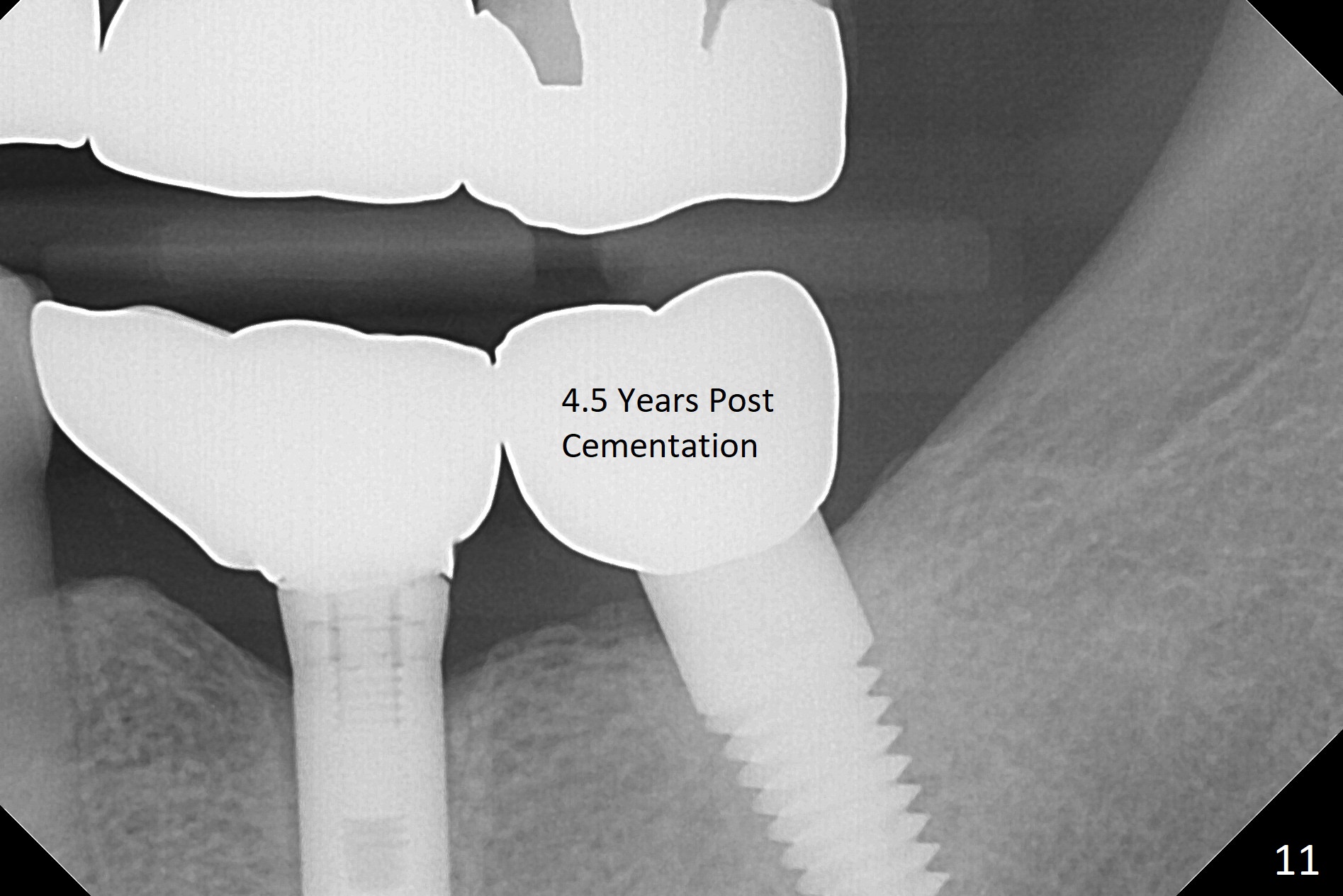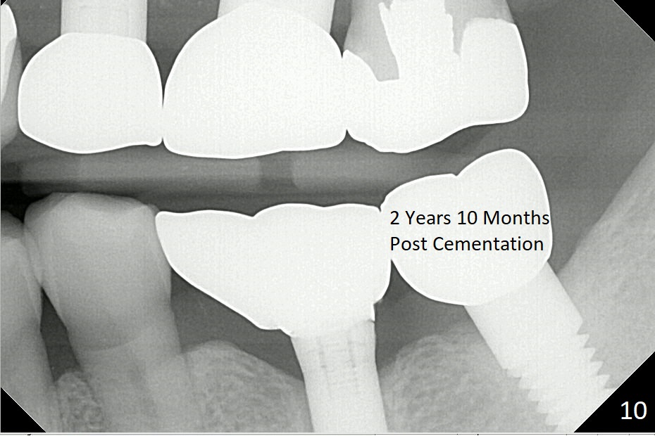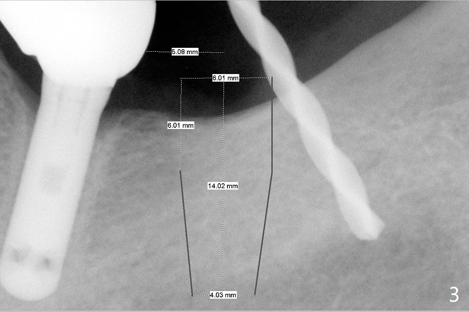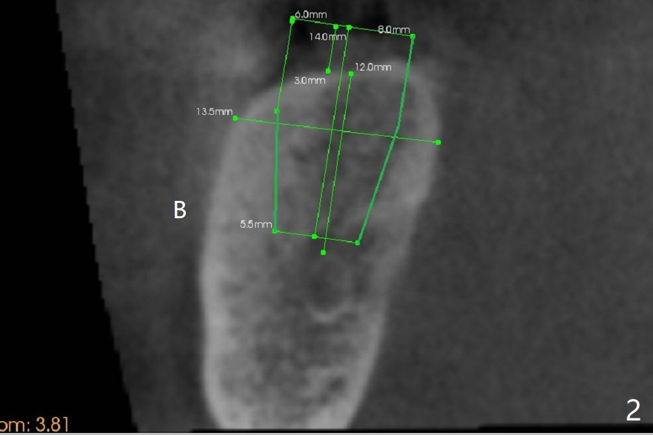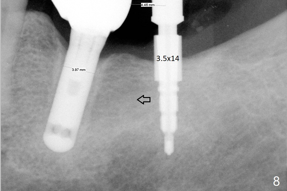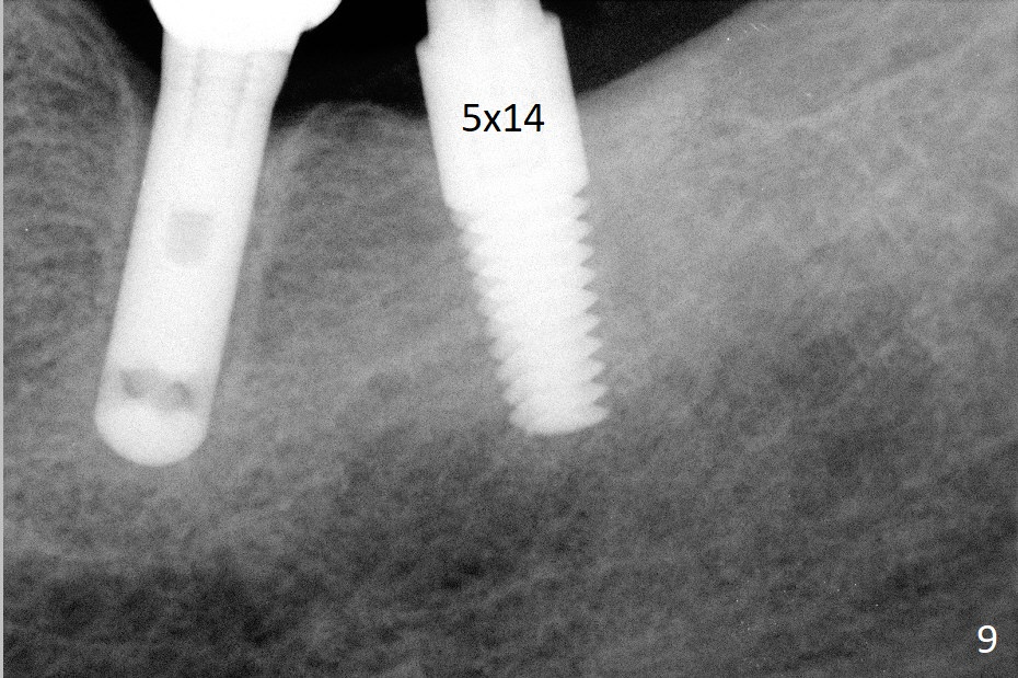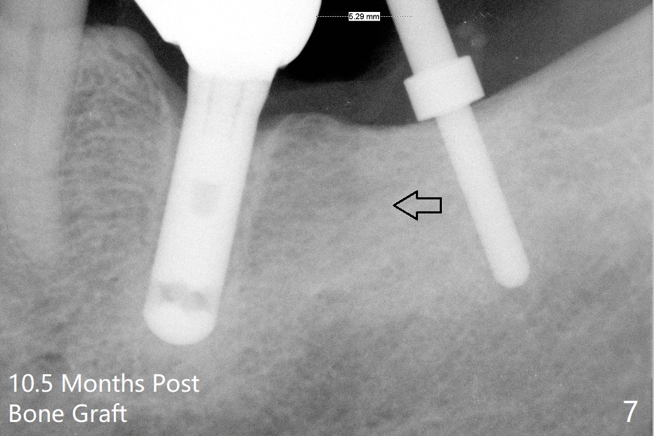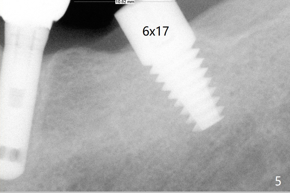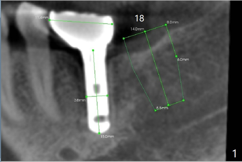 A 69-year-old man needs an implant at #18 (Fig.1,2 CT (sagittal and coronal sections)). In spite of use of surgical stent, the trajectory is not ideal (Fig.3-5). The following day the implant is removed with bone graft (Fig.6). In the 2nd placement, the trajectory is adjusted in each step (Fig.7-9 arrows) with long term stability (Fig.10,11).