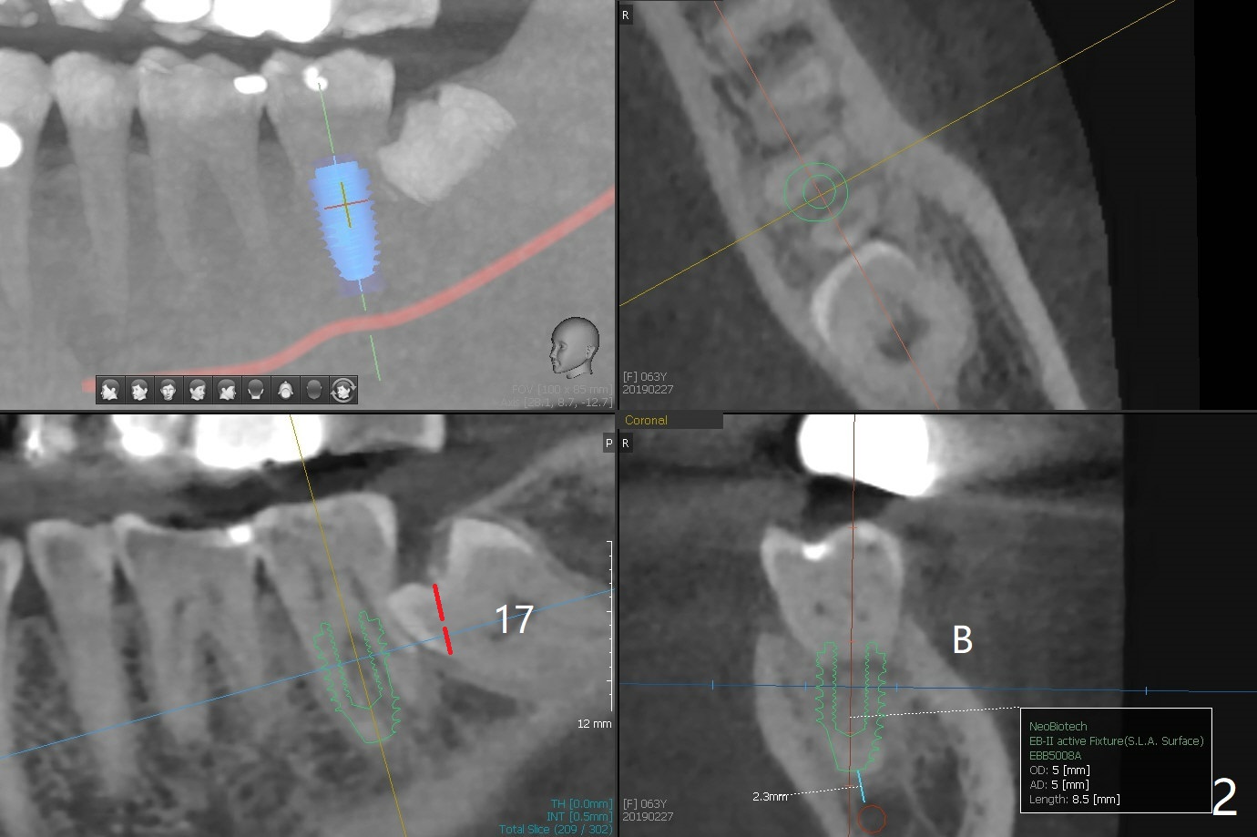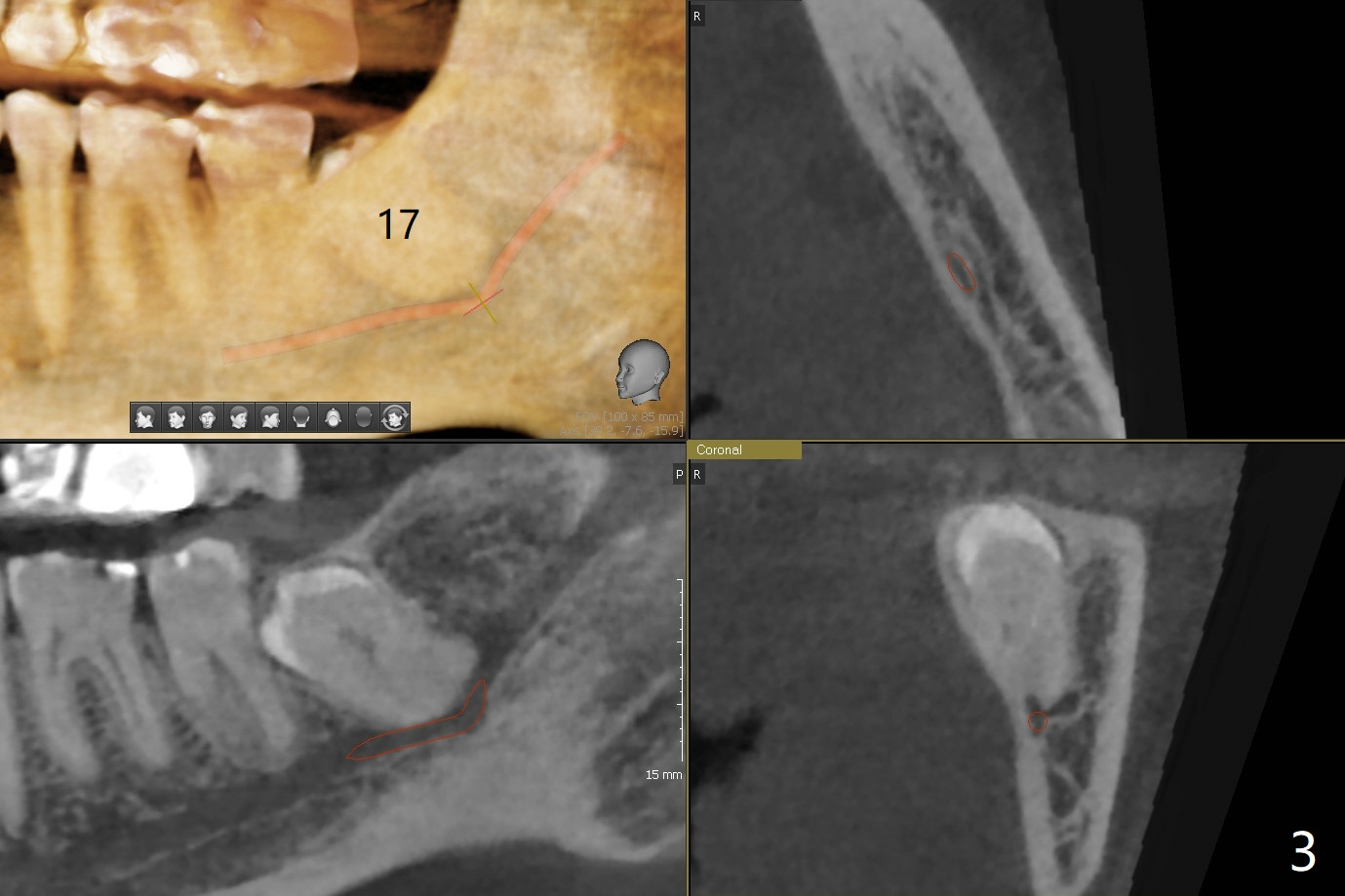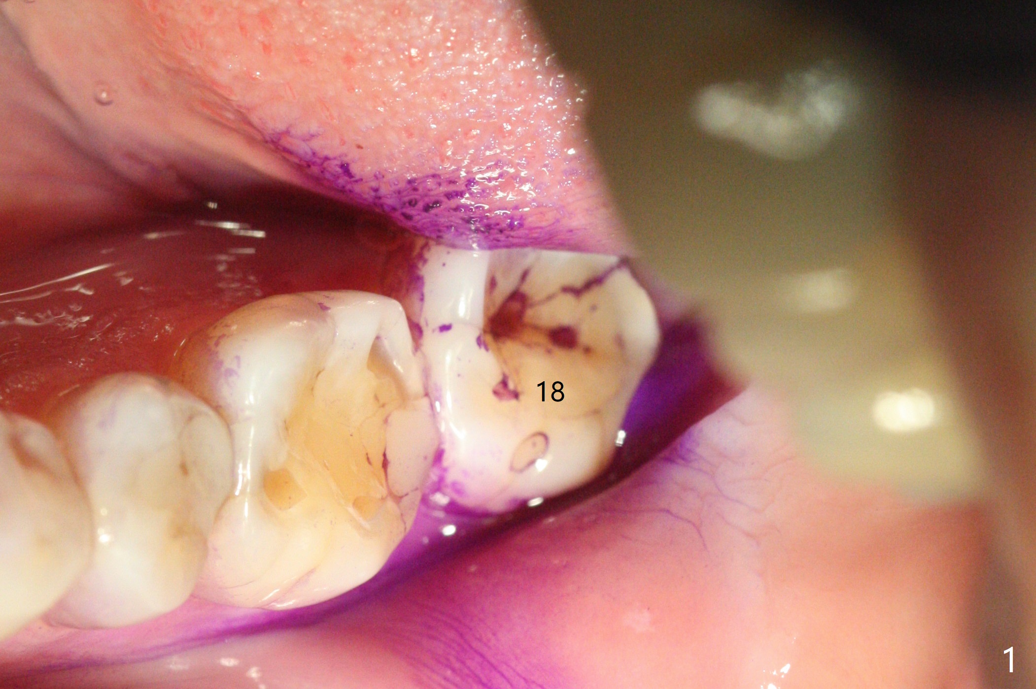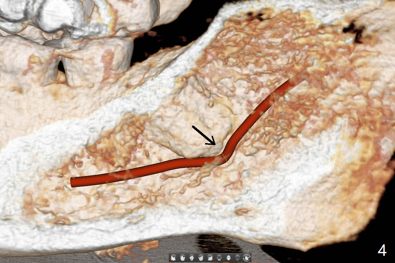 A 63-year-old woman wants to extract the tooth #18 with crack before termination of dental insurance (Fig.1). It is also possible to place an immediate implant in the septum (Fig.2). Socket shield is not needed because of the wide bone. If the implant is too close to the tooth #17, section the mesial portion of the latter (red dashed line), since removing the impacted tooth may risk injury to the Inferior Alveolar Canal (Fig.3,4). Draw one tube of blood for sticky bone.