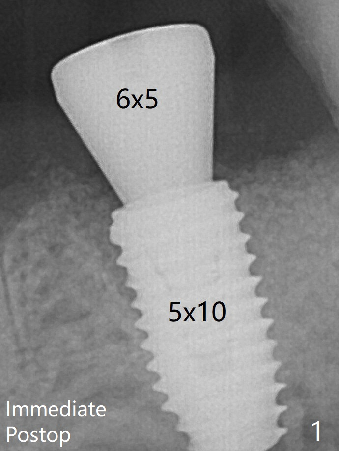 术后3个月,原来近中牙槽窝完全愈合(图二:*),放置5.5x5.7(3)毫米IBS基台,好像没有完全就位,