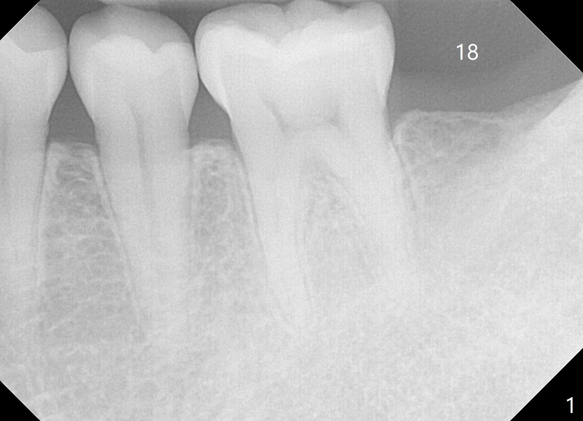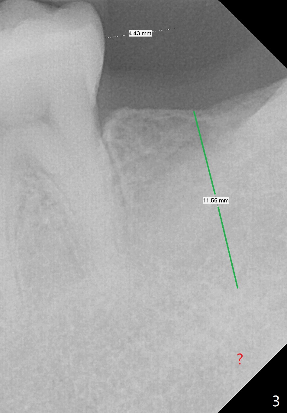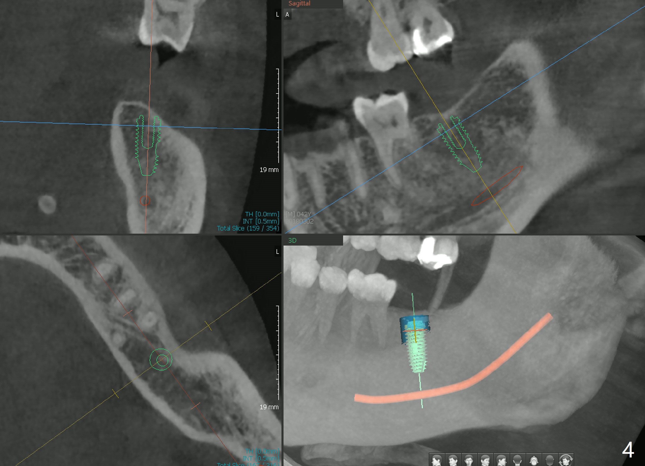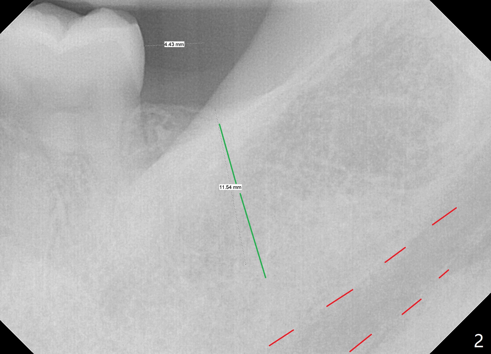 A 42-year-old man has lost #18 (due to 3rd molar impaction) for ~ 5 years (Fig.1). Because of the indistinct Inferior Alveolar Canal (Fig.3 ? vs. Fig.2 red dashed line), CBCT is taken for guided surgery (Fig.4: 5x11.5 mm).