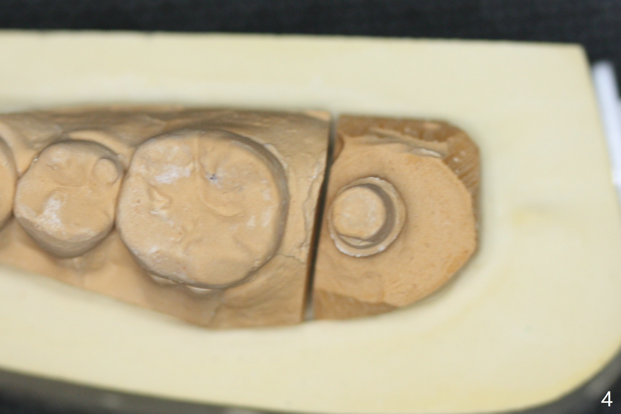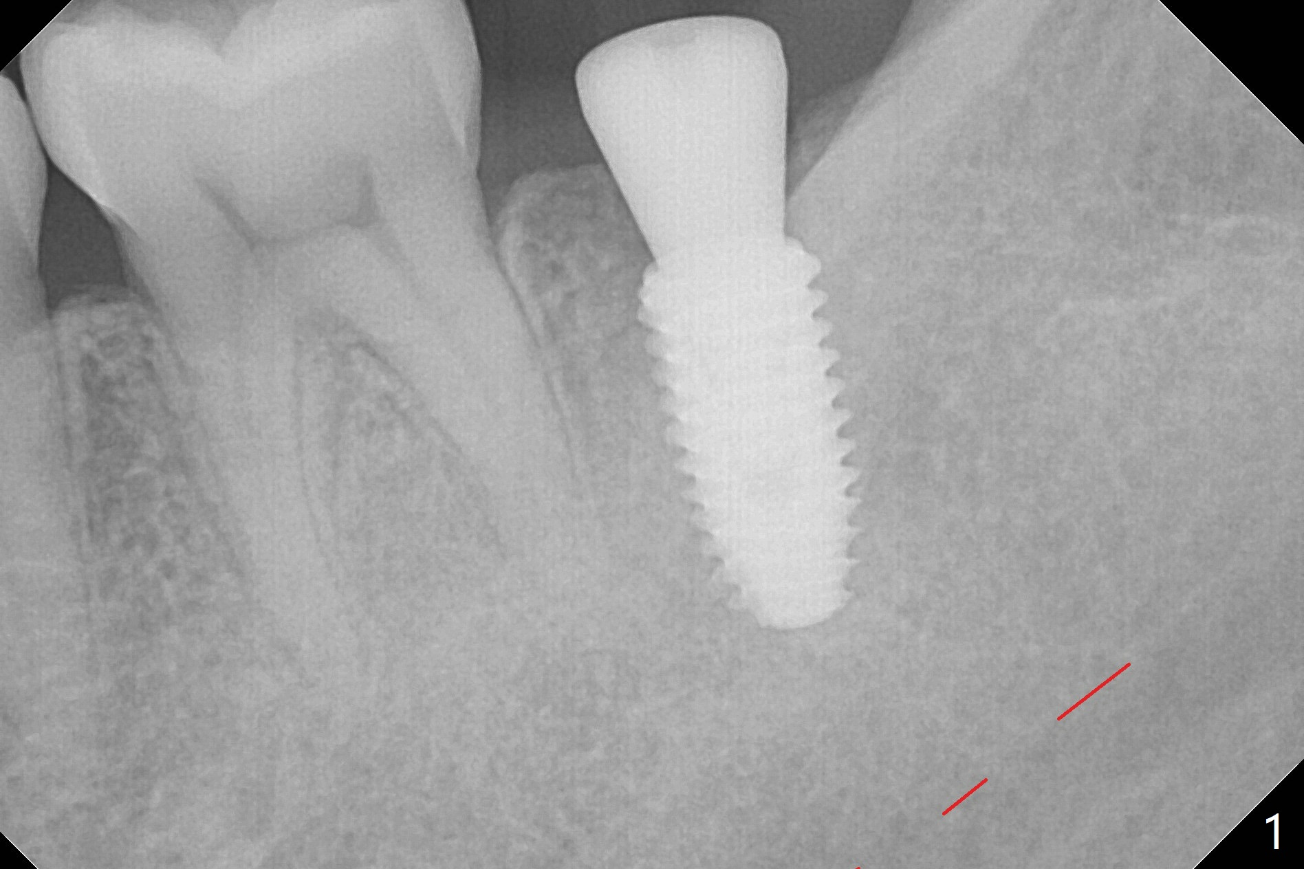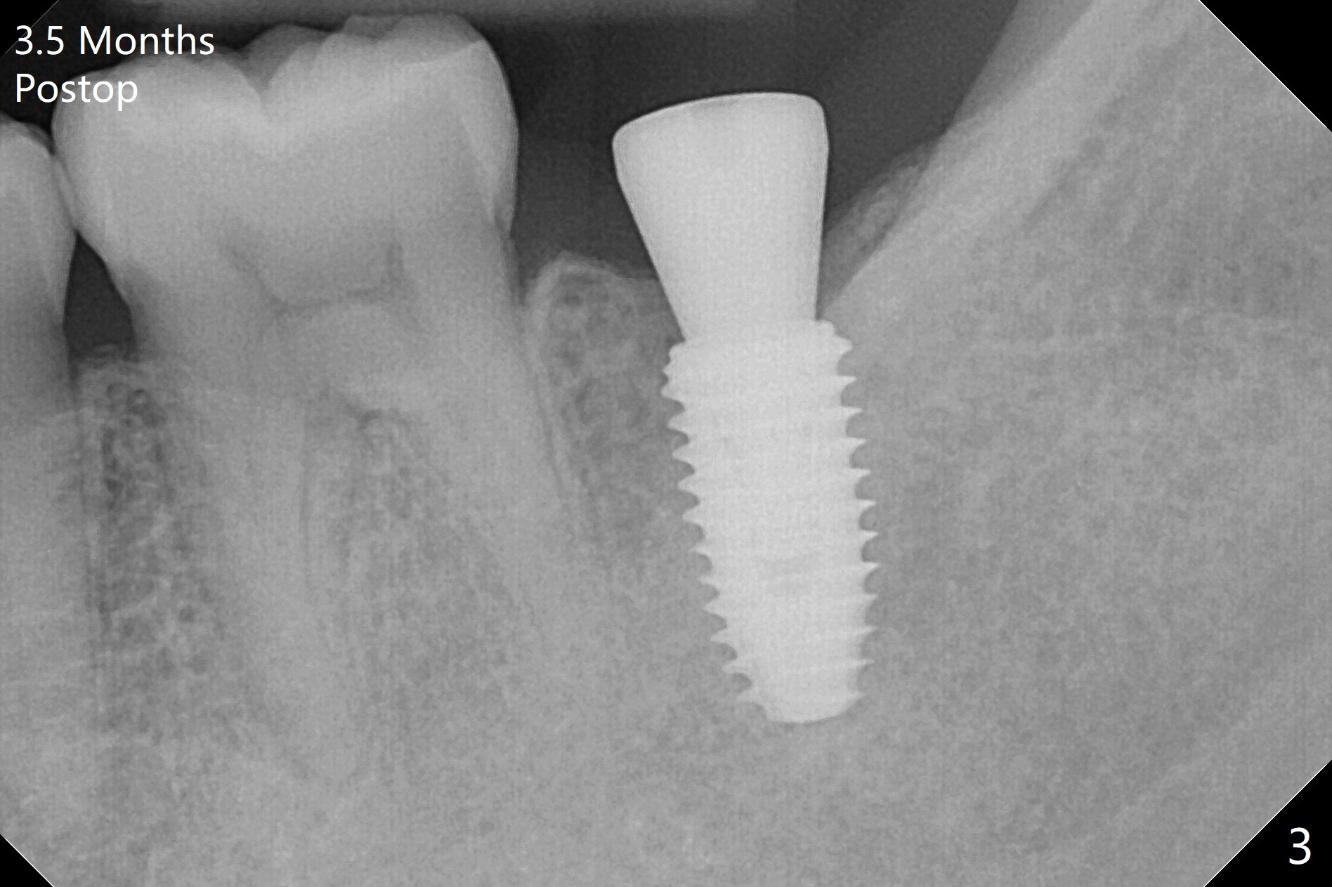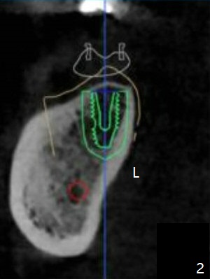 As usual, one ampule of 2% Xylocaine with 1:100,000 Epinephrine provides profound anesthesia and hemostasis at the site of #18. A 5x10 mm implant is placed with guided surgery in ~10 minutes. A shortage is low stability (10 Ncm), probably due to low bone density, which is not detected early (with increasing drill diameters). When a 5 mm tap is being used, there is basically no resistance. In fact the tap should be not used. When a 5.5x5 mm healing abutment is placed, hemostasis is achieved (Fig.1). There is sufficient clearance from the Inferior Alveolar Canal (red dashed line). More important is there is no risk of perforation of the lingual (L) plate as by design (Fig.2). There is no reported postop pain. There is no bone loss around the implant 3.5 months postop, which suggests that it is an atraumatic procedure (Fig.3). The all-purpose guide also allows neutral placement of the implant buccolingually (Fig.4), as compared to the partial one.
