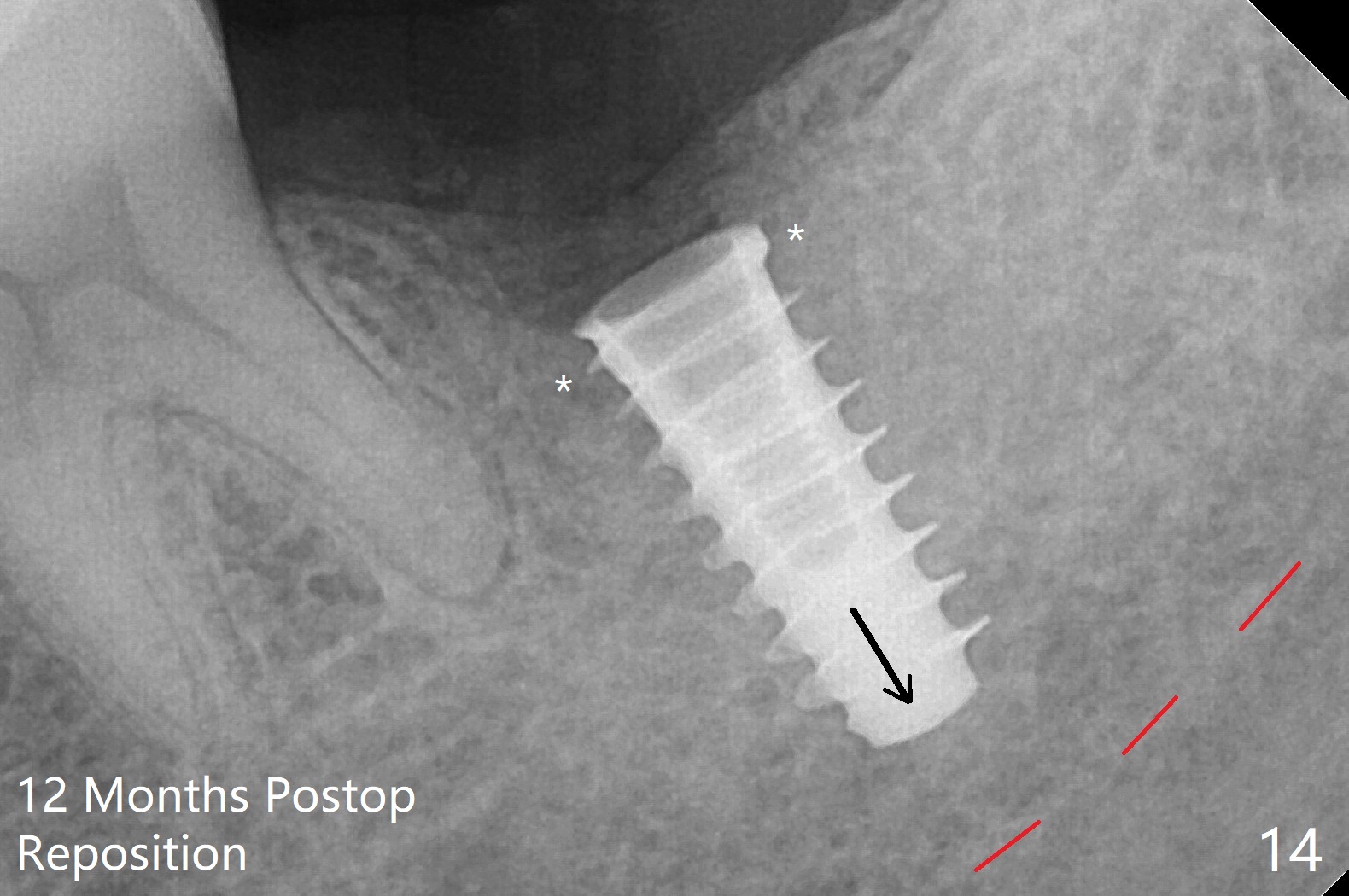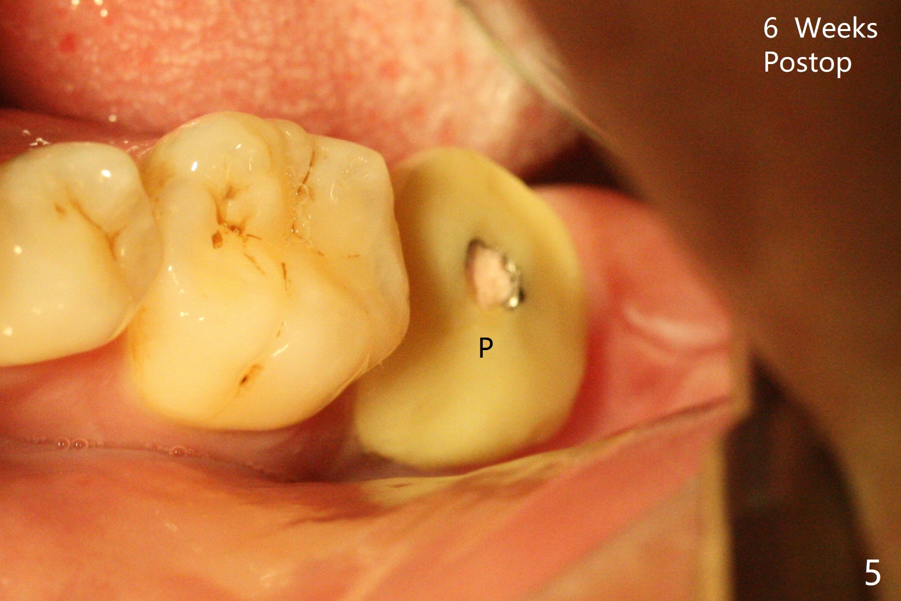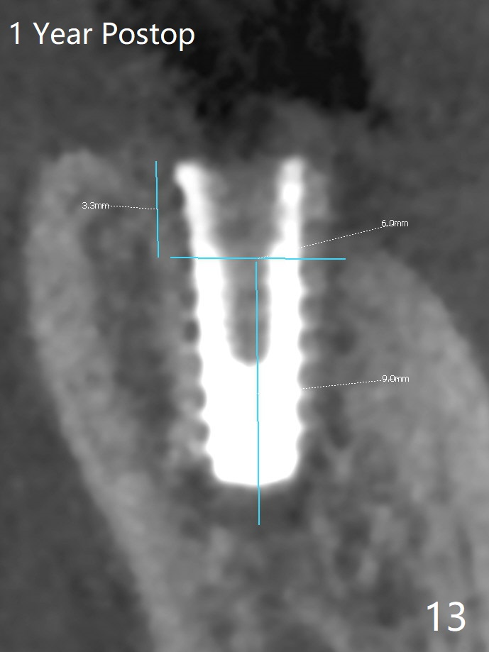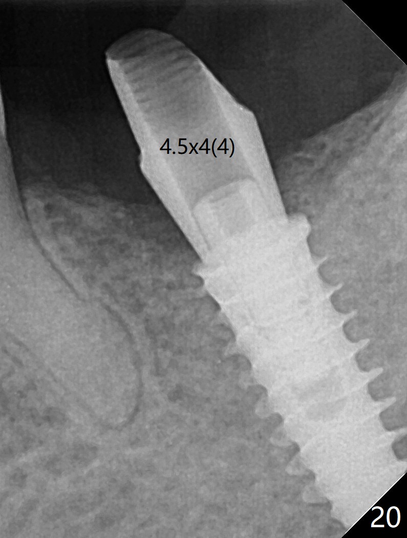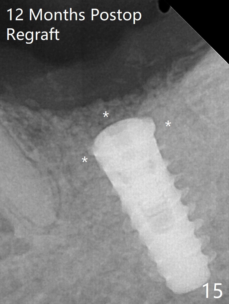 After placement of a 5x11 mm implant and cover screw at #18, allograft mixed with PRF (sticky bone) is placed in the peri-implant space, but it appears that bone density in the apical region (Fig.1 A) is lower than that in the coronal one (C) because of a constriction between the implant and the distal crest (*). Ideally the undercuts (Fig.2 *) of the extraction socket (black area) should be identified. Place bone graft in the undercuts (Fig.3 red circles) after osteotomy (white outlines) and before implant placement! A 4.5x1 mm temporary abutment is placed for an immediate provisional. The 2nd shortcoming of this case is that the implant is placed a little buccal. The papilla mesial to the immediate provisional (Fig.4 P) looks normal 4 days postop (no food impaction is expected when a final restoration is cemented). Additional acrylic (*) was placed to close a buccal gap when the provisional was seated with the temporary abutment. The patient reports loss of a piece of material in 4 days. It must be the additional acrylic, since it is absent 6 weeks postop (Fig.5). The provisional (Fig.5 P) looks wide, probably related to post-extraction gingiva and bone atrophy (Fig.6, 7 *). Bone graft (Fig.6 <) becomes a component of the gingival cuff. The provisional is re-trimmed for better oral hygiene. The gingival cuff is basically healthy 3.5 months postop, although the temporary abutment is loose and the implant is tender to rewinding and winding (Fig.8). The implant seems to remain non-osteointegrated 3.5 months postop (Fig.9). Although the bone density around the implant increases nearly 6 months postop (Fig.10), the implant remains tender when a 5x4(4) mm pair abutment is tightened. The healing abutment is reused. The bone density around the implant increases 11 months postop (Fig.11). Uncover is done with 5.5 mm profile drill. One month post uncover (12 months postop), the implant remains unstable (Fig.12). Prepare sticky bone x1. Make incision for exploration, including retightening the implant after Titanium brush and H2O2 Q-tip rubbing. If needed, a larger and shorter UF implant is a replacement (Fig.13). The implant is removed, cleaned with Titanium brushes and H2O2 in vitro and repositioned 12 months postop (Fig.14: arrow (gaps: post granulation tissue removal)). The gaps are regrafted with sticky bone and covered with PRF membrane and Cytoplast. Although the patient complains of severe pain the first 2-3 postop, the wound is apparently healing 12 days postop. The Cytoplast is exposed asymptomatic 5 weeks postop (Fig.16) and removed (Fig.17). The wound appears to have healed without loss of the bone graft (Fig.18).术后四个月伤口愈合,骨粉几乎没有丢失,有骨小梁形态(图十九:*)。切开,刮匙去骨,有一定硬度,即刻放置修复基台,完全就位(图二十),制备临时牙冠,牙周敷料固定组织瓣(没有缝线)。
