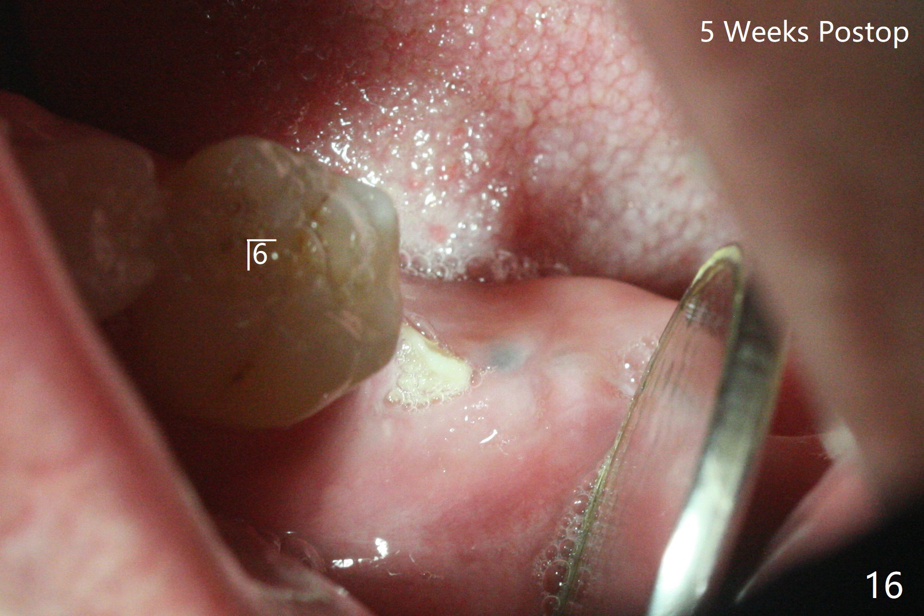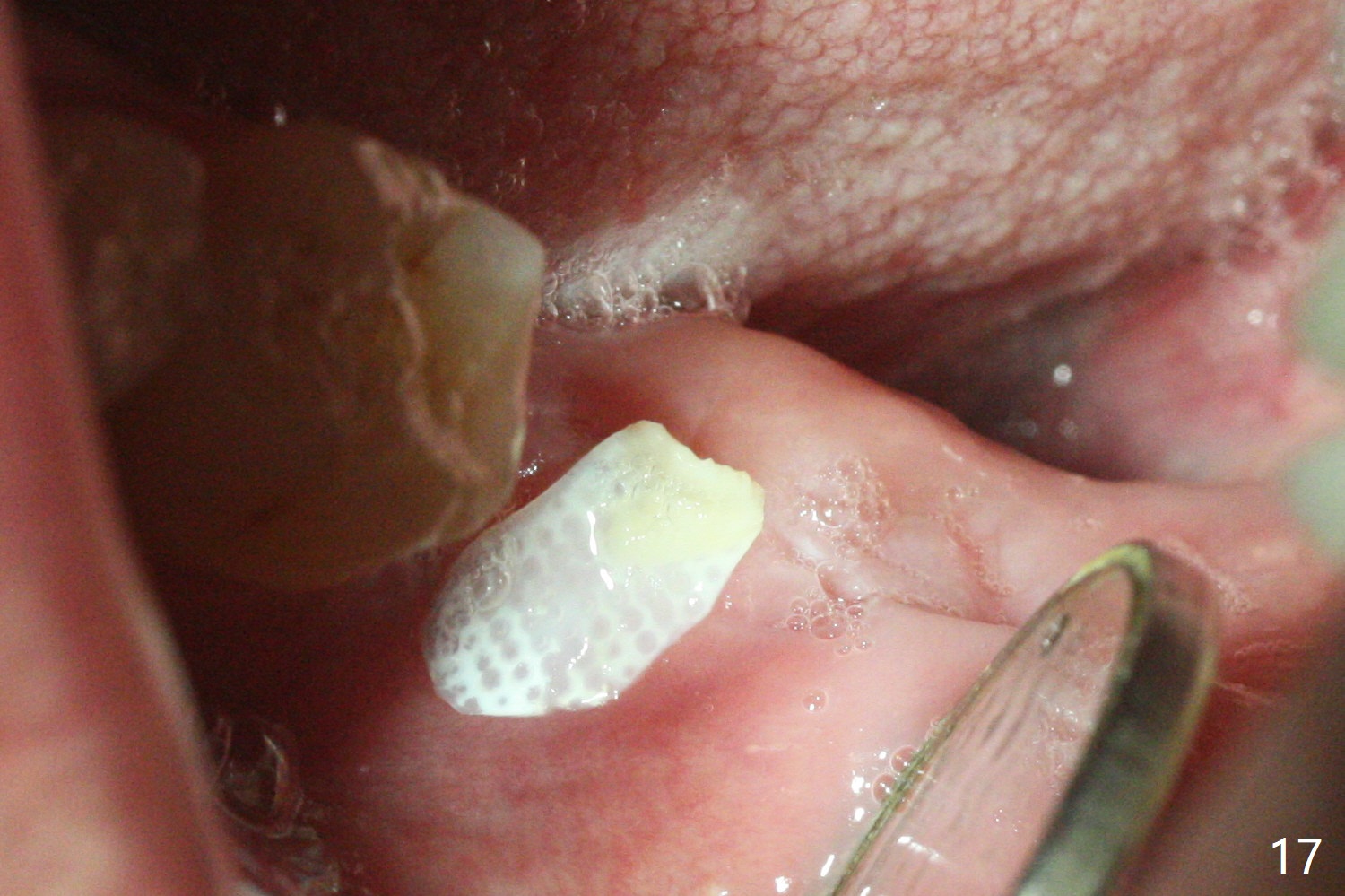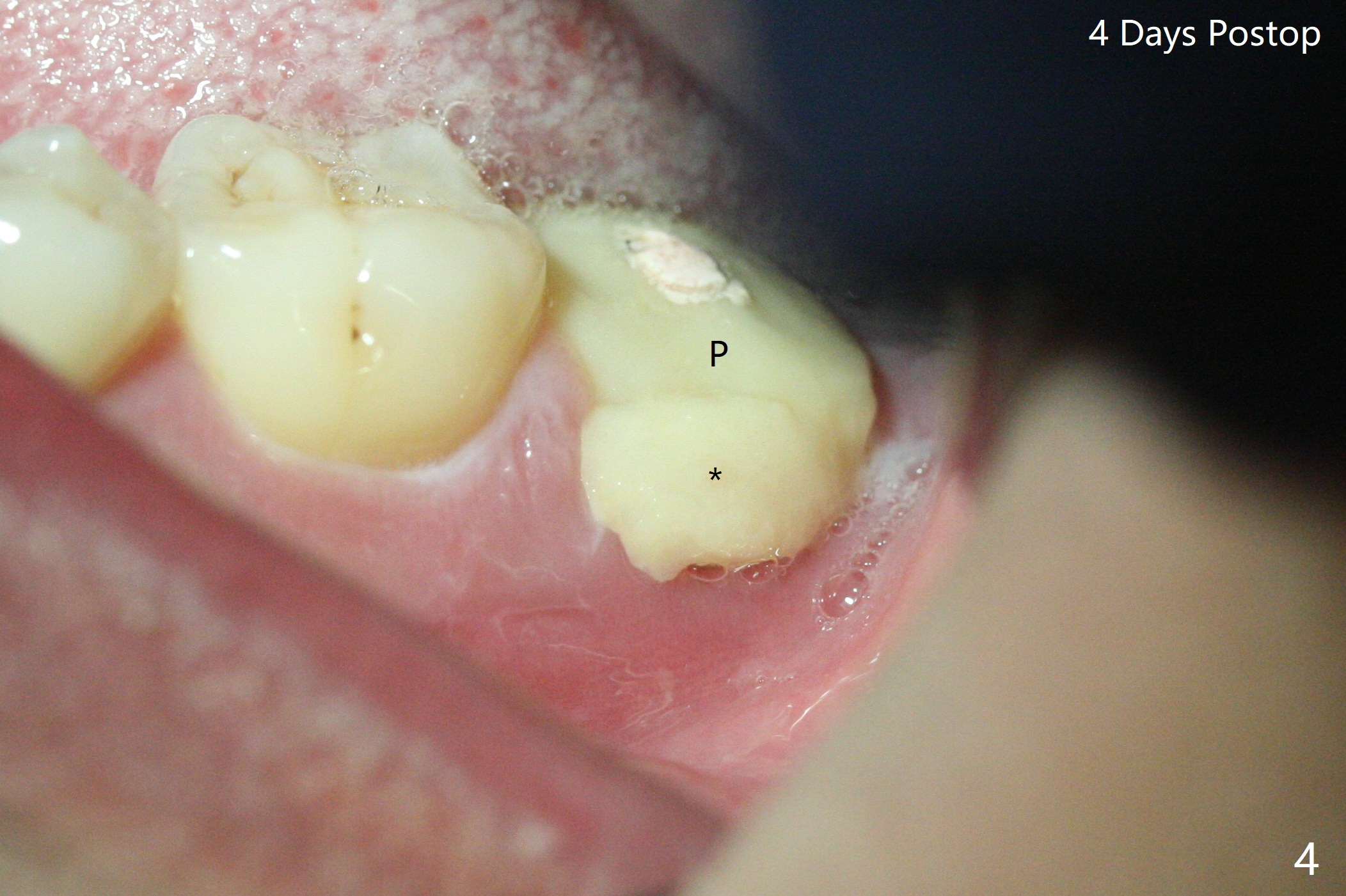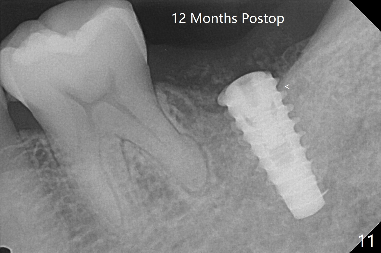After placement of a 5x11 mm implant and cover screw at #18, allograft mixed with PRF (sticky bone) is placed in the peri-implant space, but it appears that bone density in the apical region (Fig.1 A) is lower than that in the coronal one (C) because of a constriction between the implant and the distal crest (*). Ideally the undercuts (Fig.2 *) of the extraction socket (black area) should be identified. Place bone graft in the undercuts (Fig.3 red circles) after osteotomy (white outlines) and before implant placement! A 4.5x1 mm temporary abutment is placed for an immediate provisional. The 2nd shortcoming of this case is that the implant is placed a little buccal. The papilla mesial to the immediate provisional (Fig.4 P) looks normal 4 days postop (no food impaction is expected when a final restoration is cemented). Additional acrylic (*) was placed to close a buccal gap when the provisional was seated with the temporary abutment. The patient reports loss of a piece of material in 4 days. It must be the additional acrylic, since it is absent 6 weeks postop (Fig.5). The provisional (Fig.5 P) looks wide, probably related to post-extraction gingiva and bone atrophy (Fig.6, 7 *). Bone graft (Fig.6 <) becomes a component of the gingival cuff. The provisional is re-trimmed for better oral hygiene. The gingival cuff is basically healthy 3.5 months postop, although the temporary abutment is loose and the implant is tender to rewinding and winding (Fig.8). The implant seems to remain non-osteointegrated 3.5 months postop (Fig.9). Although the bone density around the implant increases nearly 6 months postop (Fig.10), the implant remains tender when a 5x4(4) mm pair abutment is tightened. The healing abutment is reused. The bone density around the implant increases 11 months postop (Fig.11). Uncover is done with 5.5 mm profile drill. One month post uncover (12 months postop), the implant remains unstable (Fig.12). Prepare sticky bone x1. Make incision for exploration, including retightening the implant after Titanium brush and H2O2 Q-tip rubbing. If needed, a larger and shorter UF implant is a replacement (Fig.13). The implant is removed, cleaned with Titanium brushes and H2O2 in vitro and repositioned 12 months postop (Fig.14: arrow (gaps: post granulation tissue removal)). The gaps are regrafted with sticky bone and covered with PRF membrane and Cytoplast. Although the patient complains of severe pain the first 2-3 postop, the wound is apparently healing 12 days postop. The Cytoplast is exposed asymptomatic 5 weeks postop (Fig.16) and removed (Fig.17). The wound appears to have healed without loss of the bone graft (Fig.18).术后四个月伤口愈合,骨粉几乎没有丢失,有骨小梁形态(图十九:*)。切开,刮匙去骨,有一定硬度,即刻放置修复基台,完全就位(图二十),制备临时牙冠,牙周敷料固定组织瓣(没有缝线)。