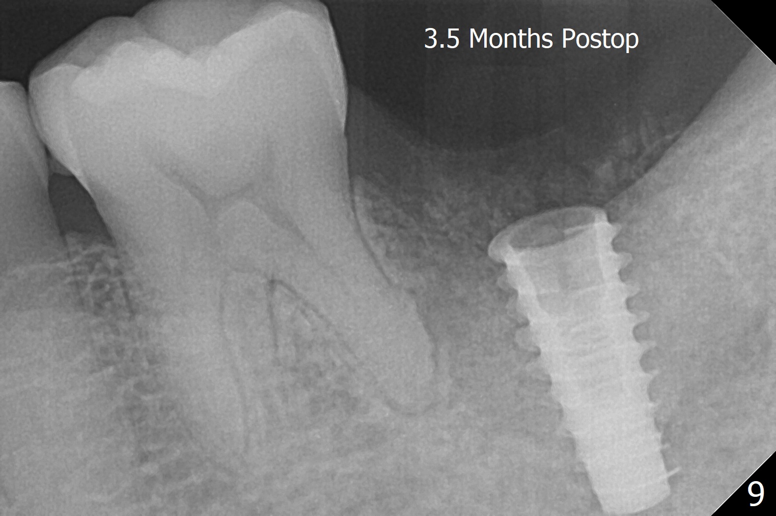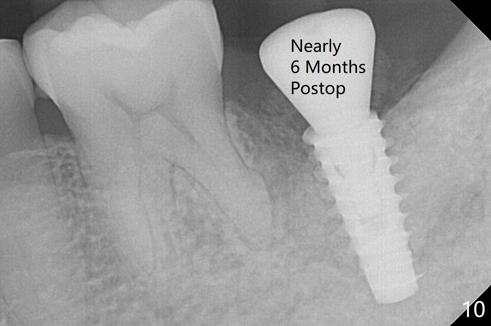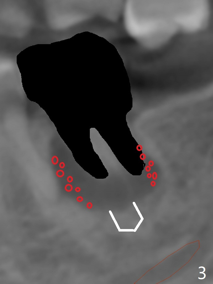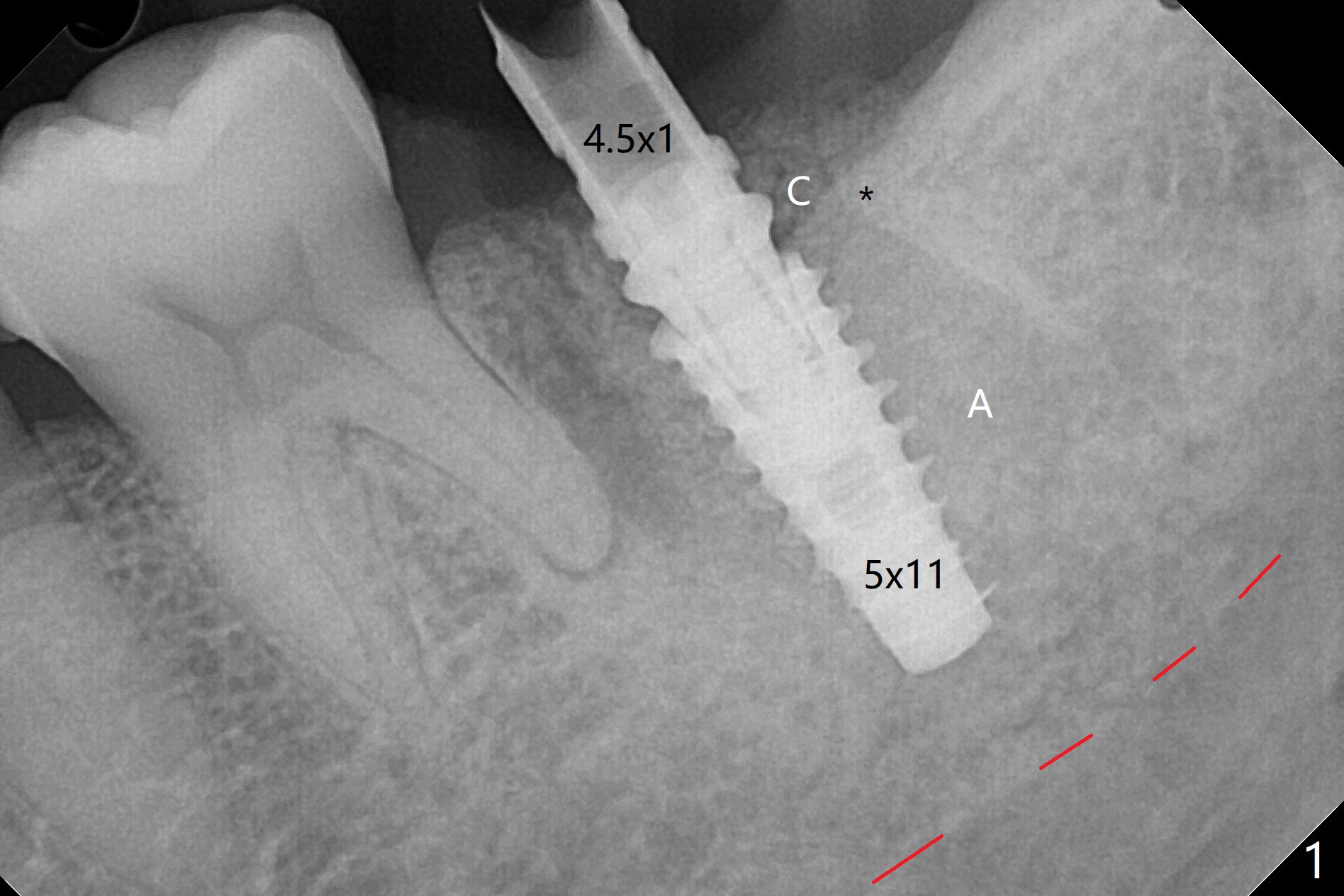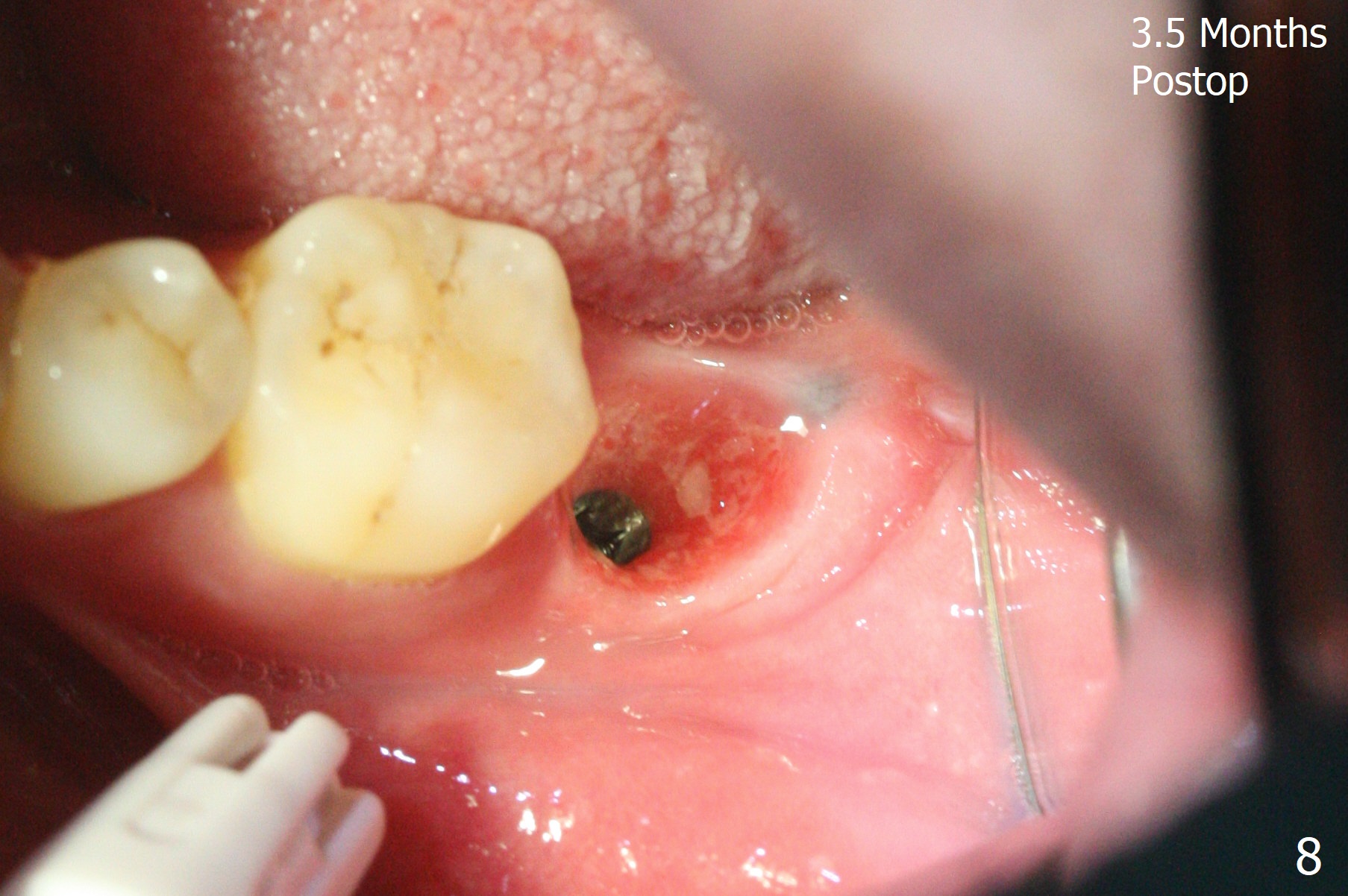 After placement of a 5x11 mm implant and cover screw at #18, allograft mixed with PRF (sticky bone) is placed in the peri-implant space, but it appears that bone density in the apical region (Fig.1 A) is lower than that in the coronal one (C) because of a constriction between the implant and the distal crest (*). Ideally the undercuts (Fig.2 *) of the extraction socket (black area) should be identified. Place bone graft in the undercuts (Fig.3 red circles) after osteotomy (white outlines) and before implant placement! A 4.5x1 mm temporary abutment is placed for an immediate provisional. The 2nd shortcoming of this case is that the implant is placed a little buccal. The papilla mesial to the immediate provisional (Fig.4 P) looks normal 4 days postop (no food impaction is expected when a final restoration is cemented). Additional acrylic (*) was placed to close a buccal gap when the provisional was seated with the temporary abutment. The patient reports loss of a piece of material in 4 days. It must be the additional acrylic, since it is absent 6 weeks postop (Fig.5). The provisional (Fig.5 P) looks wide, probably related to post-extraction gingiva and bone atrophy (Fig.6, 7 *). Bone graft (Fig.6 <) becomes a component of the gingival cuff. The provisional is re-trimmed for better oral hygiene. The gingival cuff is basically healthy 3.5 months postop, although the temporary abutment is loose and the implant is tender to rewinding and winding (Fig.8). The implant seems to remain non-osteointegrated 3.5 months postop (Fig.9). Although the bone density around the implant increases nearly 6 months postop (Fig.10), the implant remains tender when a 5x4(4) mm pair abutment is tightened. The healing abutment is reused. The bone density around the implant increases 11 months postop (Fig.11). Uncover is done with 5.5 mm profile drill. One month post uncover (12 months postop), the implant remains unstable (Fig.12). Prepare sticky bone x1. Make incision for exploration, including retightening the implant after Titanium brush and H2O2 Q-tip rubbing. If needed, a larger and shorter UF implant is a replacement (Fig.13). The implant is removed, cleaned with Titanium brushes and H2O2 in vitro and repositioned 12 months postop (Fig.14: arrow (gaps: post granulation tissue removal)). The gaps are regrafted with sticky bone and covered with PRF membrane and Cytoplast. Although the patient complains of severe pain the first 2-3 postop, the wound is apparently healing 12 days postop. The Cytoplast is exposed asymptomatic 5 weeks postop (Fig.16) and removed (Fig.17). The wound appears to have healed without loss of the bone graft (Fig.18).术后四个月伤口愈合,骨粉几乎没有丢失,有骨小梁形态(图十九:*)。切开,刮匙去骨,有一定硬度,即刻放置修复基台,完全就位(图二十),制备临时牙冠,牙周敷料固定组织瓣(没有缝线)。