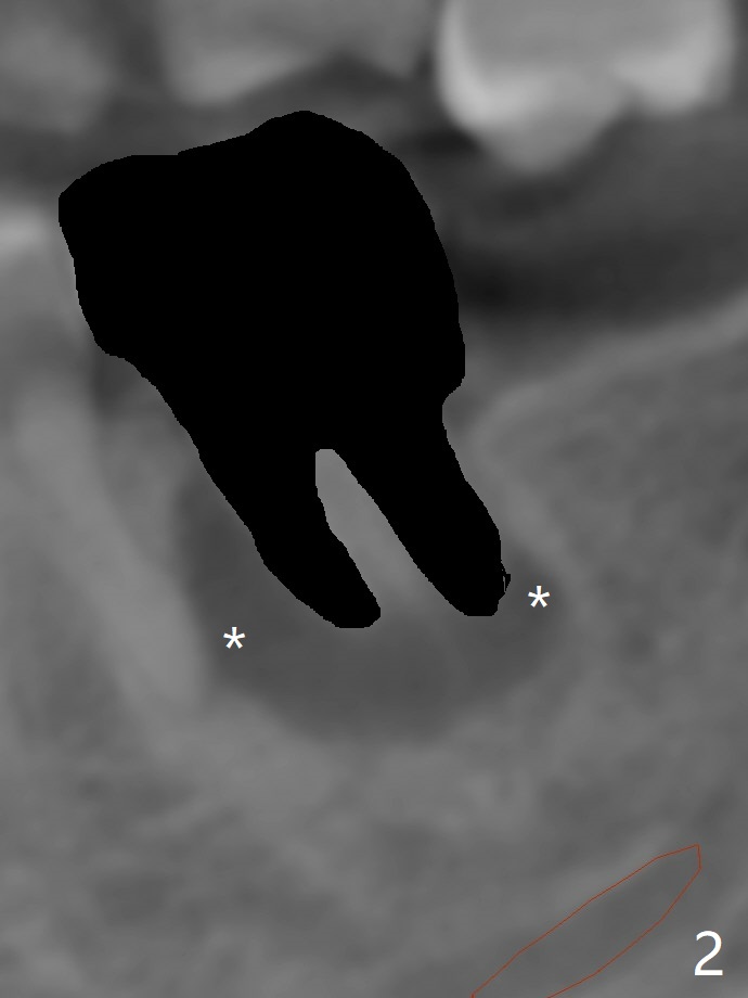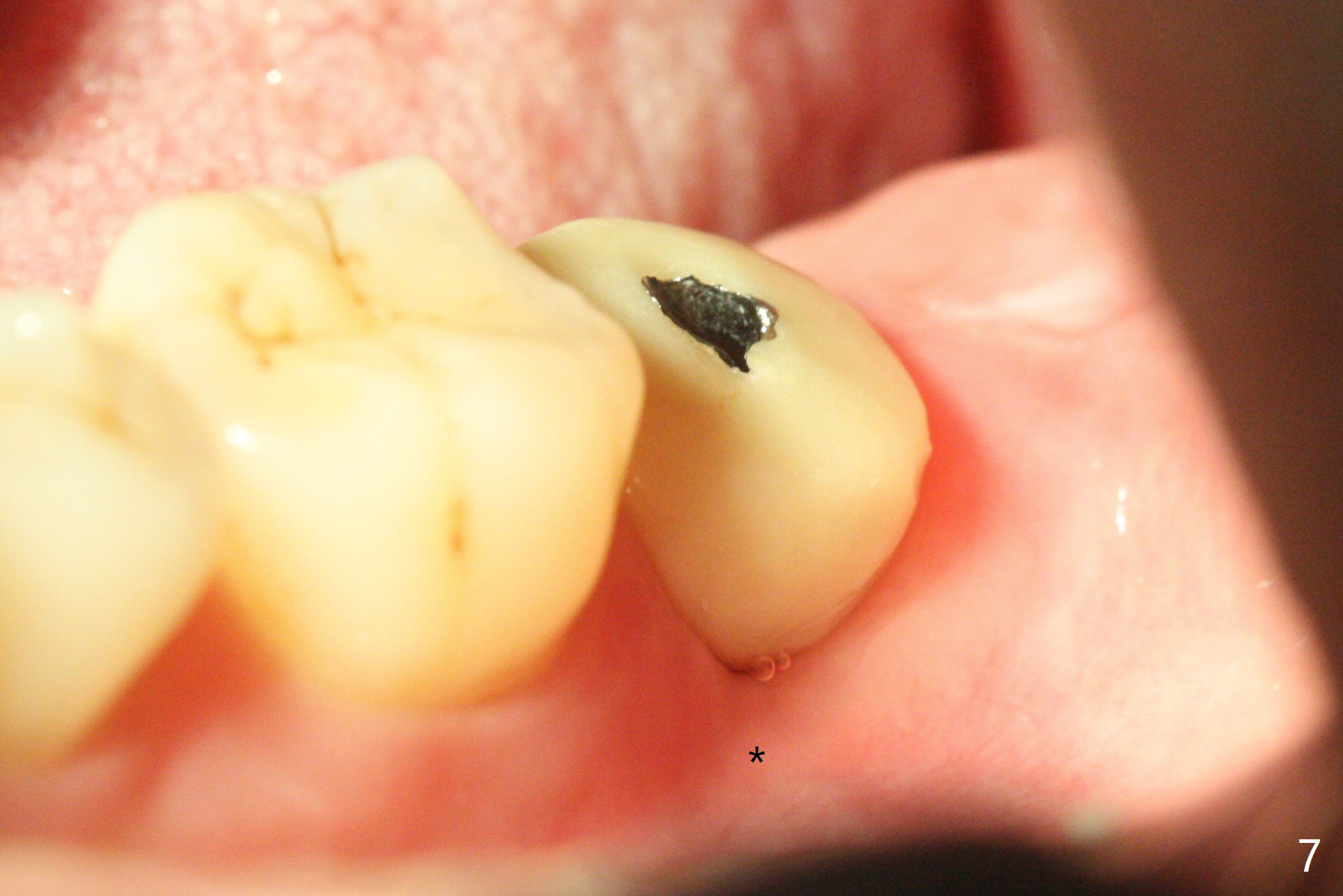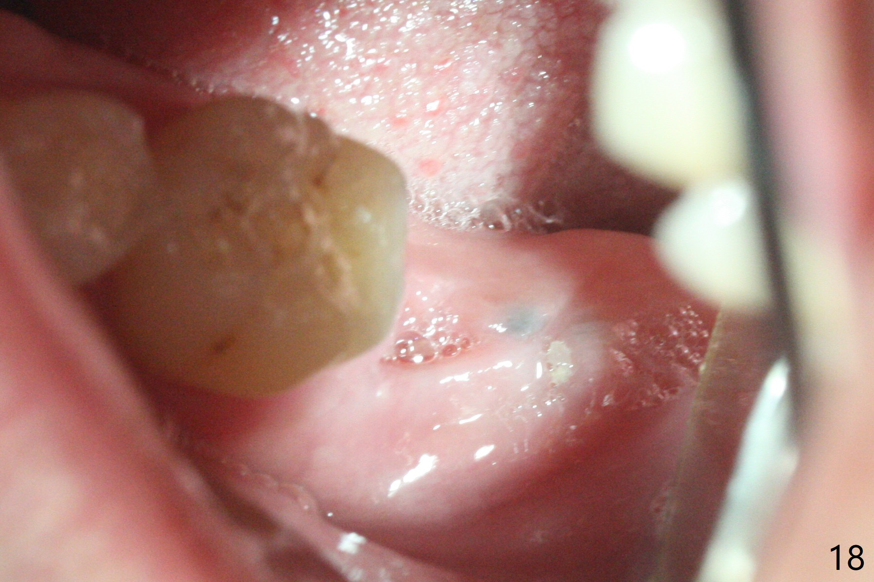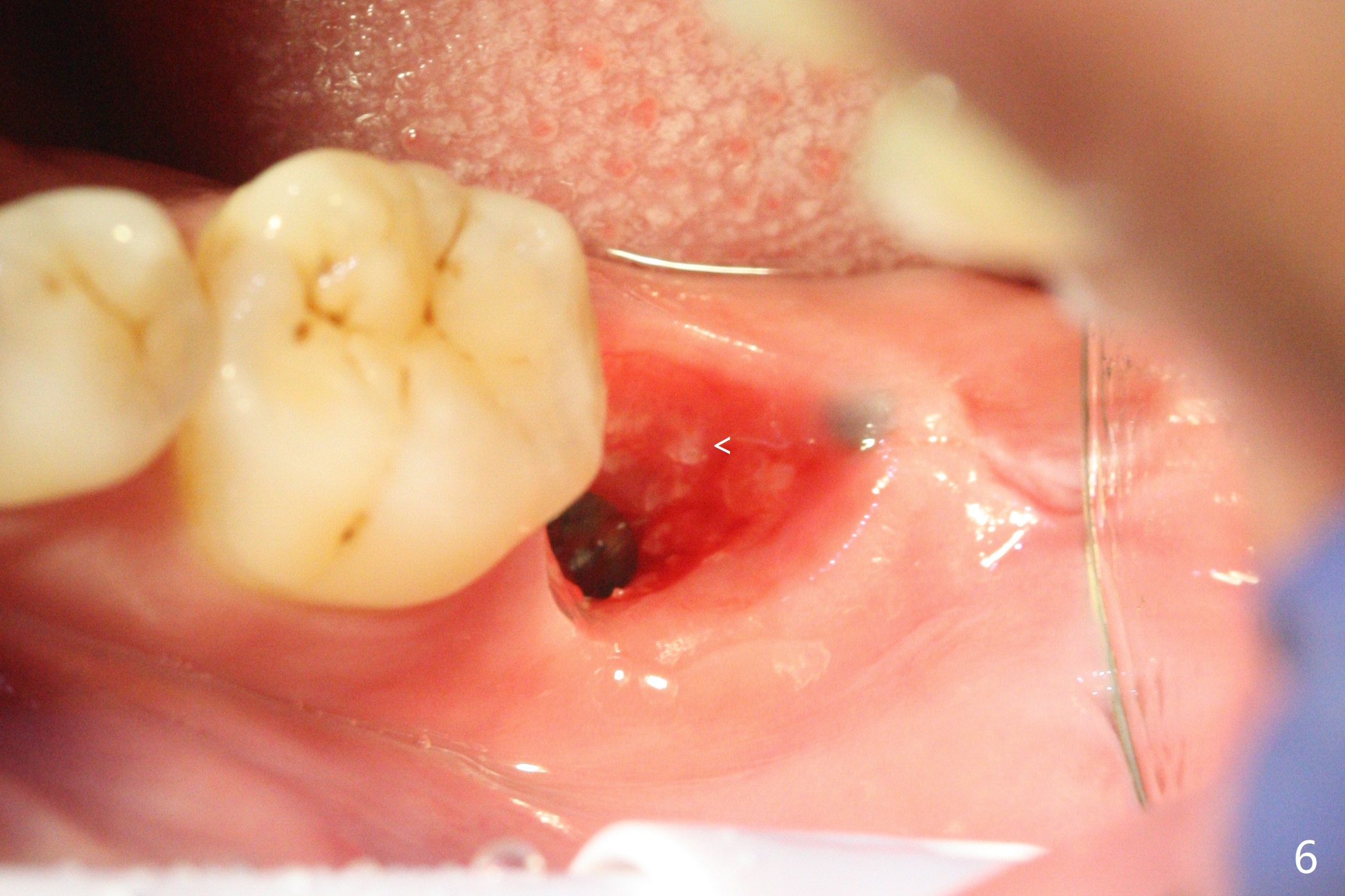 After placement of a 5x11 mm implant and cover screw at #18, allograft mixed with PRF (sticky bone) is placed in the peri-implant space, but it appears that bone density in the apical region (Fig.1 A) is lower than that in the coronal one (C) because of a constriction between the implant and the distal crest (*). Ideally the undercuts (Fig.2 *) of the extraction socket (black area) should be identified. Place bone graft in the undercuts (Fig.3 red circles) after osteotomy (white outlines) and before implant placement! A 4.5x1 mm temporary abutment is placed for an immediate provisional. The 2nd shortcoming of this case is that the implant is placed a little buccal. The papilla mesial to the immediate provisional (Fig.4 P) looks normal 4 days postop (no food impaction is expected when a final restoration is cemented). Additional acrylic (*) was placed to close a buccal gap when the provisional was seated with the temporary abutment. The patient reports loss of a piece of material in 4 days. It must be the additional acrylic, since it is absent 6 weeks postop (Fig.5). The provisional (Fig.5 P) looks wide, probably related to post-extraction gingiva and bone atrophy (Fig.6, 7 *). Bone graft (Fig.6 <) becomes a component of the gingival cuff. The provisional is re-trimmed for better oral hygiene. The gingival cuff is basically healthy 3.5 months postop, although the temporary abutment is loose and the implant is tender to rewinding and winding (Fig.8). The implant seems to remain non-osteointegrated 3.5 months postop (Fig.9). Although the bone density around the implant increases nearly 6 months postop (Fig.10), the implant remains tender when a 5x4(4) mm pair abutment is tightened. The healing abutment is reused. The bone density around the implant increases 11 months postop (Fig.11). Uncover is done with 5.5 mm profile drill. One month post uncover (12 months postop), the implant remains unstable (Fig.12). Prepare sticky bone x1. Make incision for exploration, including retightening the implant after Titanium brush and H2O2 Q-tip rubbing. If needed, a larger and shorter UF implant is a replacement (Fig.13). The implant is removed, cleaned with Titanium brushes and H2O2 in vitro and repositioned 12 months postop (Fig.14: arrow (gaps: post granulation tissue removal)). The gaps are regrafted with sticky bone and covered with PRF membrane and Cytoplast. Although the patient complains of severe pain the first 2-3 postop, the wound is apparently healing 12 days postop. The Cytoplast is exposed asymptomatic 5 weeks postop (Fig.16) and removed (Fig.17). The wound appears to have healed without loss of the bone graft (Fig.18).术后四个月伤口愈合,骨粉几乎没有丢失,有骨小梁形态(图十九:*)。切开,刮匙去骨,有一定硬度,即刻放置修复基台,完全就位(图二十),制备临时牙冠,牙周敷料固定组织瓣(没有缝线)。