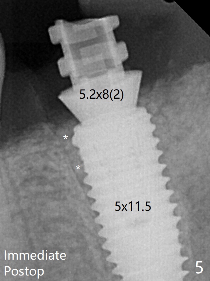 术后即刻近中牙槽窝间隙由粘性骨粉充填(图五:*(5.2x8(2)毫米临时基台)),四个月后间隙消失(硬骨板也消失,图七),5.2x5(3)毫米粘固基台似乎没有完全就位,可能因为远中牙槽嵴阻挡(图七:*)。可以使用profile drill,但是必须打麻药,出血。