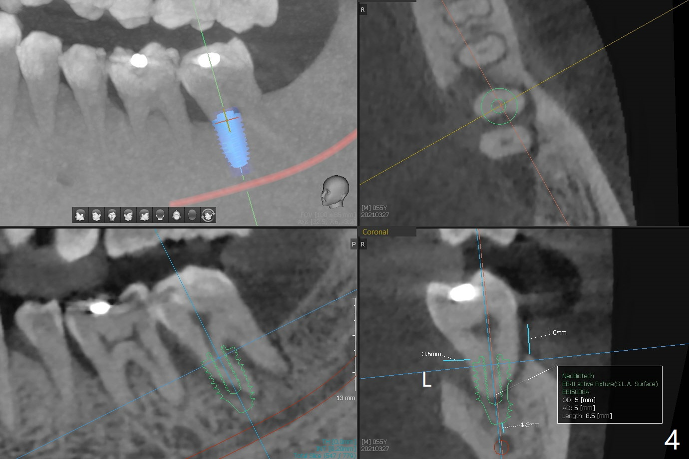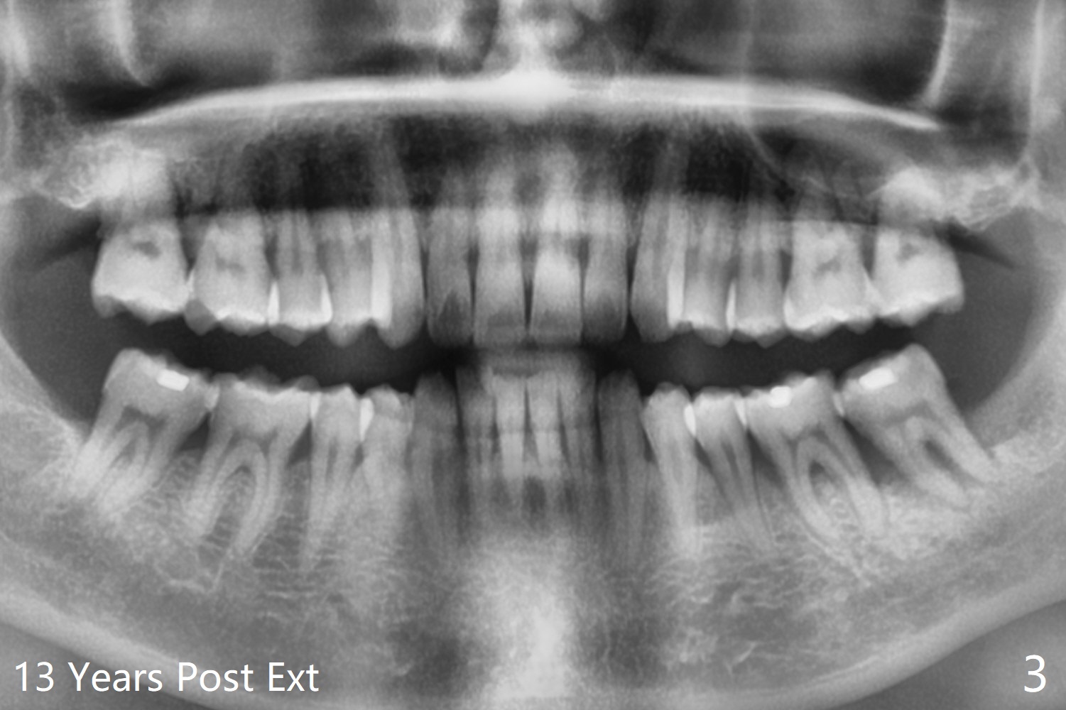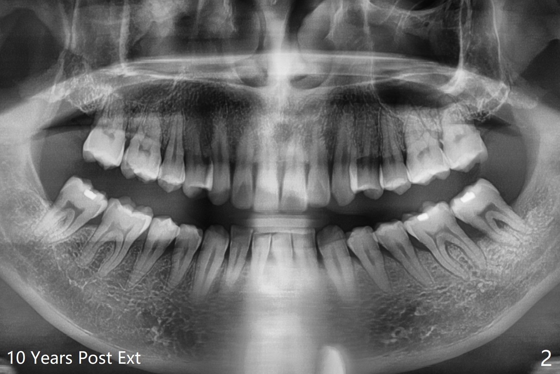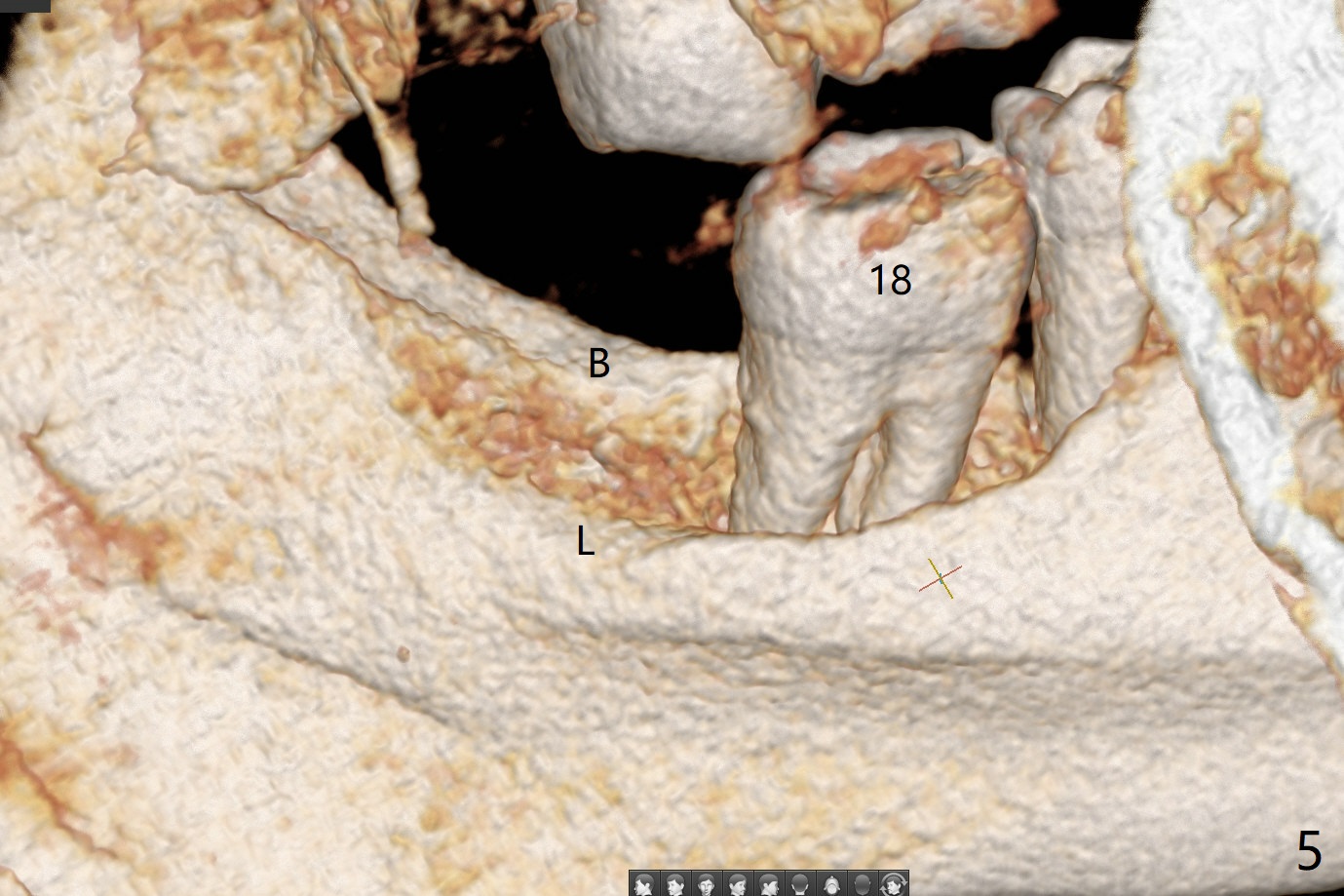 55岁男13年前就诊深洗同时拔除左下智齿(第二第三磨牙之间无骨,图一),拔除后没有植骨。十年后第二磨牙远中出现骨缺损(图二),十三年后第二磨牙松动(图三),需要拔除种植(图四)。其实当年拔除后必须植骨(图一’:红色 (白色:膜或者塞)),甚至种植(图一”:绿色),植骨。Thirteen years post #17 extraction, the lingual plate (L) is lower than the buccal one (B). Return to Prevent Molar Periimplantitis (Protocols, Table) No Caries No Antibiotic Plug 提升 手术 Xin Wei, DDS, PhD, MS 1st edition 03/27/2021, last revision 05/31/2021