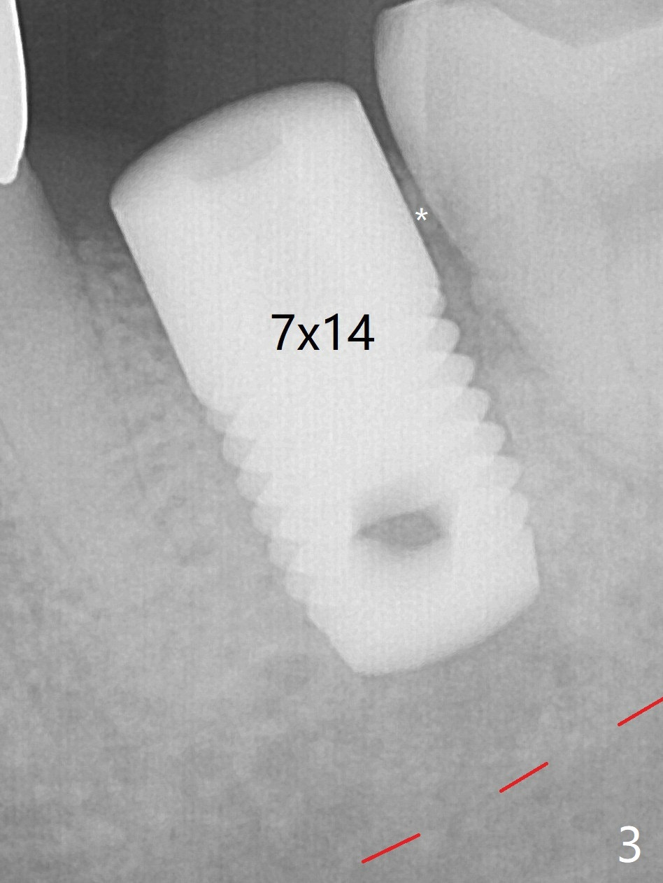 A 7x14 mm tissue-level implant is placed with ~45 Ncm (still not secure) with Vanilla graft placed mainly distolingually (Fig.3). A healing screw is placed then, followed by periodontal dressing. The red dashed line: the superior border of the Inferior Alveolar Canal. The soft and hard tissues appear to heal 3 months postop (Fig.5,6).