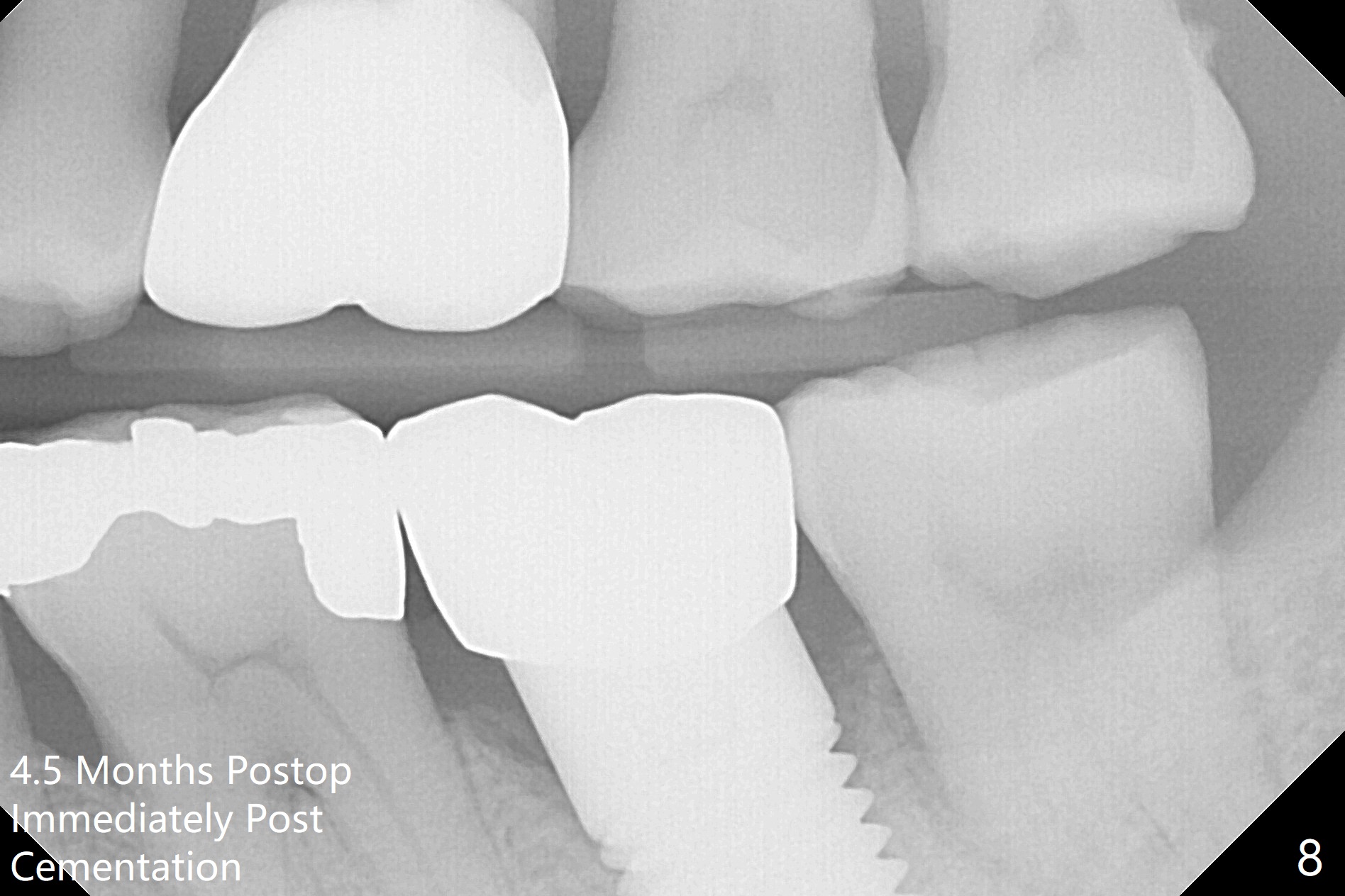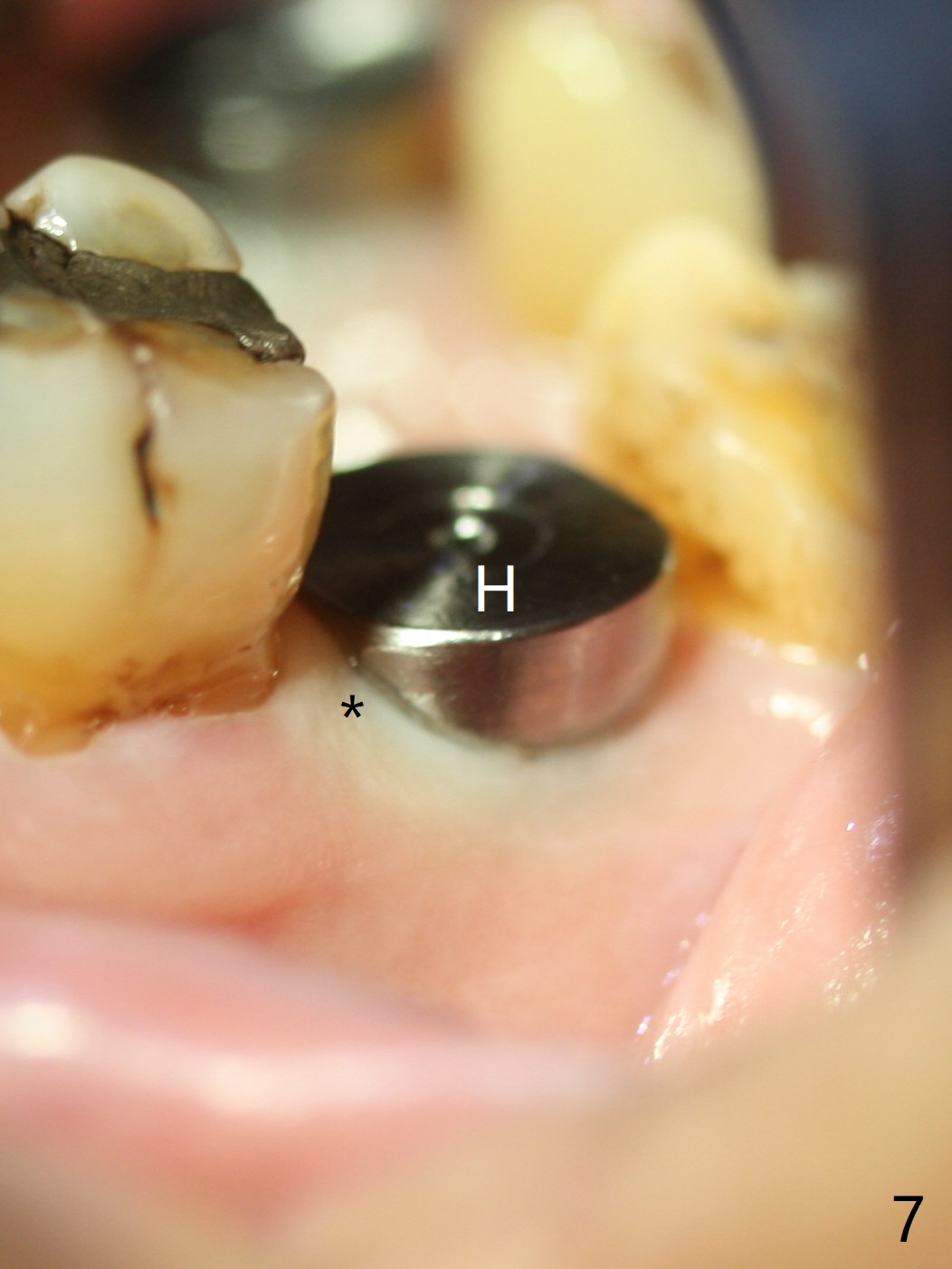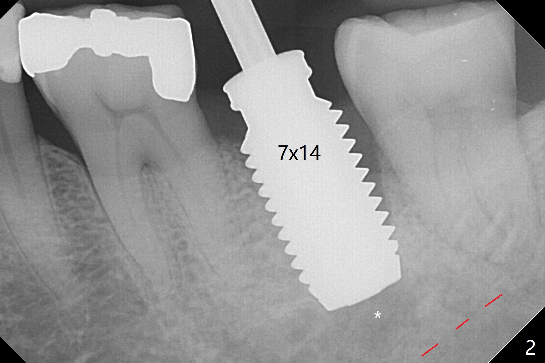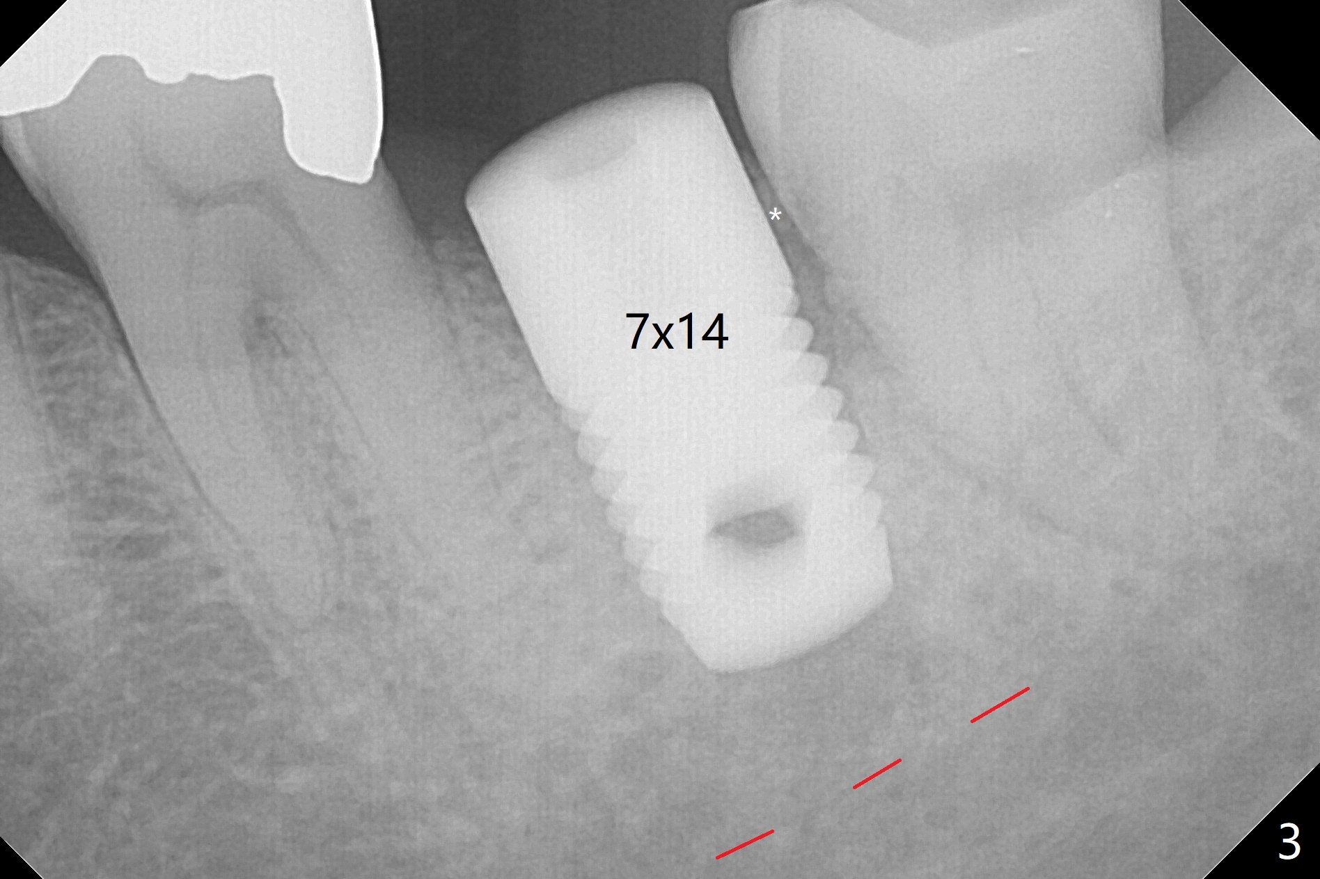 When the mobile tooth #18 with apical granulation tissue is extracted, the socket is large and long (close to the Inferior Alveolar Canal (Fig.2,3 red dashed line). Without drilling, a 7 mm bone level tap does not obtain stability. A 8x17 mm tapered tap reaches the bottom of the socket with minimal stability, but coronally it is close to the tooth #32 (Fig.1). When a 7x14 mm cylindrical tap is placed, it is shy of the bottom of the socket (Fig.2 *), but the trajectory improves. A 7x14 mm tissue-level implant is placed with ~45 Ncm (still not secure) with Vanilla graft placed mainly distolingually (Fig.3). With the large implant, the socket is closed 8 days postop (Fig.4). The soft and hard tissues appear to heal 3 months postop (Fig.5,6). A healing abutment (Fig.7 H) is placed to push the mesial papilla mesially (*). Two weeks later impression is taken with ease because of the healing abutment. There is no bone loss 4.5 months postop (immediately post cementation, Fig.8).