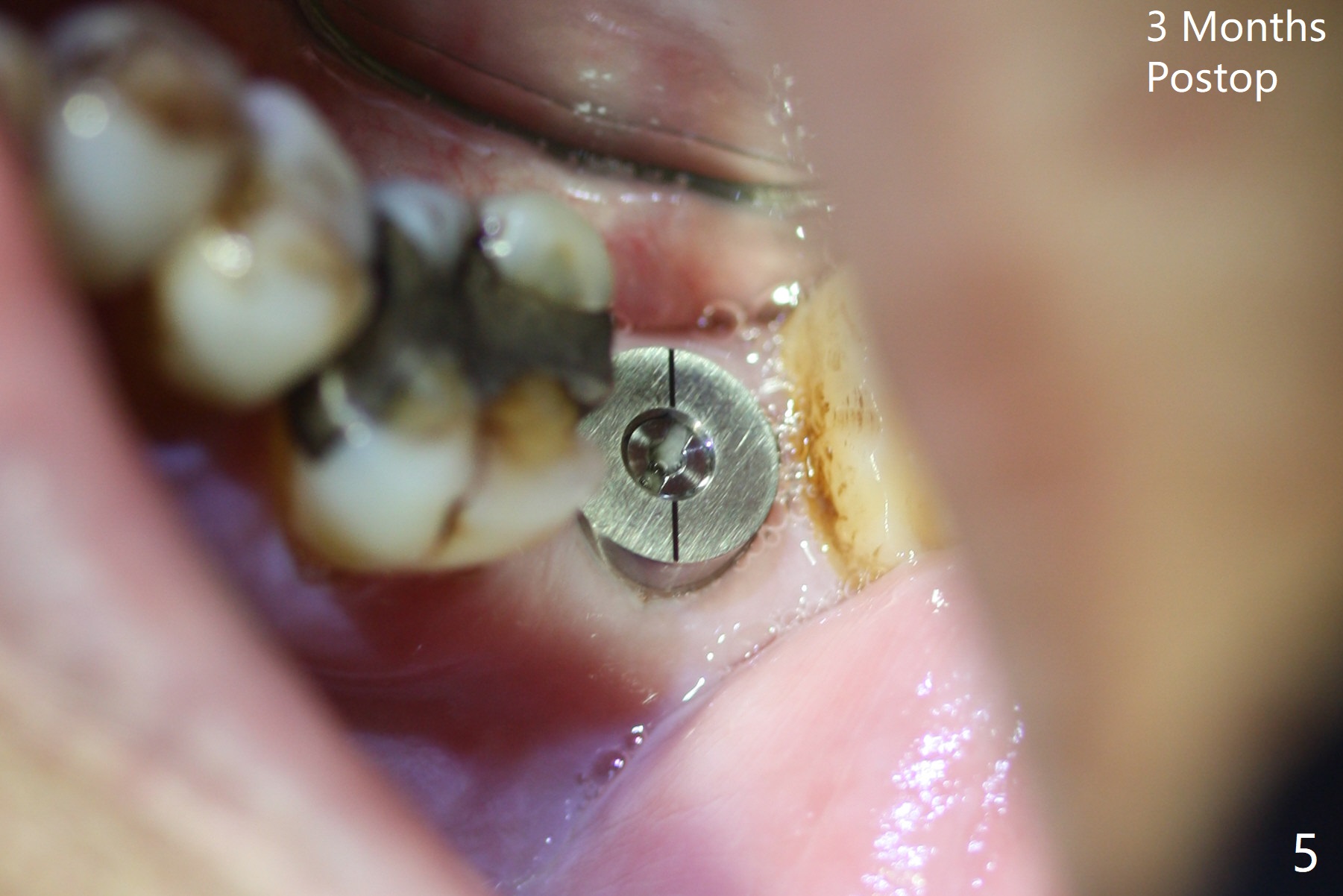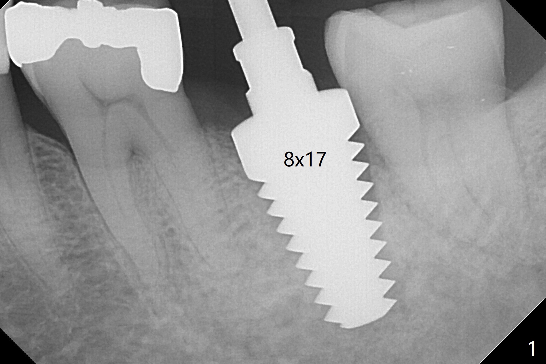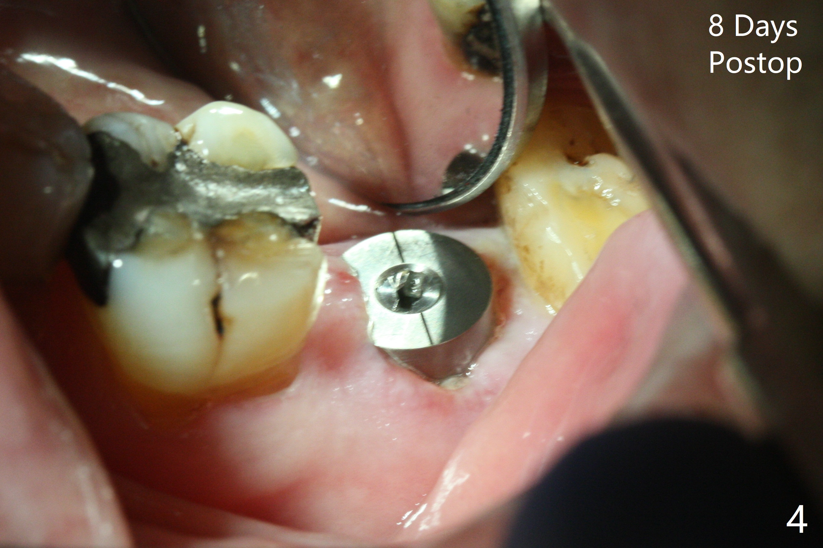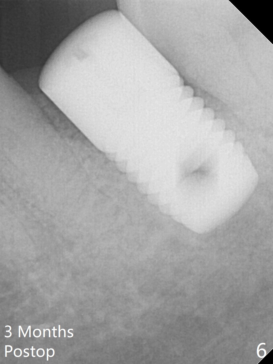 When the mobile tooth #18 with apical granulation tissue is extracted, the socket is large and long (close to the Inferior Alveolar Canal (Fig.2,3 red dashed line). Without drilling, a 7 mm bone level tap does not obtain stability. A 8x17 mm tapered tap reaches the bottom of the socket with minimal stability, but coronally it is close to the tooth #32 (Fig.1). When a 7x14 mm cylindrical tap is placed, it is shy of the bottom of the socket (Fig.2 *), but the trajectory improves. A 7x14 mm tissue-level implant is placed with ~45 Ncm (still not secure) with Vanilla graft placed mainly distolingually (Fig.3). With the large implant, the socket is closed 8 days postop (Fig.4). The soft and hard tissues appear to heal 3 months postop (Fig.5,6). A healing abutment (Fig.7 H) is placed to push the mesial papilla mesially (*). Two weeks later impression is taken with ease because of the healing abutment. There is no bone loss 4.5 months postop (immediately post cementation, Fig.8).