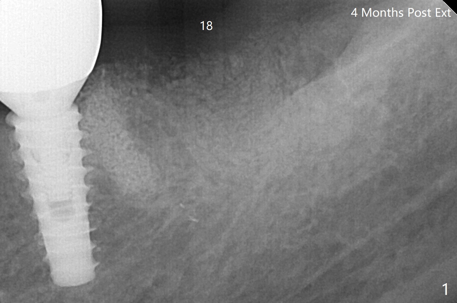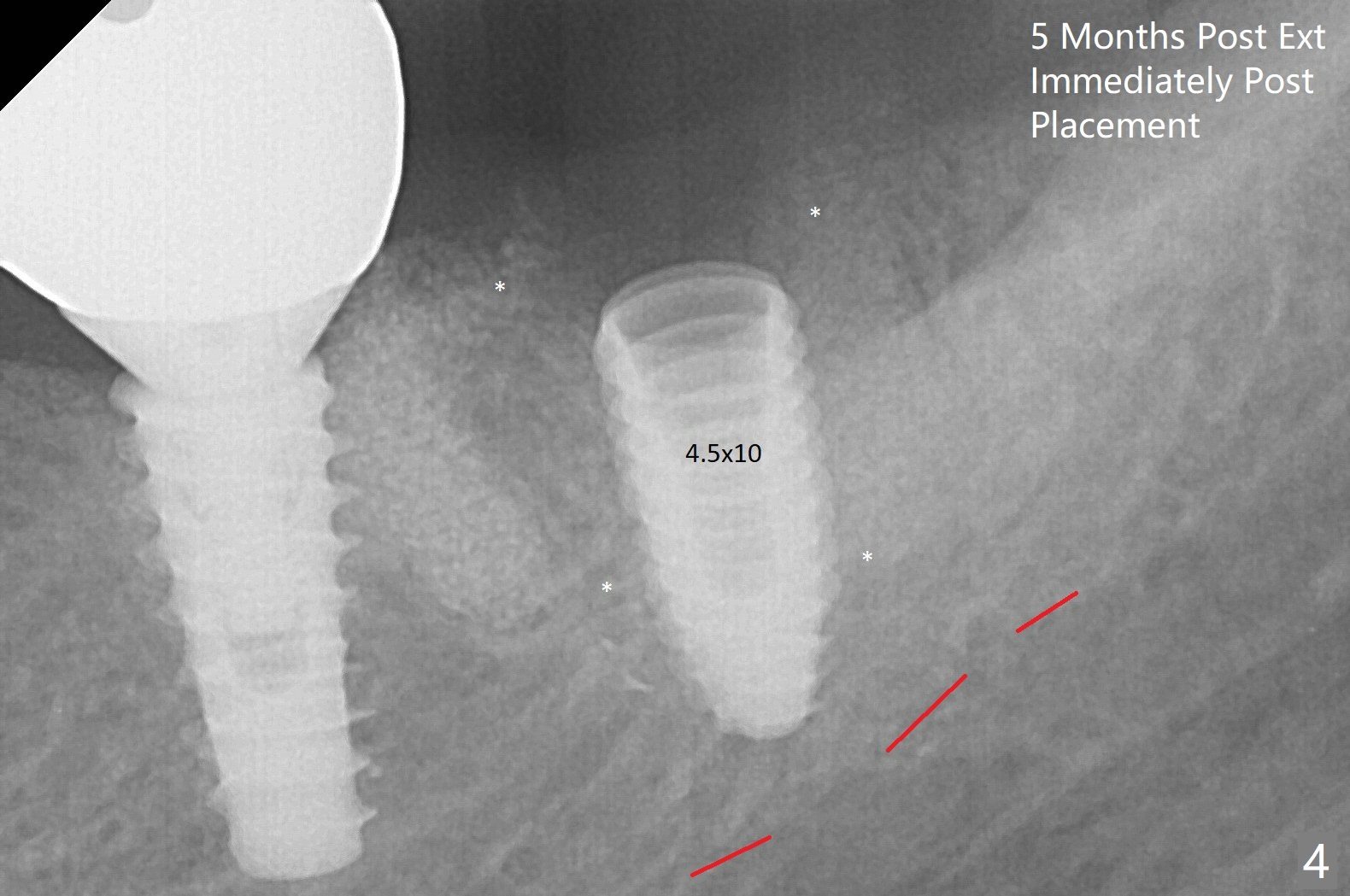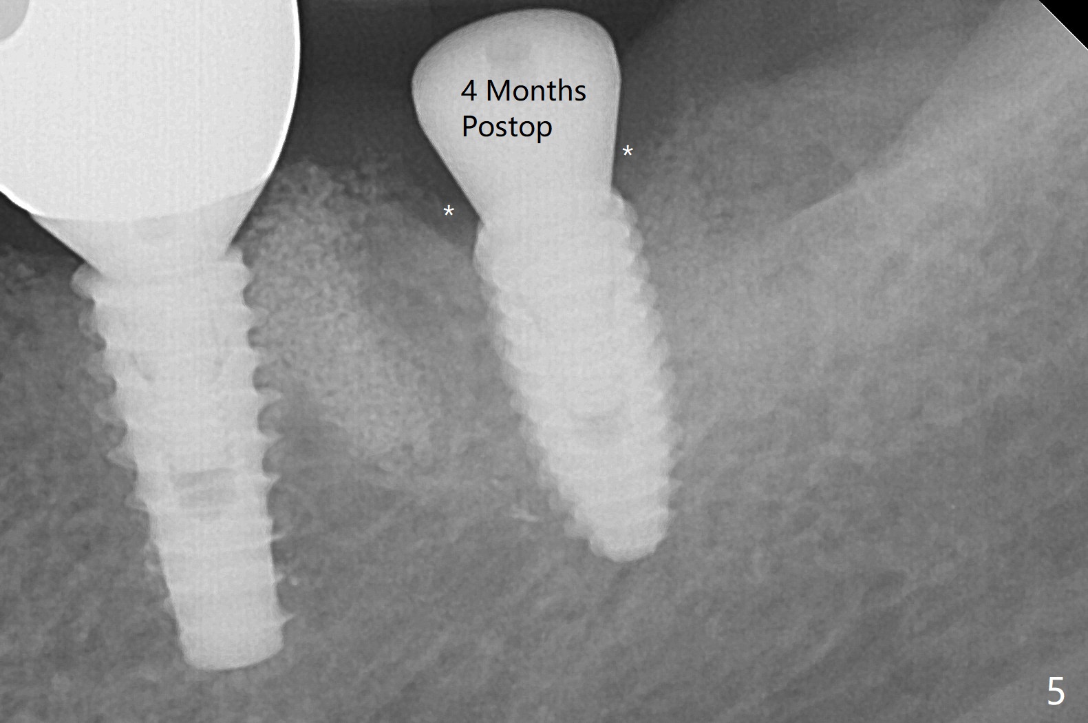 A 55-year-old woman is going to have implant placement at #18 using surgical guide 5 months post socket preservation (Fig.1). The bone density of initial osteotomy until 3.5x7.3 mm drill seems to be soft (Fig.1,2). Underprep is decided for the remaining osteotomy (Fig.3). The last drill is 3.5x10 for 4.5x10 mm implant (Fig.4). In fact initial insertion torque is >55 Ncm. The implant has to be backed up several times to get final torque ~ 35 Ncm. Retrospectively the bone density of the lower portion of the osteotomy is higher than that of the upper one (compare Fig.2,3). There is crestal bone (grafted one *) resorption 4 months postop (Fig.5).