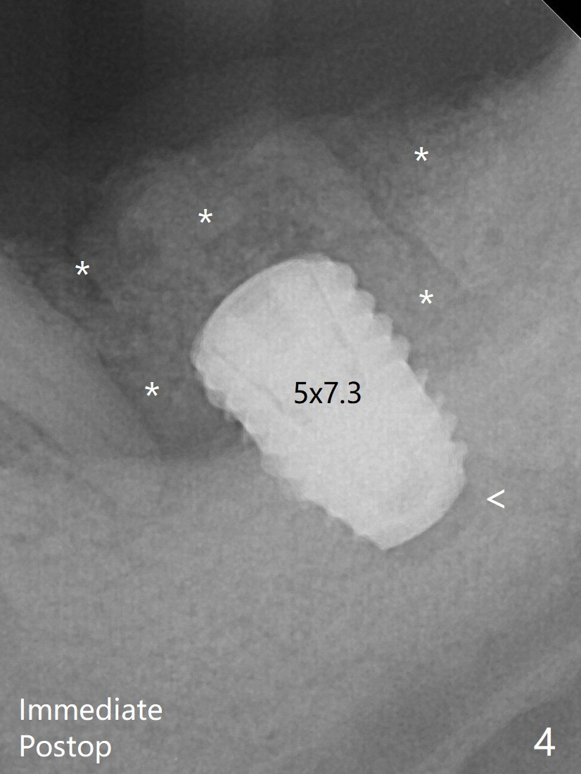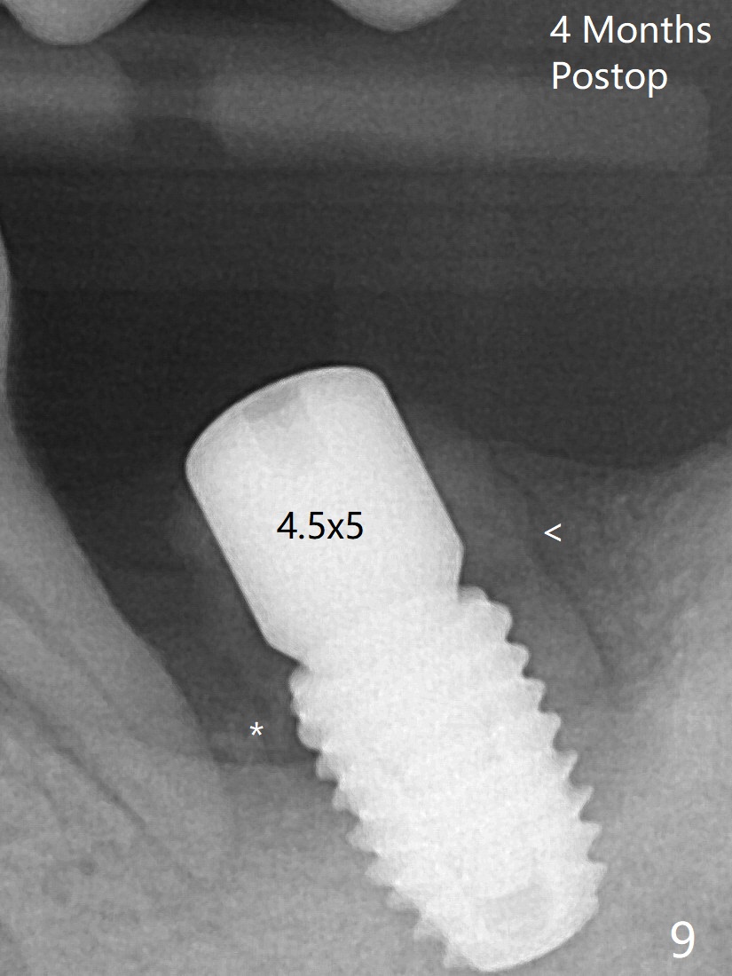 After implant removal, a 4.5x11.5 mm drill is used, but it cannot reach the depth due to high bone density. 800 RPM instead of 50 RPM may help. When the implant is reseated, it appears to be .5 mm deeper than before clinically, although it looks incompletely seated in X-ray (Fig.4 <). The insertion torque is 60 Ncm. Allograft mixed with PRF is placed around the implant with cover screw, particularly mesiolinguodistal (Fig.4 *). The majority of the bone graft is lost without immediate provisional in 4 months (Fig.9 * (<: socket shield)). Then a 5.5x5 mm healing abutment is inserted for impression next appointment.