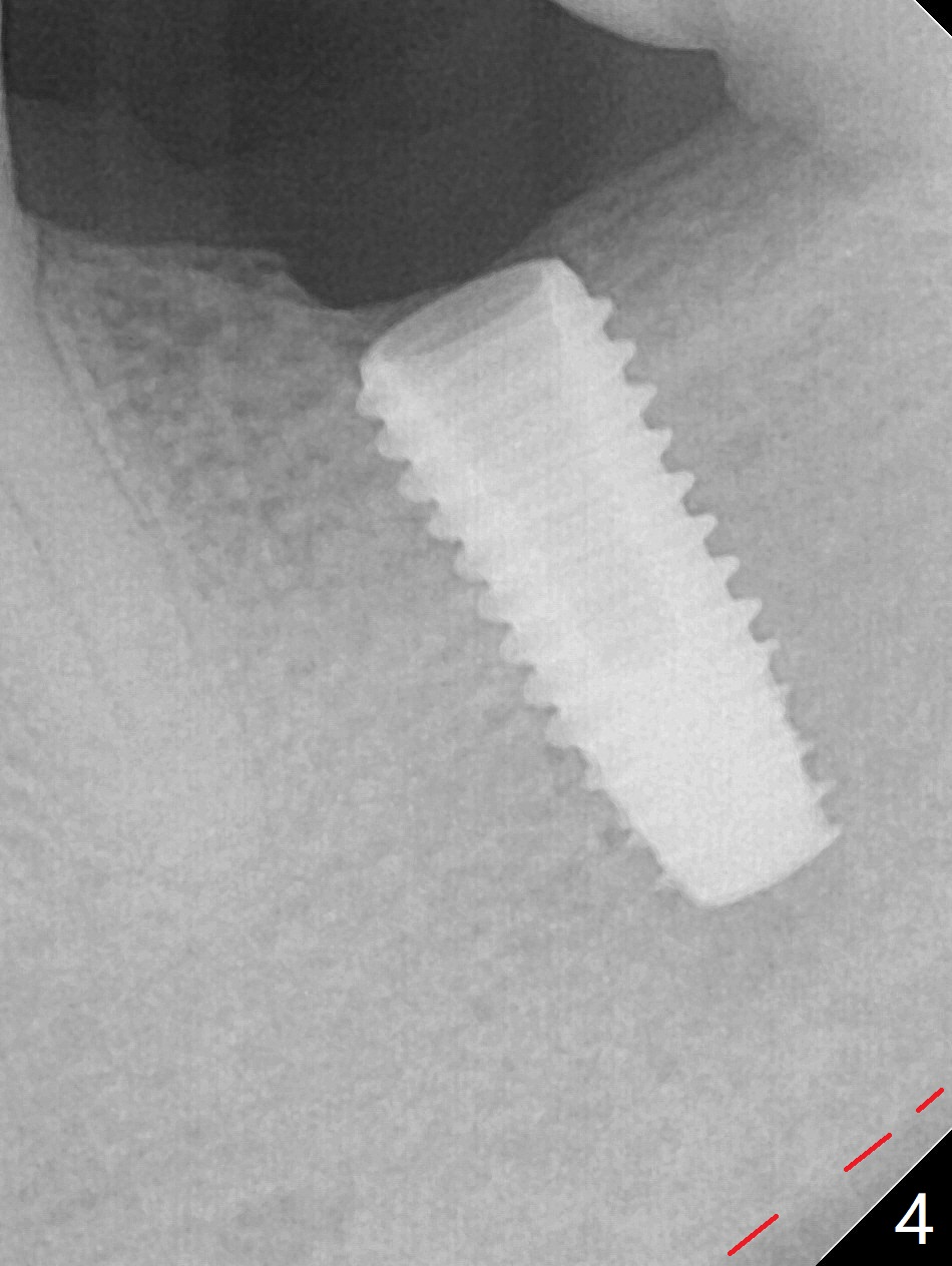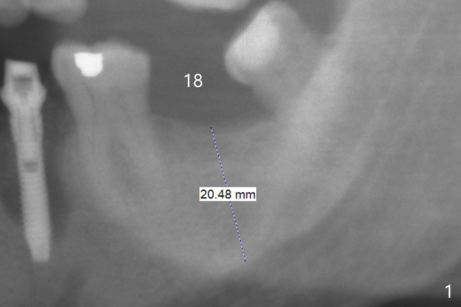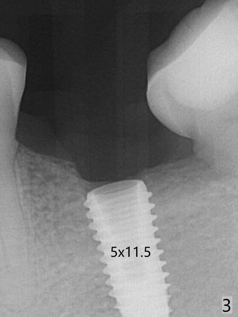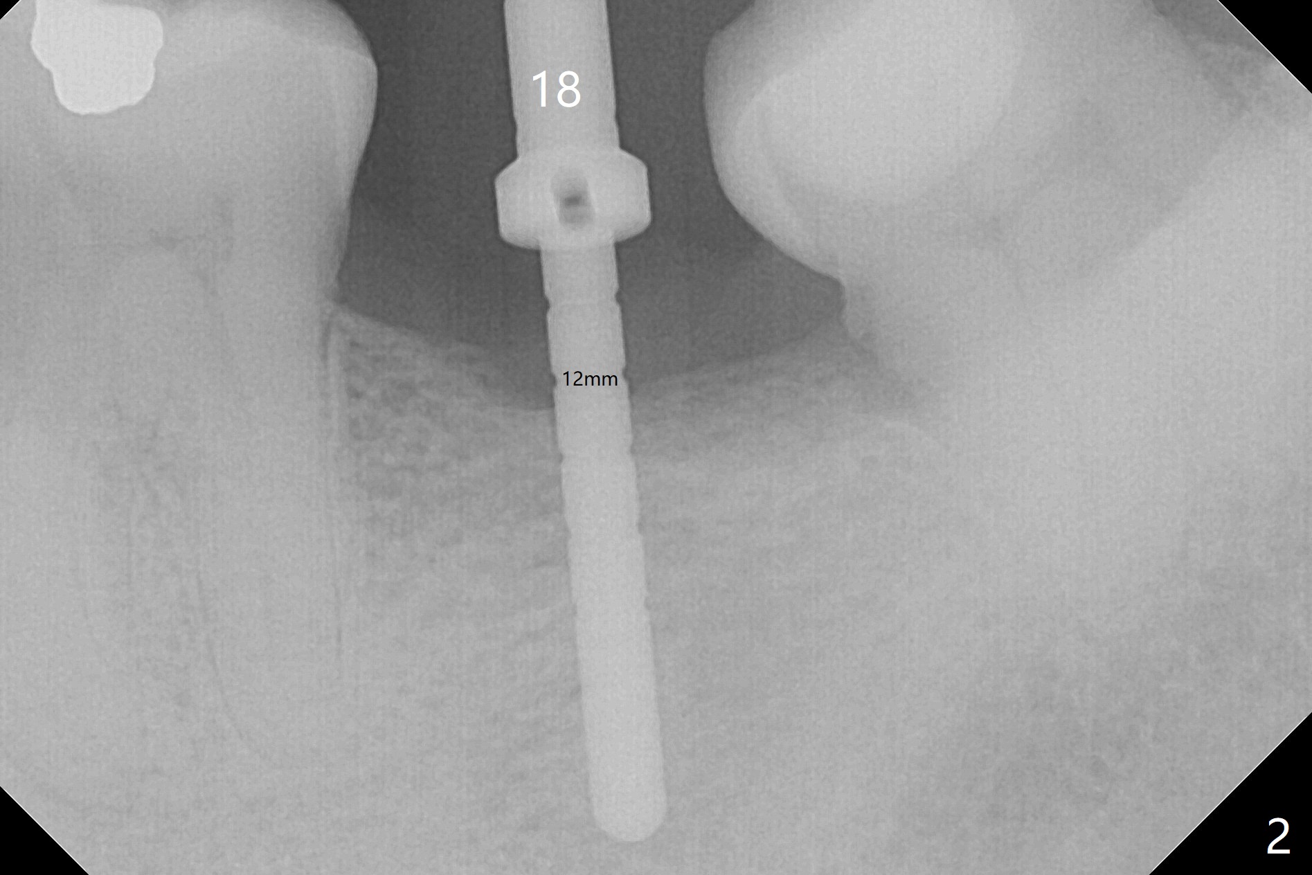 A 56-year-old man will return for #18 implant placement post 20, 14, and 29 ones. Considering postop bone loss associated with delayed implant, an implant (13 or 15 mm long) at #18 is to be placed subcrestal (Fig.1 (pan taken when the implant was placed at #20)).