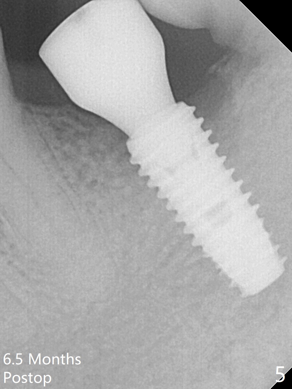 It is difficult to identify the Inferior Alveolar Canal when the initial osteotomy depth is 11.5 mm (Fig.2). Following sequential osteotomy (last drills 4.5x11.5 and 4x13 mm), a 5x11.5 mm implant is placed with >50 Ncm (Fig.3,4). Later the implant is placed .5 mm deeper with placement of a 6.5x4(4) mm abutment and autogenous bone lingually, in which ~.5 mm implant is uncovered. There is mild bone loss distal 6.5 months postop (Fig.5). Before cementation, the crown at #29 becomes loose. The abutment screw needs retightening 6 months post cementation. Six months post retightening, the abutment screw is loose at #14.