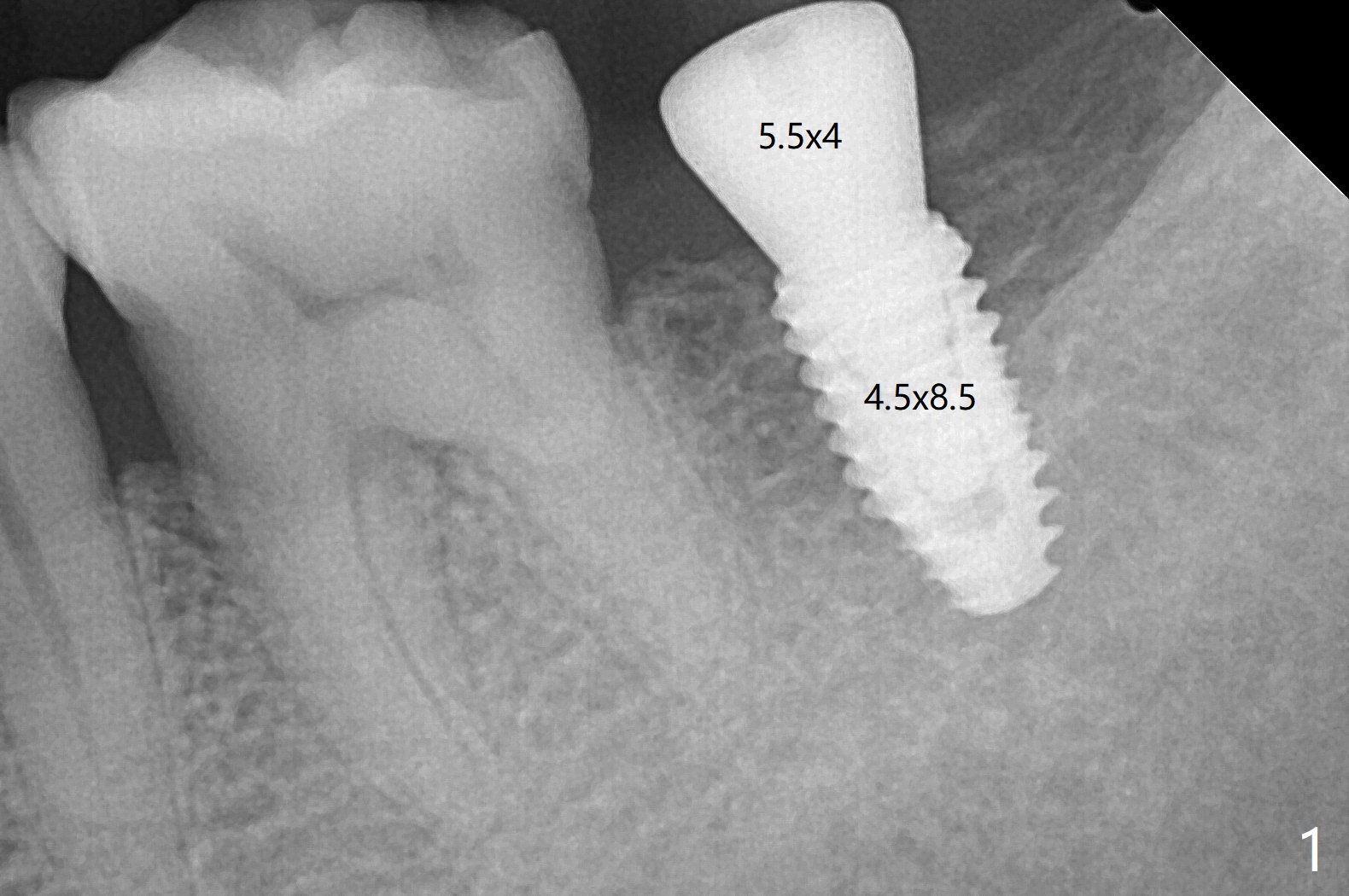 在第二磨牙种植,尤其是男子,咀嚼肌特别发达,为了把钻头放置于导板金属圈(10.5毫米offset),需要磨低对合牙牙尖。如果使用9毫米offset,植体位置方向欠缺些,钻洞就方便些。
