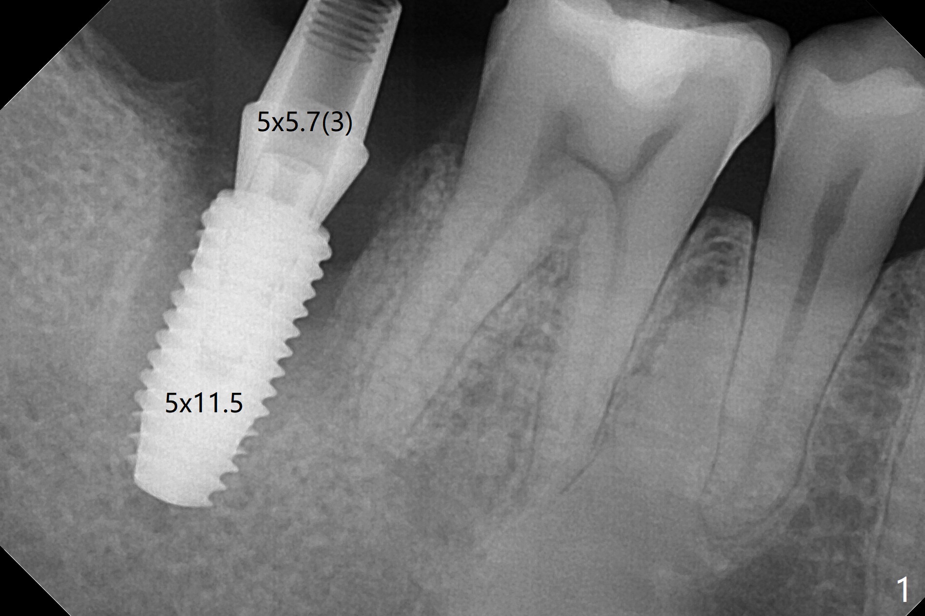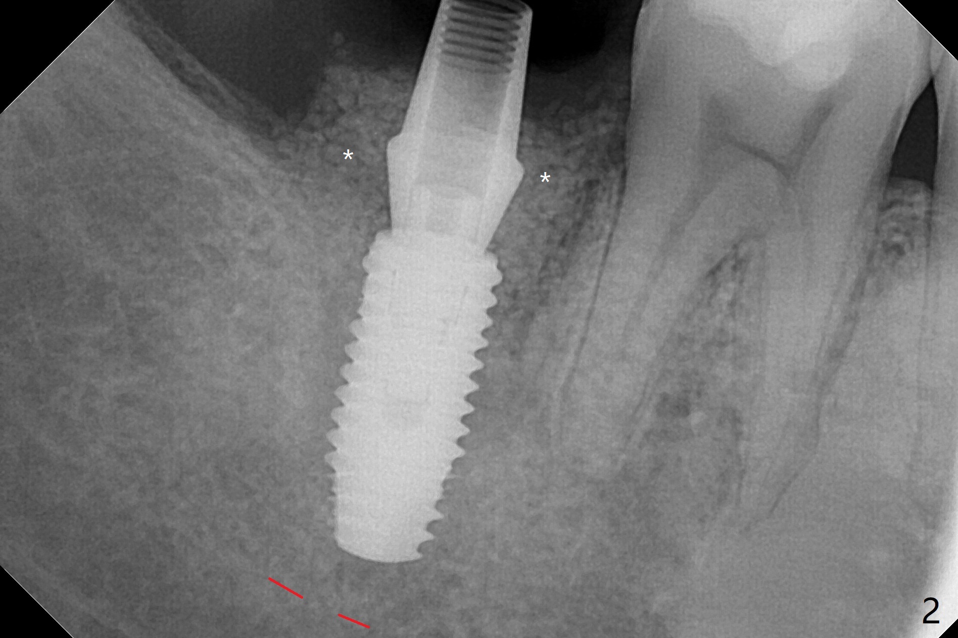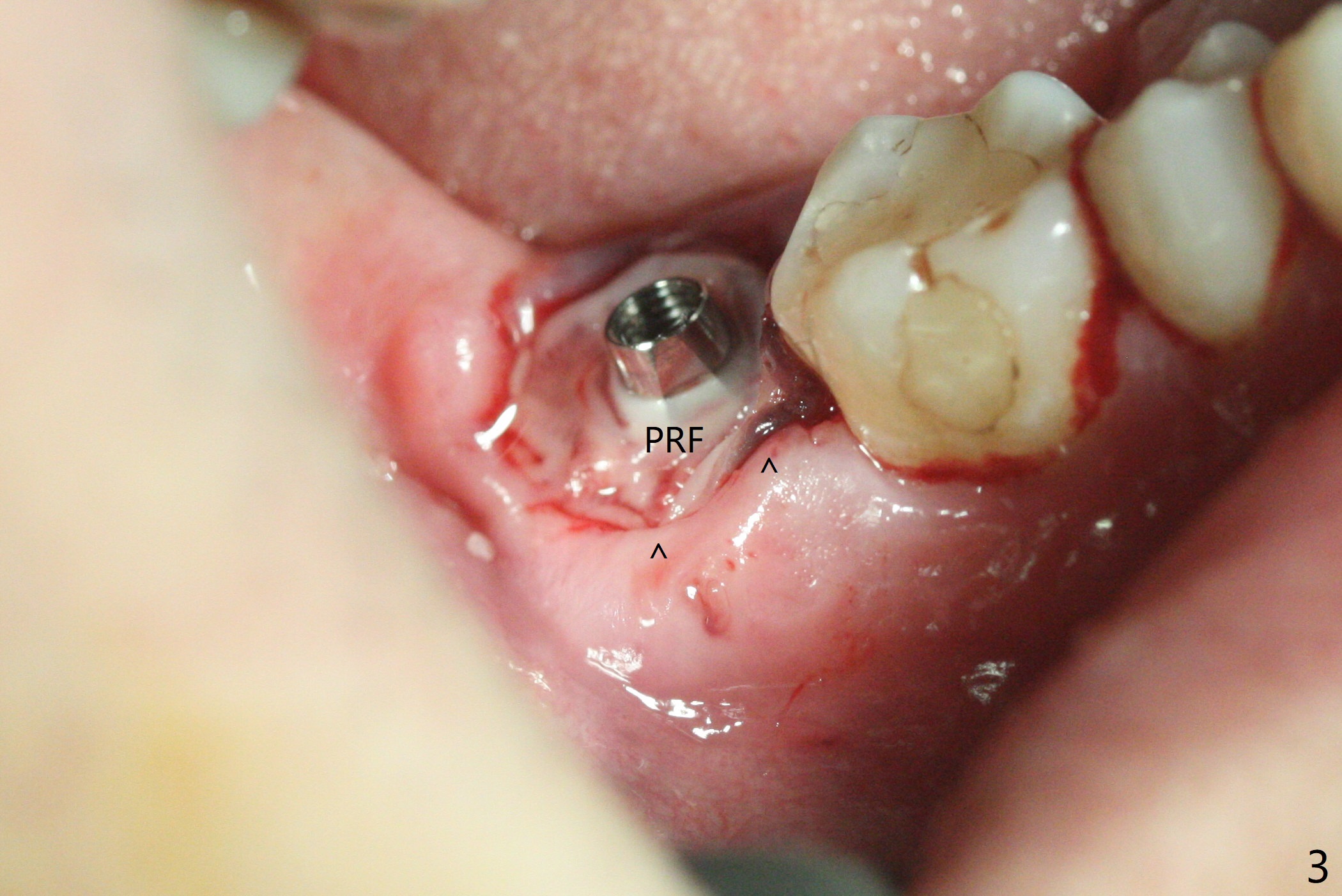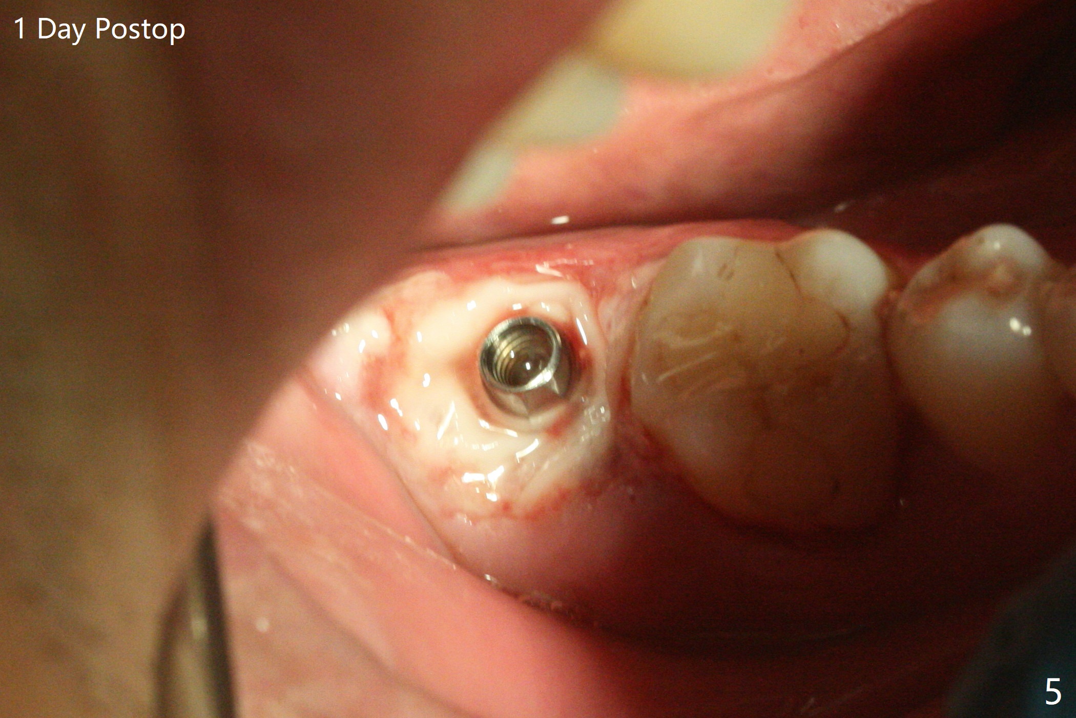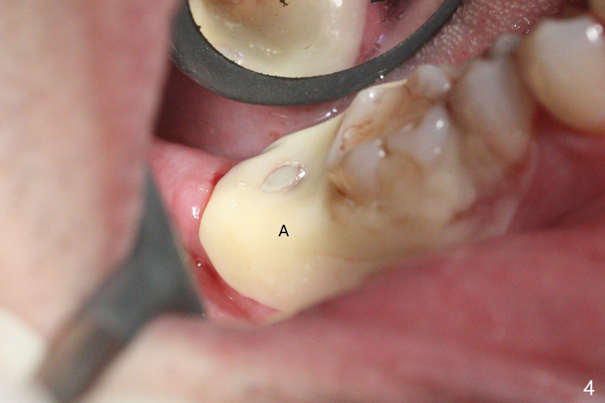 右下七5x11.5毫米植体导板植入根尖骨质大约2-3毫米(图一),扭力~50 Ncm,即使发生骨坏死,不会产生植体周围炎,最坏植体松动脱落。放置基台后,植入大量粘性骨粉(图二:*),覆盖PRF(图三);如果使用临时牙冠关闭牙槽窝,牙冠与龈缘(箭头)接触不紧,使用水牙线冲洗,骨粉流失严重。所以采纳树脂敷料(图四:A),后者边缘至少覆盖牙槽窝口1-2毫米,一周复查,及时关闭术后牙龈退缩所造成的漏洞。其实病人术后第二天回来,敷料脱落,理由:远中无牙,基台短(图五)。Return to Prevent Molar Periimplantitis (Protocols, Table) Protect Graft Torque 第一磨牙即种 Xin Wei, DDS, PhD, MS 1st edition 04/27/2021, last revision 04/29/2021