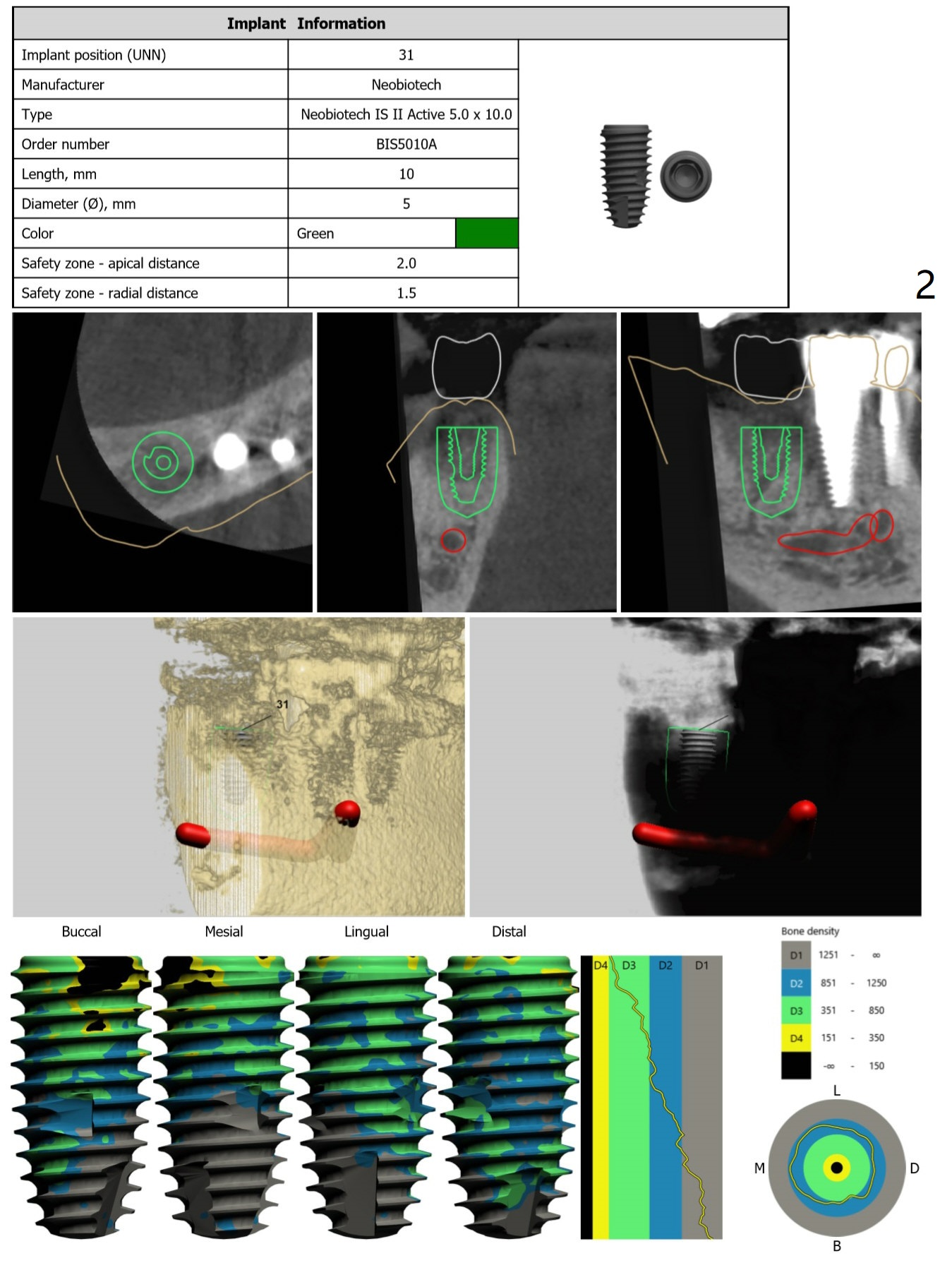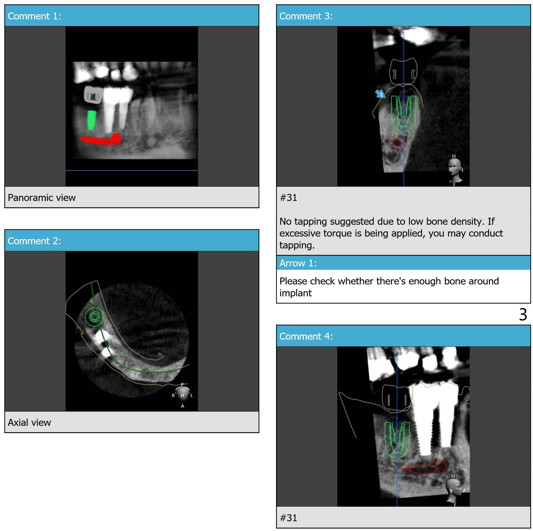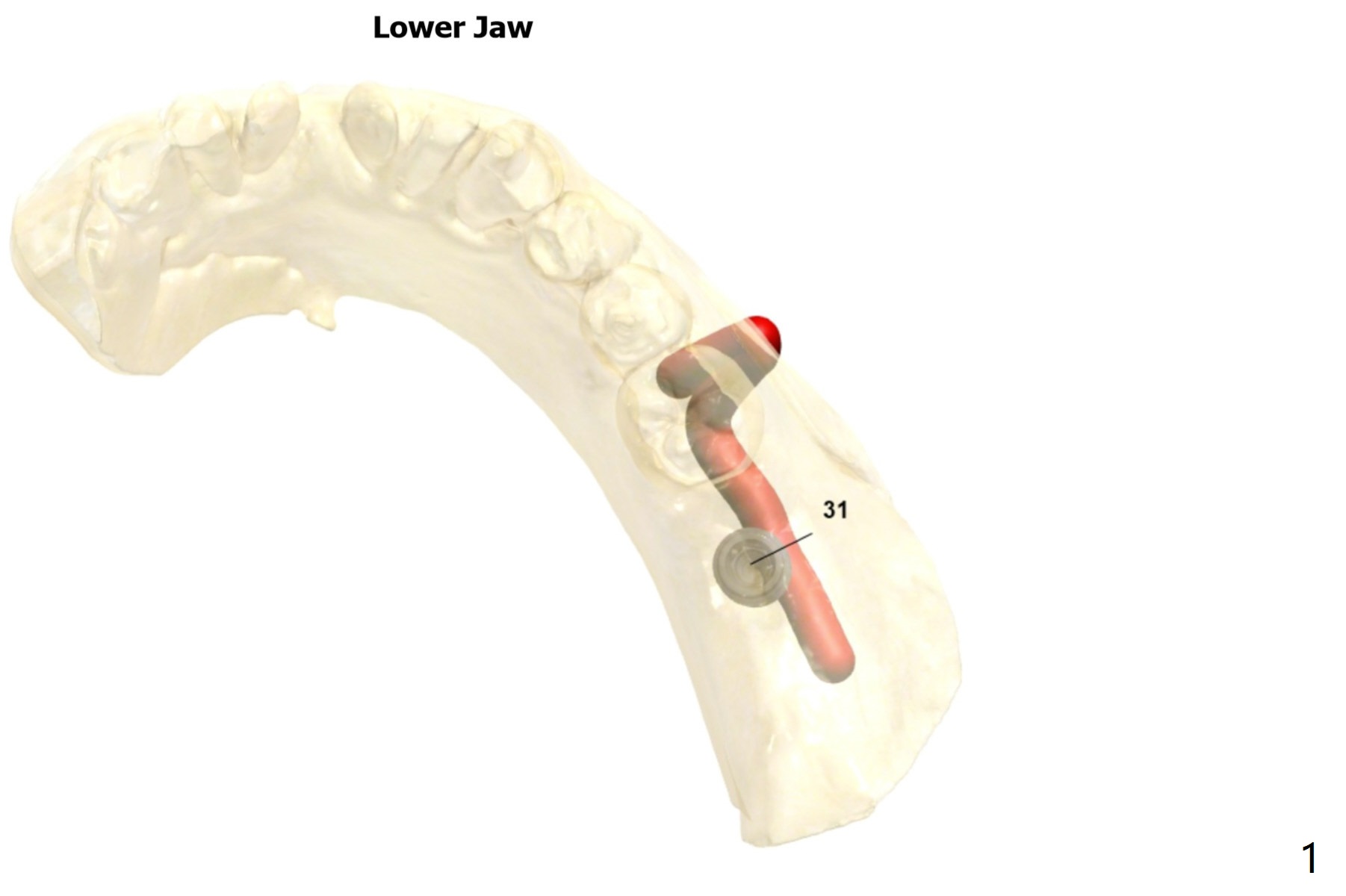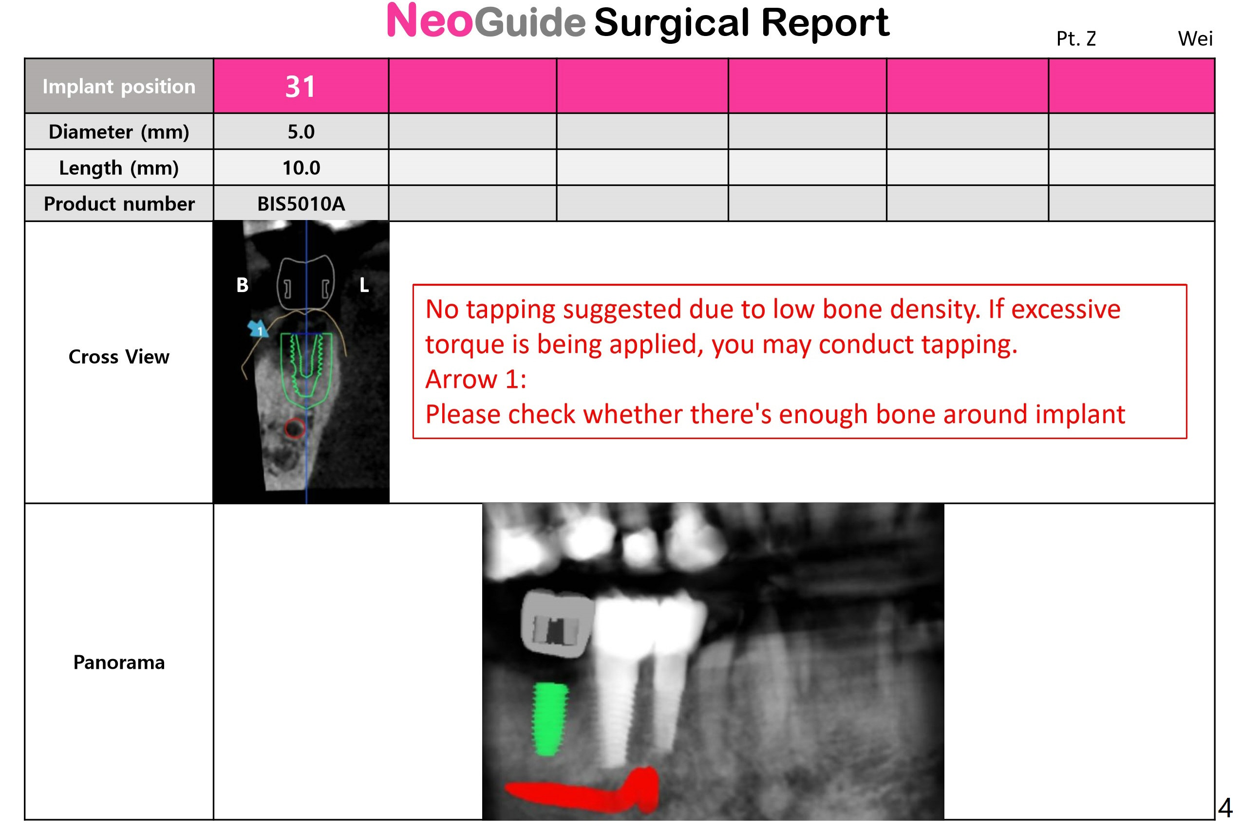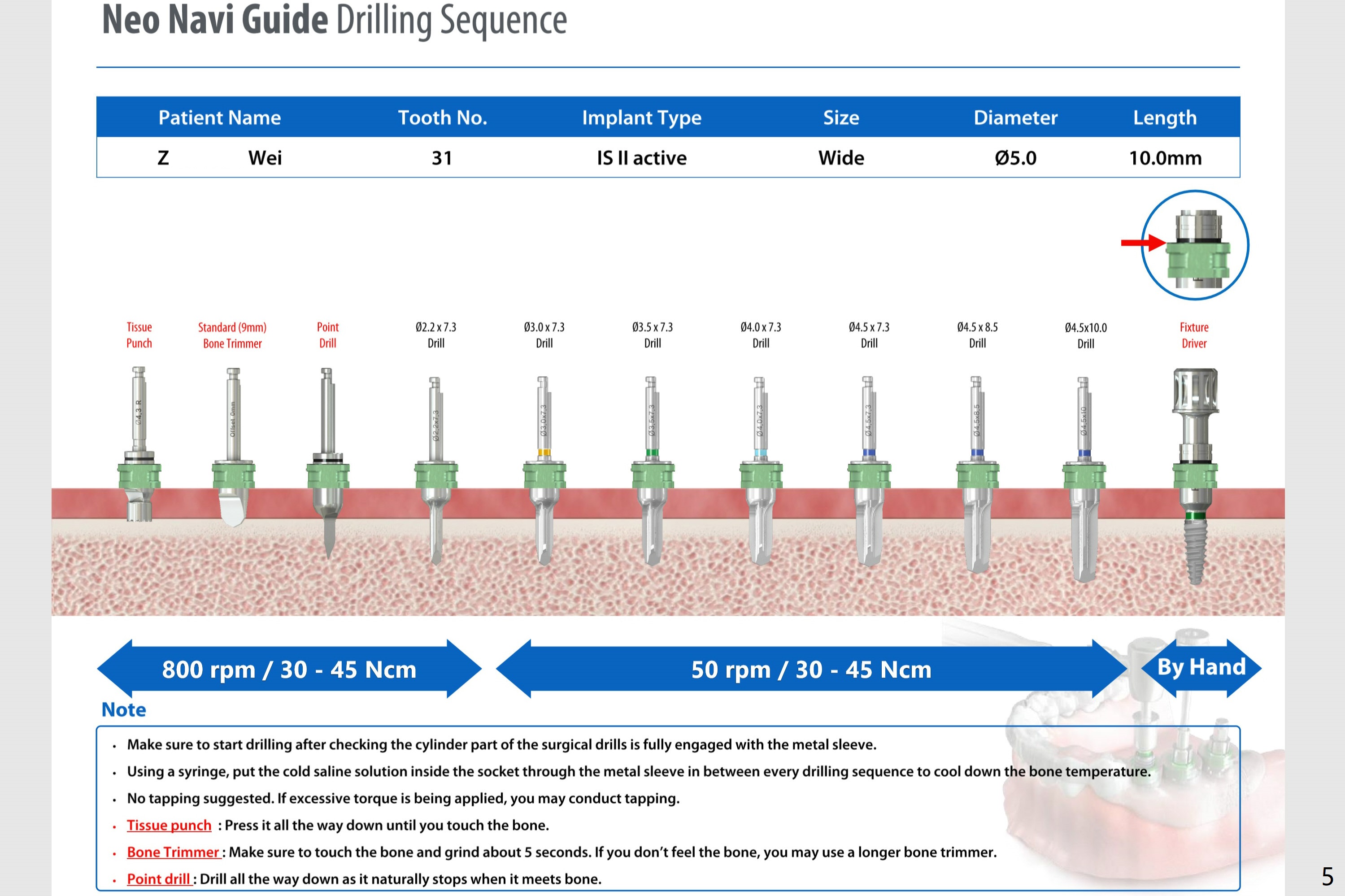 Guided surgery will be scheduled 6 months post socket preservation at #31 (Fig.1). The bone density is low buccal to the recipient site (Fig.2). Either bone expansion should be done prior to implant placement or bone graft is needed post placement (Fig.3). Use Implant Cassette and #15 may be utilized to check whether bone graft is needed. Before soak the guide, check it against the lower model to see whether acrylic clearance is necessary for bone expansion. After 2.2x7.3 mm drill, use 2.2x8.5 and 2.2x10 mm ones (Fig.5). Switch to #2 bone expander (1.3/2.3 mm) and take PA to confirm the depth. Measure the length of the last drill and #2 expander beforehand. Continue bone expanders until #5 (3.0/4.4 mm). Expect less depth as the # of expanders increases.