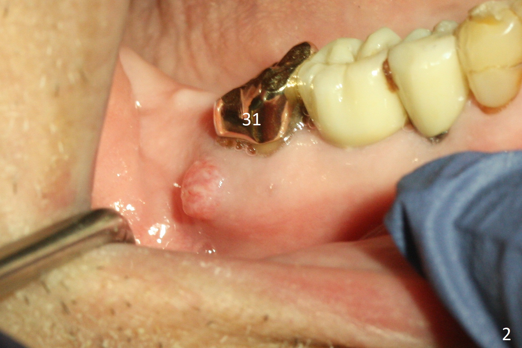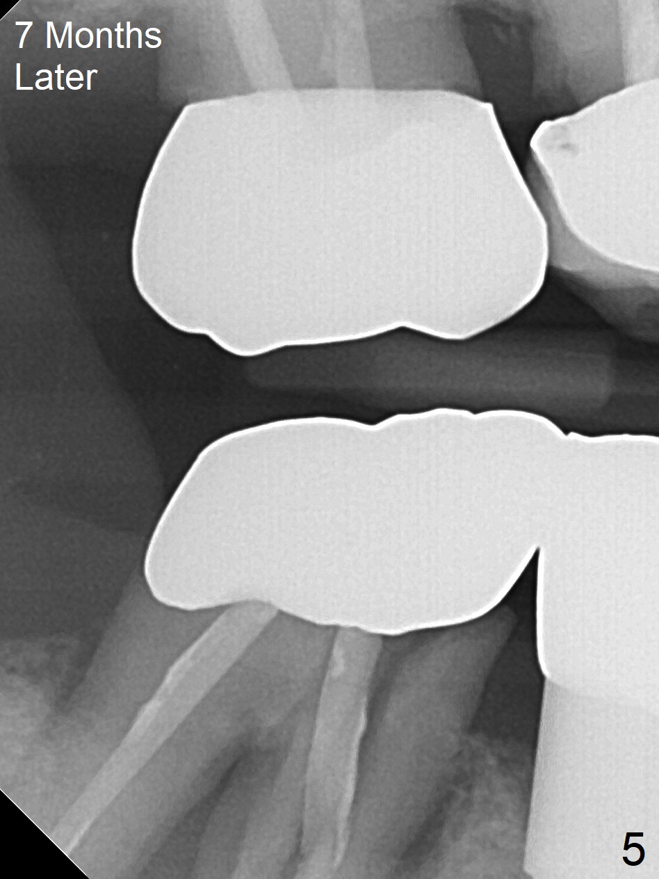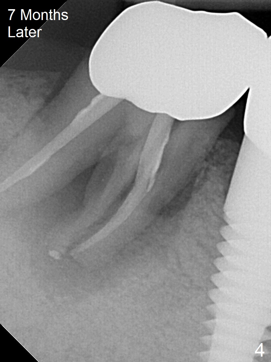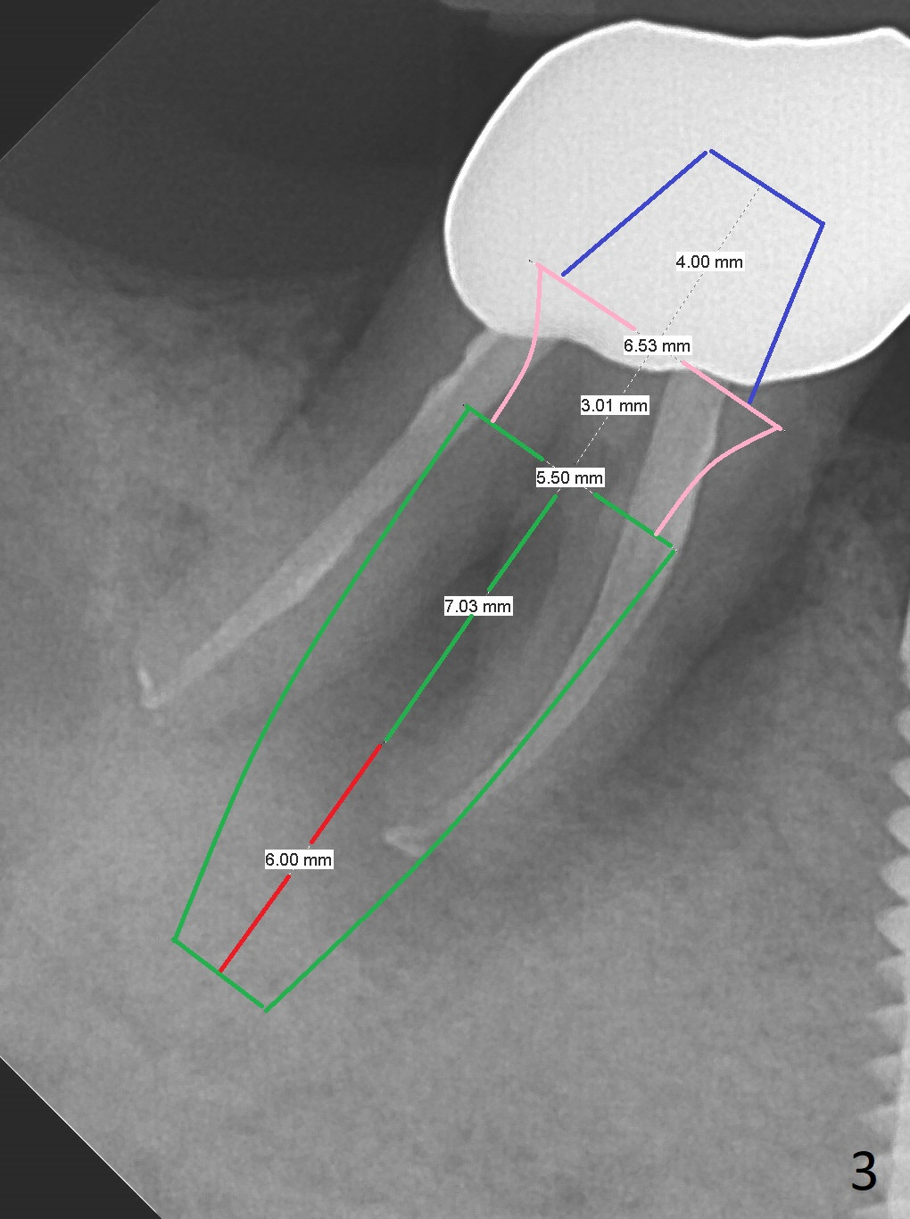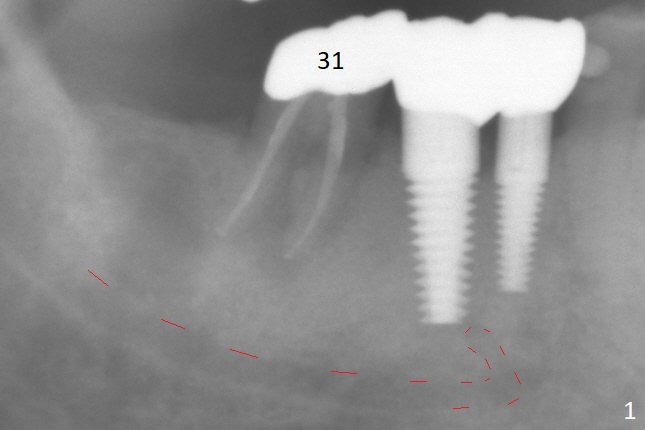 A 87-year-old man was asymptomatic with the tooth #31 eight months earlier (Fig.1), as compared to now (Fig.2). After extraction, osteotomy will be initiated in the septum (where there is more bone height) using IS 6 mm stopper (Fig.3 red line), followed by PA. If PA does not show the Inferior Alveolar Canal (Fig.1 red dashed line), take panoramic X-ray. A 5.5x13 mm implant will be placed (7 mm may not be covered by the native bone). The mesial root vertical root fracture is more obvious 7 months later (Fig.4,5).