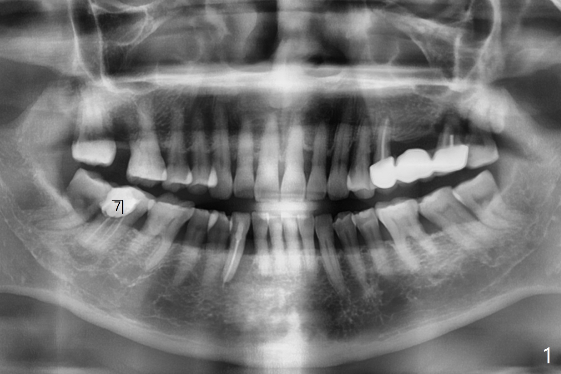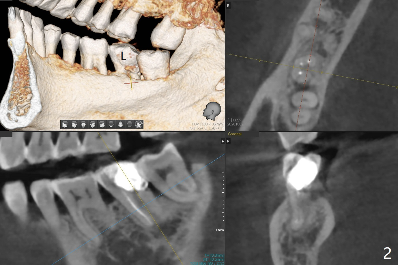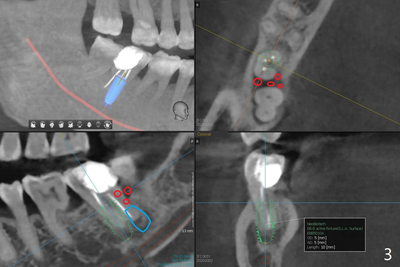 65岁女右下7远中舌侧龈下龋坏(图一,二),远中骨质吸收严重,植体应植入近中窝(图三:绿色),远中窝根部放置胶原塞(蓝色),冠部粘性骨粉(红色)。洁治邻牙,智齿近中面涂Endogain。