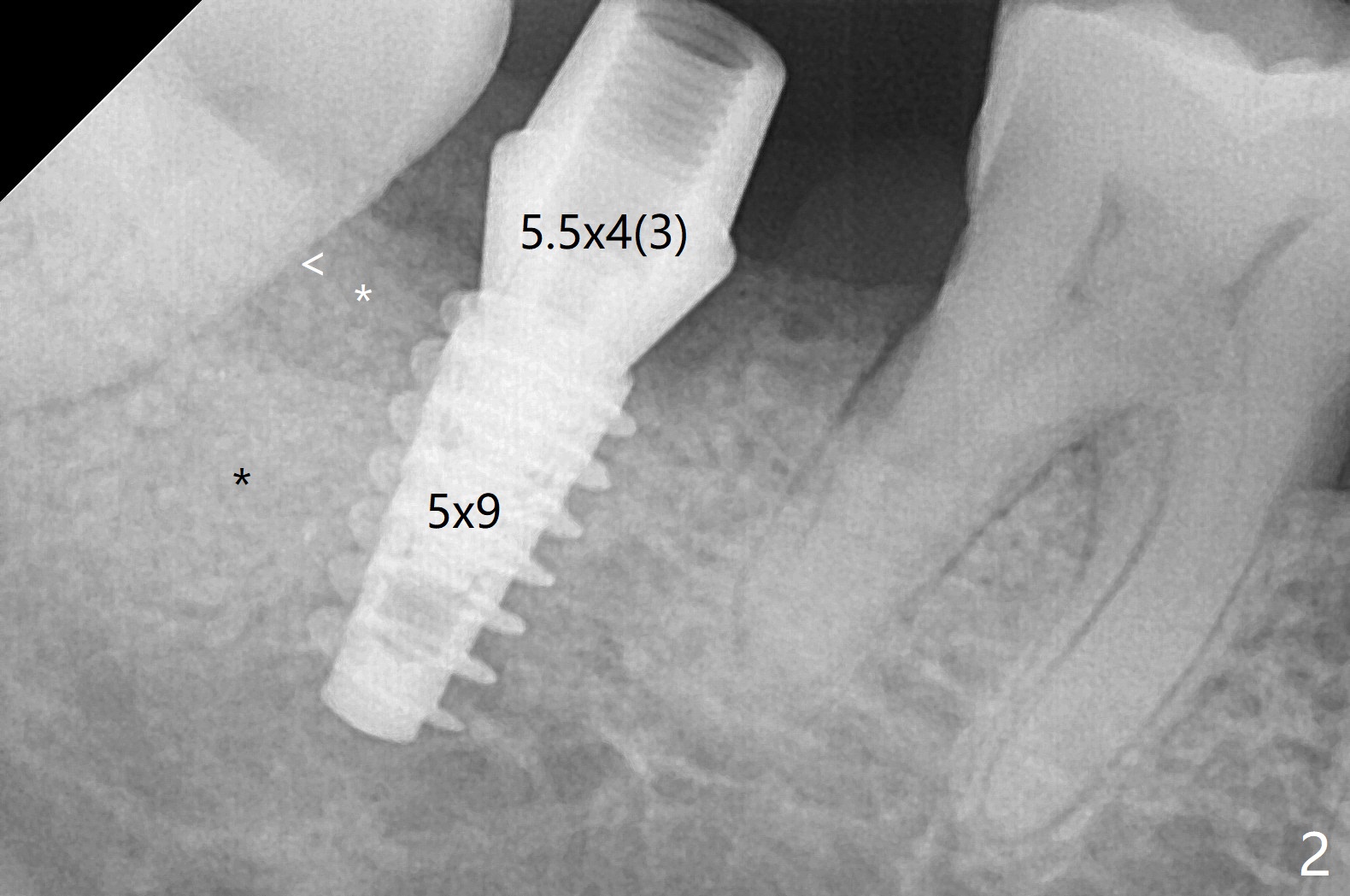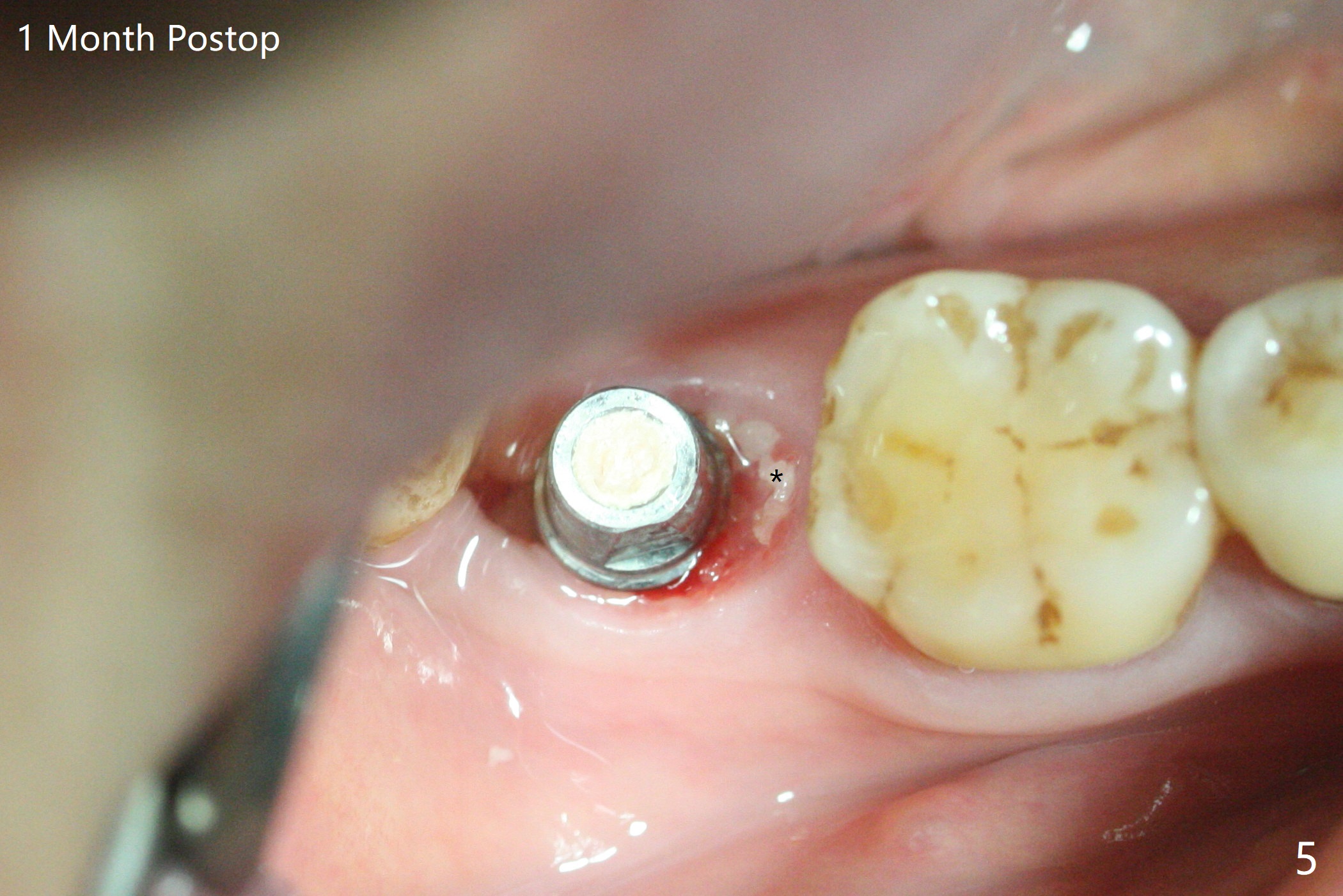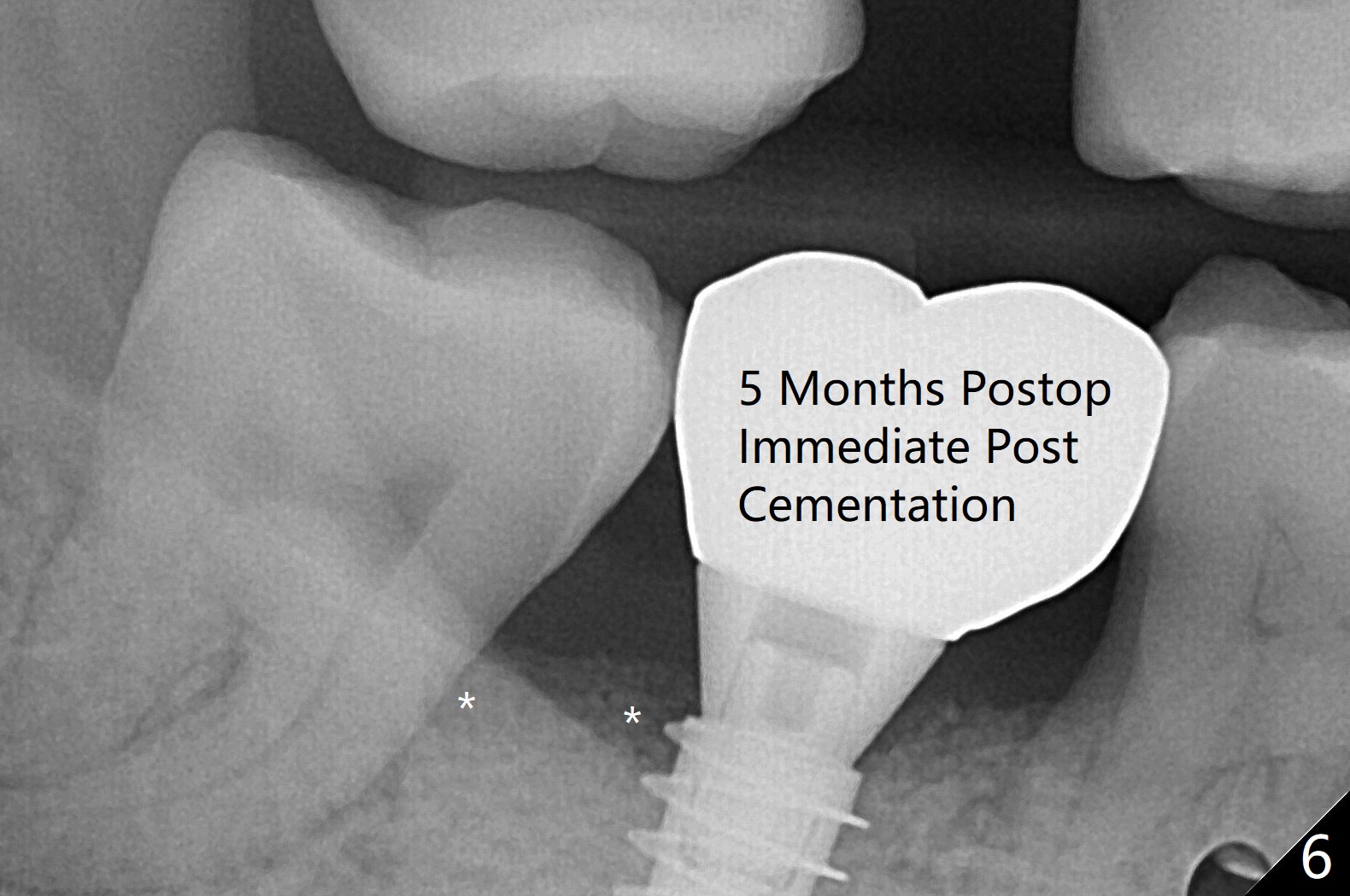右下7有两个融合牙根,很长,起初(拔除后)有点害怕初步稳定性,使用导板完成近中窝4x10毫米钻洞后,植入4.5x10毫米报废植体,当时没有发觉植体已经发生远中偏移(图一:箭头,因为近中牙槽嵴高(*),而中隔缺失)。当正式植体植入后(图二),病人发现偏移,术者觉得临床上还可以,以为可能因为X光拍摄角度问题。再次放入粘性骨粉后,咬翼片拍摄注意角度问题,但是偏移仍存在(图三)。为了防止偏移现象,要么设计时有意往阻力大的地方偏移少许(例如这个病例1毫米,图四),要么发现偏移后,有意使用侧方切割钻头(Lindamann bur)去除阻力(近中骨)。如果扭力低,包埋植体。术后一个月取出临时牙冠,骨粉仿佛成为牙龈一部分(图五:*),之后暂时粘固粉固定牙冠。术后五个月骨粉好像与邻牙牙根和植体愈合(图六:*)。永久性粘固后,基台螺丝拧紧20Ncm。