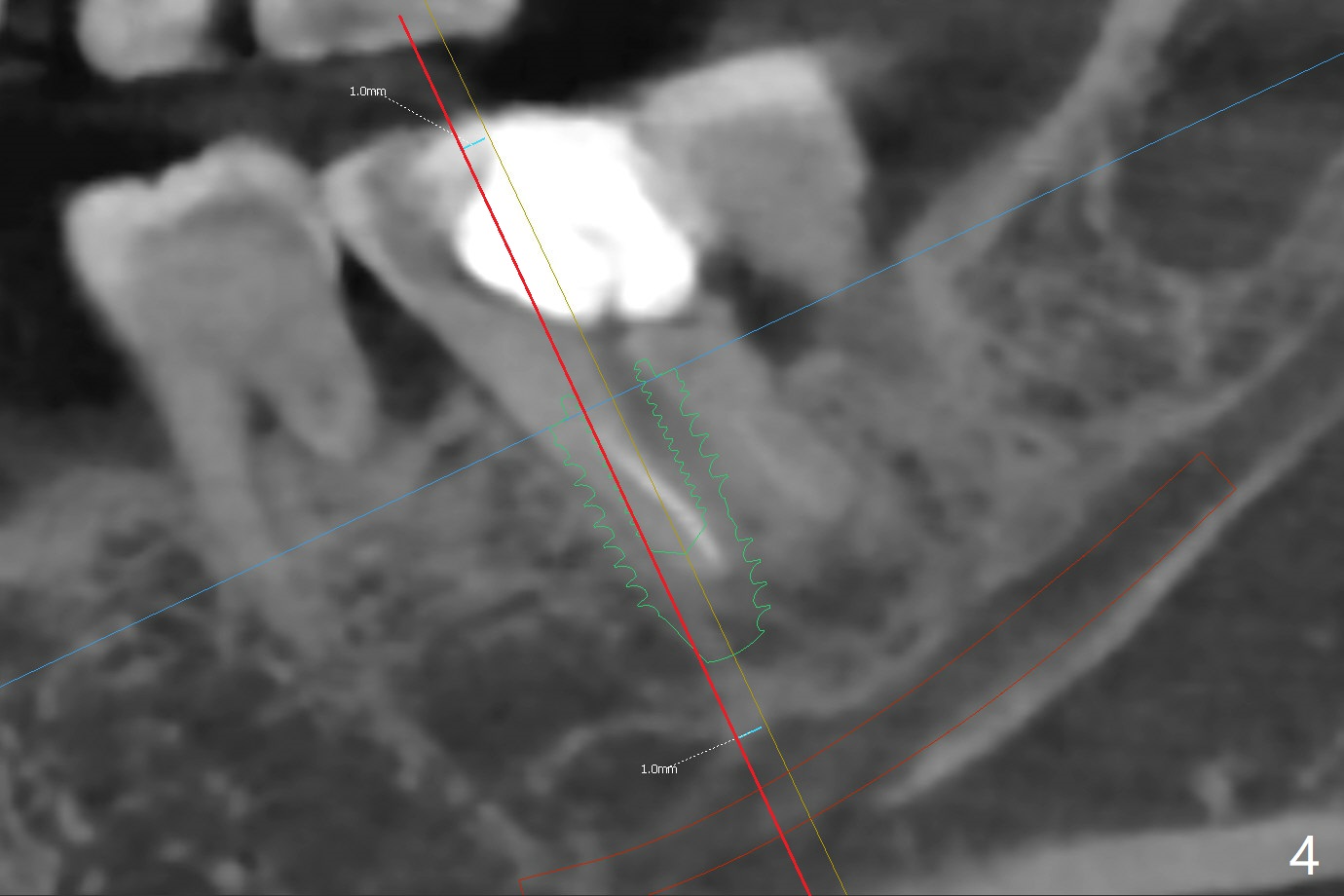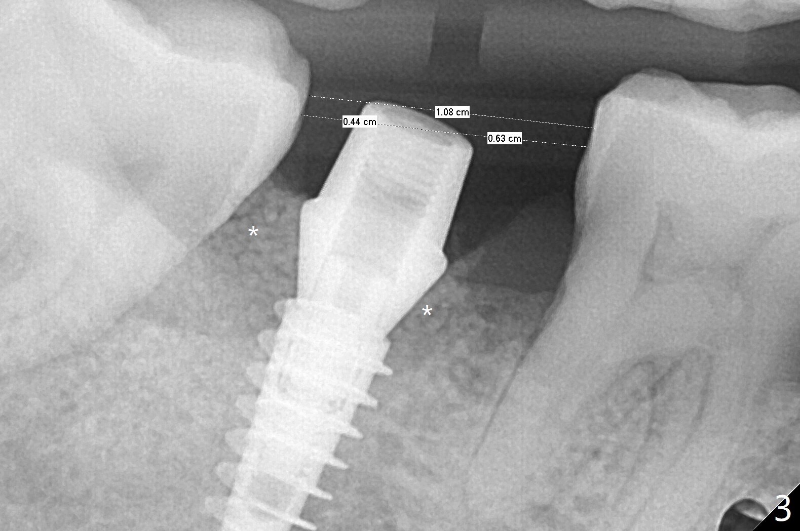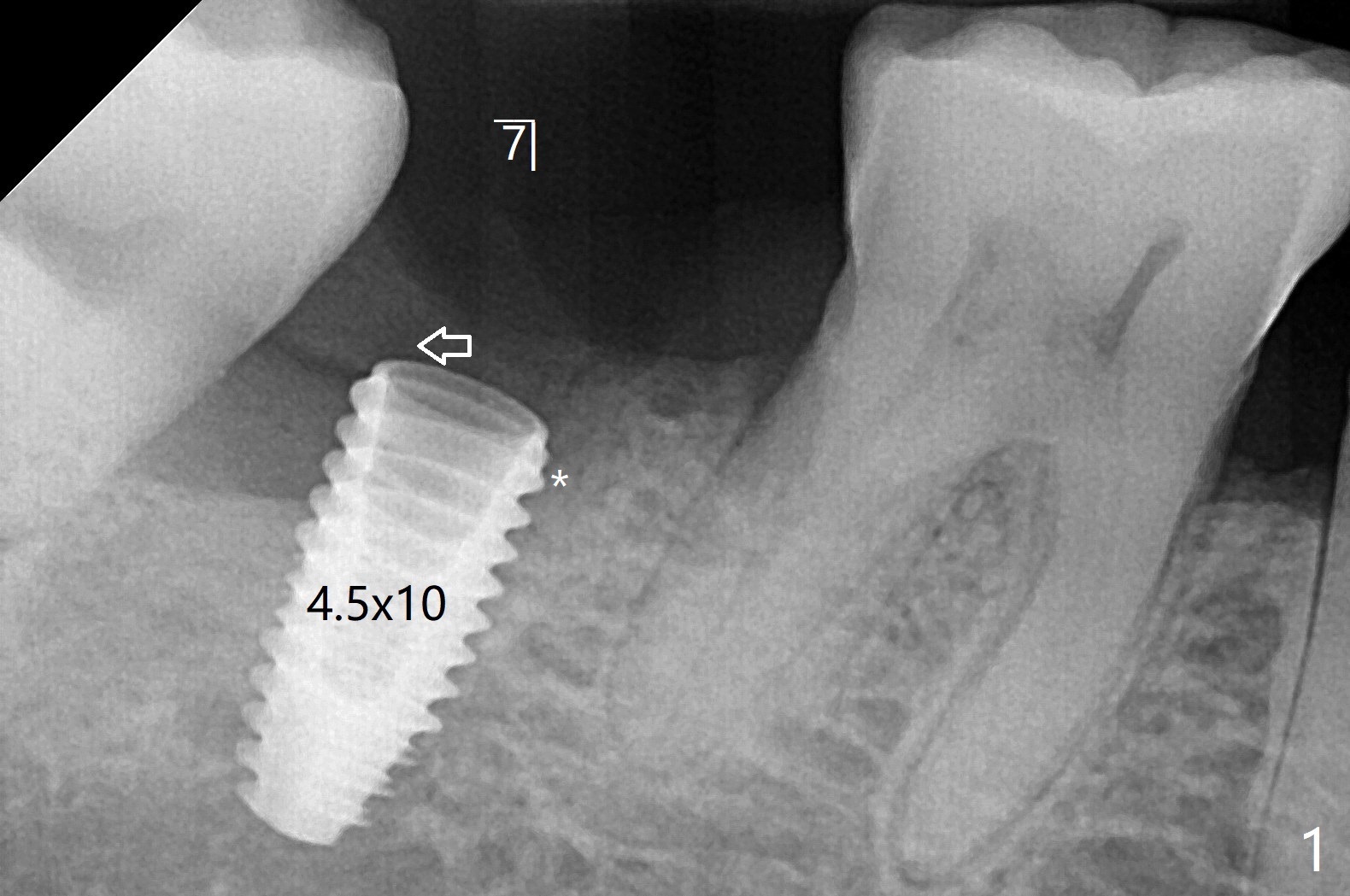 右下7有两个融合牙根,很长,起初(拔除后)有点害怕初步稳定性,使用导板完成近中窝4x10毫米钻洞后,植入4.5x10毫米报废植体,当时没有发觉植体已经发生远中偏移(图一:箭头,因为近中牙槽嵴高(*),而中隔缺失)。当正式植体植入后(图二),病人发现偏移,术者觉得临床上还可以,以为可能因为X光拍摄角度问题。再次放入粘性骨粉后,咬翼片拍摄注意角度问题,但是偏移仍存在(图三)。为了防止偏移现象,要么设计时有意往阻力大的地方偏移少许(例如这个病例1毫米,图四),要么发现偏移后,有意使用侧方切割钻头(Lindamann bur)去除阻力(近中骨)。如果扭力低,包埋植体。术后一个月取出临时牙冠,骨粉仿佛成为牙龈一部分(图五:*),之后暂时粘固粉固定牙冠。术后五个月骨粉好像与邻牙牙根和植体愈合(图六:*)。永久性粘固后,基台螺丝拧紧20Ncm。