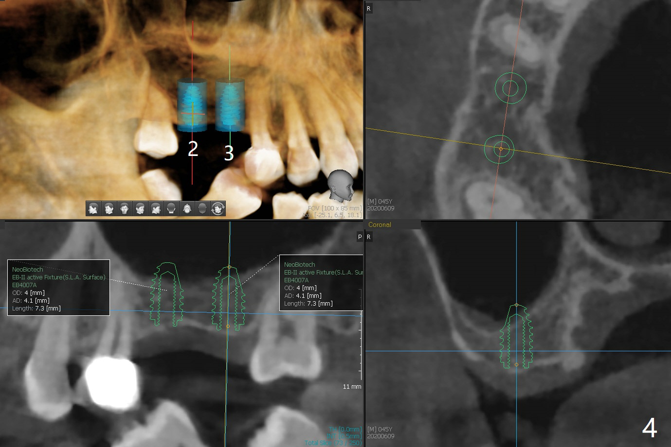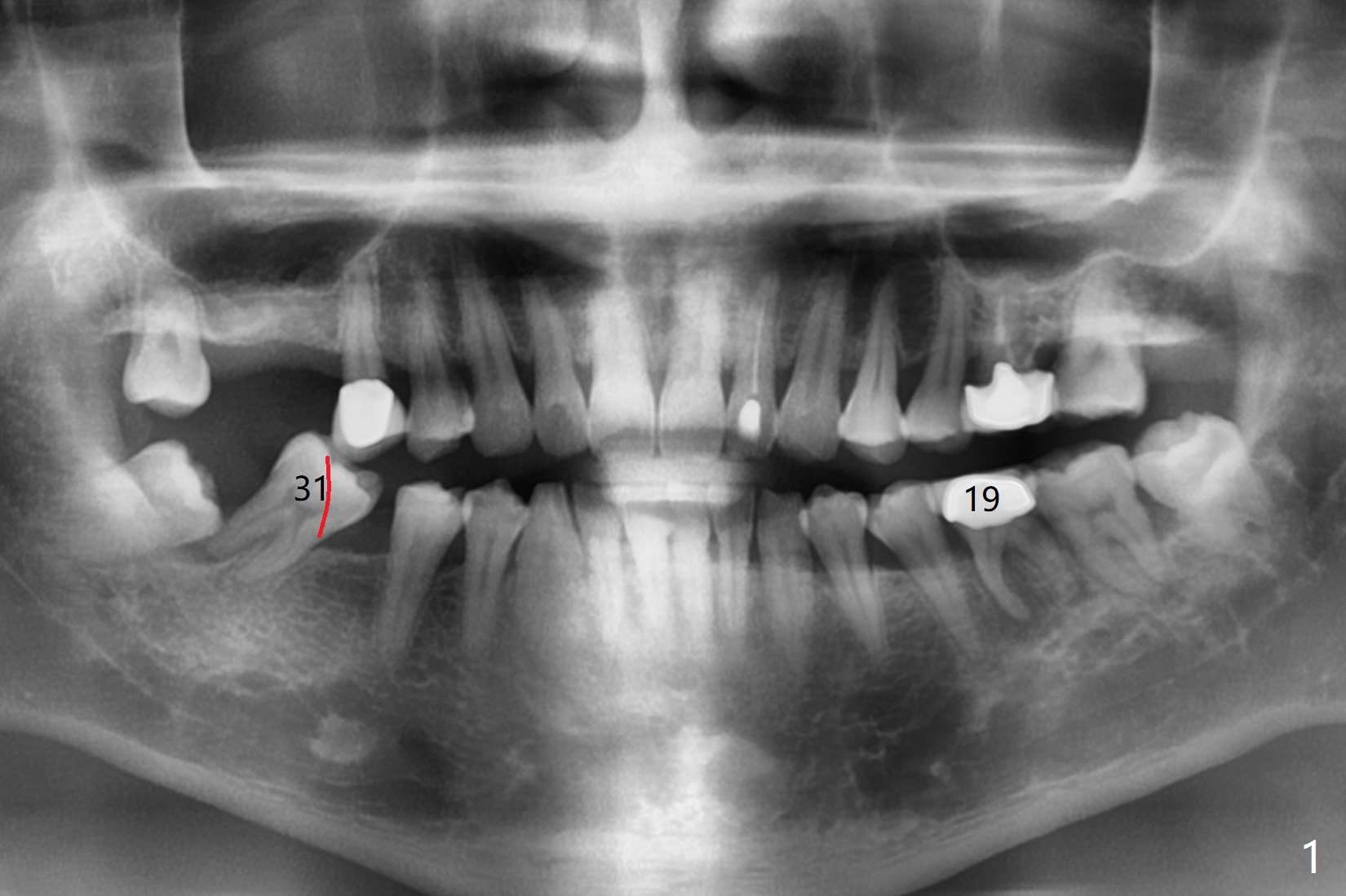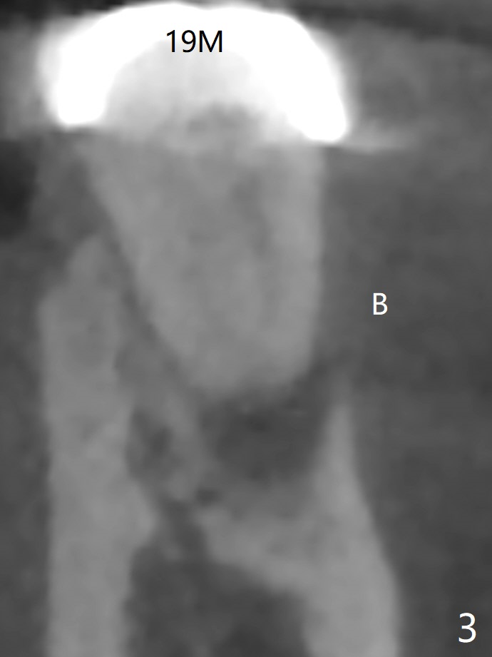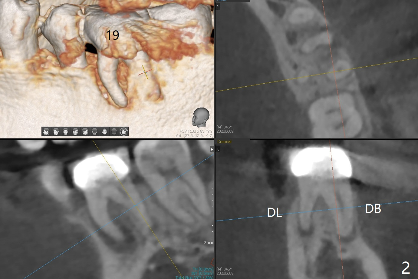 A 45-year-old man requests extraction of #19 because of endodontist's diagnosis of root fracture (Fig.1). CT shows typical apical periodontitis (Fig.2) without sign of root fracture (profilogram, data not shown), although the buccal plate of the mesial root is lost (Fig.3). Ideally 2 implants should be placed in UR and LR quadrants to prevent #19 root fracture after RCT (Fig.4). Alternative way is to place an implant at #3 (5x7.3 mm) and #30 immediately after #31 extraction. In fact a surgical guide for #30 will be fabricated resting the distal aspect of the tilted tooth #31 after sectioning the mesial portion in the lab (Fig.1 red line).