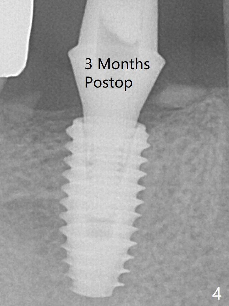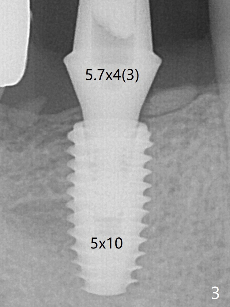 The 5x10 mm implant placed with guide has good trajectory and depth in a timely manner (Fig.3). Since the patient is a heavy bruxer with dislodgement of #30 provisional and #19 abutment screw loosening, a 5.7x4(3) mm cementation abutment is placed immediately so that a splinted provisional is fabricated for #30 and 31 for better retention. However, the gingiva around the implant at #31 is unhealthy 3 months postop (Fig.4). After impression, the provisional at #31 is sectioned without recementation for better oral hygiene.